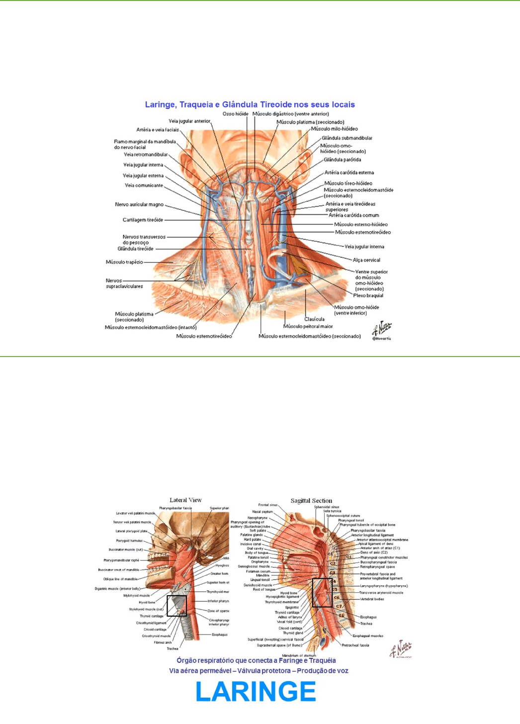 LARINGE, TRAQUEIA E TIREOIDE · São as demais vísceras do pescoço-> ocupam a linha mediana do pescoço; · Vísceras respiratórias e endócrinas->> situadas anteriormente ao esôfago (víscera digestória); · Laringe-> Traqueia (continuação da laringe); · Tireoide-> glândula endócrina-> localizada na parte mais superior da traqueia; LARINGE · Pequeno órgão cartilaginoso; · Órgão respiratório-> passagem do ar-> conecta a Faringe à Traqueia; · Órgão de fonação-> apresenta Pregas Vocais-> vibram para produzir som; · Comporta-se como válvula protetora-> fecha-se para não permitir a entrada de outras substâncias no interior do sistema respiratório-> Epiglote; CARTILAGENS DA LARINGE · Várias cartilagens compõem o esqueleto da laringe; Laringe vai do início da cartilagem epiglótica até o final da cartilagem cricoidea; · Cartilagem tireóidea: possui uma abertura posterior; forma a incisura tireóidea superiormente; projeta-se anteriormente formando a proeminência laríngea (gogó); · Cartilagem cricoidea: é mais alta posteriormente e mais estreita anteriormente; · Cartilagens aritenoideas: suas bases articulam-se com a lâmina da cartilagem cricoidea; · Cartilagens corniculadas: localizadas na parte superior das cartilagens aritenoideas; · Cartilagem epiglótica ou Epiglote: válvula que fecha a passagem aérea da laringe em direção à traqueia; ARTICULAÇÕES DA LARINGE · Articulação cricotireoidea: articulação entre cada corno inferior da cartilagem tireóidea e a lâmina da cartilagem cricoidea; · Articulação cricoaritenoidea: articulação entre a lâmina da cartilagem cricoidea e a base da cartilagem aritenoidea; · Ligamento Vocal-> estrutura fibrosa que se estende do processo vocal da cartilagem aritenoidea até a cartilagem tireóidea-> formam as Pregas Vocais; MEMBRANAS E LIGAMENTOS DA LARINGE · Membrana Tireo-hioidea: estende-se entre a cartilagem tireoide e o osso hioide-> possui orifício a cada lado -> permite passagem de vasos e nervos para o interior da laringe; · Membrana Cricotireoidea: situa-se entre a cartilagem criocoidea e a cartilagem tireóidea; · Ligamentos das Membranas: espessamentos das membranas em determinadas regiões; · Ligamento Cricotireoideo mediano: espessamento na parte mediana da membrana cricotireoidea; · Ligamento Vestibular: Ligamento superior-> forma a Pregas vestibulares (superiormente)-> protege a Prega Vocal; · Ligamento Vocal: Ligamento inferior-> forma as Pregas Vocais; · Rima da Glote: fenda entre as duas pregas vocais-> ponto mais estreito do sistema respiratório; CAVIDADES DA LARINGE · Pregas Vestibular e Vocal dividem a cavidade da laringe em três sub-cavidades: · Vestíbulo: entre o ádito da laringe e a prega vestibular-> acima da prega vestibular; · Ventrículo: entre as duas pregas (vestibular e vocal); Sáculo: pequena cavidade no interior do ventrículo-> glândulas que produzem secreções lubrificantes para o bom funcionamento das pregas vocais; · Cavidade infraglótica: inferiormente à prega vocal; · GLOTE: área da laringe que contém as pregas vocais direita e esquerda; · RIMA DA GLOTE: fenda entra as duas pregas vocais-> parte mais estreita de todo sistema respiratório; MÚSCULOS DA LARINGE · Movimentos das cartilagens e das pregas vocais para produção de som; · Adução da rima da glote: aproximação das pregas vocais-> fechamento da rima da glote->interrompe passagem de ar para a traqueia; · Abdução da rima da glote: afastamento das cartilagens e das pregas vocais-> abertura da rima da glote; · MUSCULOS: · M. CRICOTIREOIDEO: · Único músculo externo à laringe; · Origem: arco da cartilagem cricoidea; · Inserção: margem inferior da cartilagem tireóidea; · Ação: alonga/estira a prega vocal; · Inervação: Nervo Laríngeo Externo; · MM. CRICOARITENOIDEOS POSTERIORES E LATERAIS · Origem: cartilagem cricoidea; · Inserção: cartilagens aritenoideas; · Ação: 1. Mm. Cricoaritenoideos Laterais: Adução das pregas vocais-> fecha as pregas vocais; 2. Mm. Cricoaritenoideos Posteriores: Abdução das pregas vocais-> abre as pregas vocais; · MM. ARITENOIDEOS TRANSVERSOS · Ação: Adução das pregas vocais · MM. ARITENOIDEOS OBLÍQUOS · Ação: Adução das pregas vocais; · MM. VOCAIS · Ação: provoca alterações na forma e na tensão das pregas vocais; · MM. TIREOARITENOIDEOS · Ação: encurtamento da prega vocal; NERVOS DA LARINGE · NERVOS VAGOS (X)-> emitem ramos: · NERVOS LARÍNGEOS RECORRENTES -> inervam todos os músculos internos da laringe (MOTOR) + inervam sensitivamente a laringe abaixo da prega vocal (SENSITIVO); · NERVO LARINGEO SUPERIOR (INFERIOR)-> emite ramos: · NERVO LARINGEO INTERNO; inerva sensitivamente acima das pregas vocais (SENSITIVO); · NERVO LARINGEO EXTERNO; inerva o único músculo laríngeo externo, o m. cricotireoideo (MOTOR);
