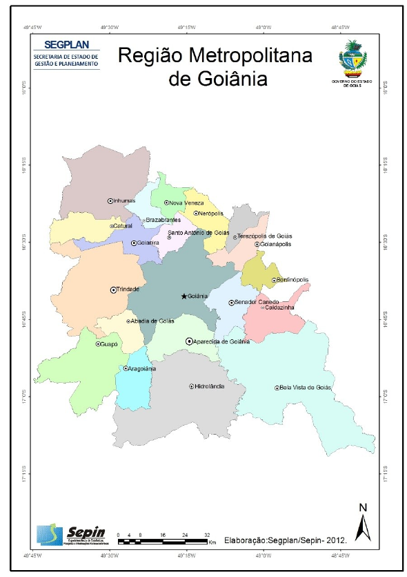 2. CARACTERIZAÇÃO GERAL DA REGIÃO METROPOLITANA DE GOIÂNIA Figura 1 – Mapa da RM de Goiânia. Fonte: SEPLAN. As Regiões Metropolitanas (RMs) foram instituídas em 1973 com a criação de 8 RMs.4 Um de seus objetivos principais era viabilizar um plano de desenvolvimento integrado que contemplasse todos os municípios pertencentes às regiões, promovendo um desenvolvimento econômico e social integrado. Além disso, os municípios teriam preferências de investimentos e empréstimos em relação aos demais, junto à União. Após a promulgação da constituição de 1988 a responsabilidade pela criação das RMs passou a ser controlada pelos Estados. Com isso, foram criadas várias outras regiões, totalizando 37 RMs. A Região Metropolitana de Goiânia – RMG - foi criada pela Lei Complementar N. 027 de dezembro de 1999, composta originalmente por 11 municípios que formavam, segundo esta Lei Complementar, a “Grande Goiânia” (Goiânia, Abadia de Goiás, Aparecida de Goiânia, Aragoiania, Goianápolis, Goianira, Hidrolândia, Nerópolis, Santo Antônio de Goiás, Senador Canedo e Trindade). A mesma Lei institui também como espaço metropolitano, o que foi denominado de “Região de Desenvolvimento Integrado de Goiânia (RDIG)” com 7 municípios (Bela Vista, Bonfinópolis, Brazabrantes, Caturaí, Inhumas, Nova Veneza, Terezópolis de Goiás) e posteriormente incluiu Guapo e Caldazinha, totalizando 9 municípios na RDIG. A RMG teve alteração três vezes de sua composição pela Assembleia Legislativa. A primeira em 2004 (Lei Complementar no 048 de 09 de dezembro) quando inseriu o município de Bela Vista de Goiás; a segunda em 2005 (Lei Complementar no 054 de 23 de maio de 2005) que tornou parte integrante da RMG o município de Guapó. Atualmente, por meio da Lei Complementar no 078 de 25 de março de 2010, publicado no Diário Oficial de 05-04-2010, a RMG passou a ser composta por 20 municípios (Abadia de Goiás, Aparecida de Goiânia, Aragoiania, Bela Vista de Goiás, Bonfinópolis, Brazabrantes, Caldazinha, Caturaí, Hidrolândia, Inhumas, Goianápolis, Goiânia, Goianira, Guapó, Nerópolis, Nova Veneza, Santo Antônio de Goiás, Senador Canedo, Terezópolis de Goiás e Trindade). A Região Metropolitana de Goiânia (RMG) é considerada, atualmente, uma relevante aglomeração urbana no país, com enorme potencial de desenvolvimento, polarizada pela capital do Estado de Goiás. A capital Goiânia é importante centro de negócios e serviços do Centro-Oeste e caracteriza-se como espaço estratégico, exercendo forte influência em seu entorno imediato, seja em razão da expansão demográfica, seja pela oferta de serviços. A dinâmica socioeconômica da Região Metropolitana de Goiânia acarreta impactos sociais, econômicos e ambientais em seus municípios. As soluções de interesse comum devem ser estrategicamente articuladas no espaço metropolitano visando o desenvolvimento regional e a desejável redução das desigualdades. De acordo com o Princípio das Funções Públicas de Interesse Comum, definidos no art. 90 da Constituição do Estado de Goiás e estabelecidos no art. 5º da Lei Complementar nº 27, constituem as seguintes atividades: transportes e sistema viário; segurança pública; saneamento básico; ocupação e uso do solo, abertura e conservação de estradas vicinais; aproveitamento dos recursos hídricos; distribuição de gás canalizado; cartografia e informações básicas; aperfeiçoamento administrativo e solução de problemas jurídicos comuns; planejamento; política de habitação e meio ambiente; desenvolvimento econômico; promoção social; modernização institucional. Segundo o Censo 2010, a população metropolitana é constituída de 2.173.141 habitantes, distribuída num território de aproximadamente 7.315,1 km2, o que lhe confere uma densidade demográfica aproximada de 297,07 hab./km2. Pela divisão mesorregional, observa-se que aproximadamente 70% da população goiana se concentram nas mesorregiões Centro e Leste Goiano (que abrigam a RM Goiânia e RIDE DF). Na última década, essas duas mesorregiões continuaram aumentando sua participação na população total do Estado e registraram também os maiores crescimentos proporcionais entre as demais: 20,55% e 27,84%. Incluindo a população de Anápolis (eixo Goiânia-Anápolis-Brasília) de 334.613 mil habitantes, a população dessa região alcança 2.507.754 habitantes – significando que 41,76% da população do Estado vivem em 21 municípios (8,53% dos municípios goianos), os quais distam no máximo 50 Km do pólo metropolitano – a capital Goiânia. Com relação ao peso da população metropolitana no total do Estado, é possível observar que quando se separa a RM de Goiânia da mesorregião Centro Goiano somente a metrópole abriga 2/3 da população estadual e aumentou sua participação de 34,8% para 36,2% entre 2000-2010. Esse perfil se justifica pela valorização fundiária crescente na capital e à incorporação de estoques de áreas rurais, principalmente nos municípios limítrofes para saldar as demandas por habitação que não são absorvidas pelo núcleo metropolitano, ao favorecer, assim, os movimentos migratórios para estes locais. Concentrando também as maiores mazelas decorrentes das aglomerações desordenadas: pobreza, desemprego, baixo IDH, déficit de serviços de saúde, educação, saneamento básico, além de elevados índices de violência. Internamente à metrópole goianiense, verifica-se que o peso populacional do núcleo metropolitano e da periferia segue caminhos inversos: enquanto o núcleo vai perdendo peso – de 62,7% para 59,9% da população metropolitana; a periferia vai aumentando sua fatia populacional – de 37,3% para 40,1% da população da metrópole. Três municípios metropolitanos figuram entre as 10 maiores taxas anuais de crescimento de Goiás: Goianira (6,17% - Alta Integração), Senador Canedo (4,74% - Mu