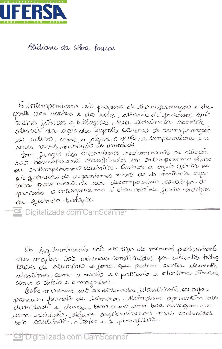 UNIVERSIDADE FEDERAL RURAL DO SEMI-ÁRIDO CENTRO MULTIDISCIPLINAR DE ANGICOS - CMA BACHARELADO EM CIÊNCIA E TECNOLOGIA DISCIPLINA: MECÂNICA DOS SOLOS I PROFESSORA: LETICIA MOREIRA DE CARVALHO NOME: MATRÍCULA: LISTA DE EXERCÍCIOS 1 1. O que é intemperismo? Quais os tipos que podem ocorrer? Cite os agentes de intemperismo. 2. O que são argilominerais? 2016020309 3. Explique o que significa água de dupla camada e água adsorvida. 4. O que são solos residuais? 5. Como podem ser apresentadas as Estruturas dos Solos? 6. Explique do que se trata a Tixotropia e a Sensitividade na Estrutura dos Solos. 7. Uma amostra de argila saturada com volume de 560 cm³ apresentou massa de 850 g. Após secagem total durante 24 h em estufa a 105ºC, a massa resultante foi de 403 g. Estimando-se Gs = 2,7, determinar: a) Teor de Umidade; b) Índice de Vazios; c) Peso específico natural. 8. Para uma amostra de areia argilosa de origem aluvial foram obtidos Gs = 2,72, e= 0,75 e Sr = 50%. Determinar: a) Teor de Umidade; b) Peso específico natural; c) Peso específico seco d) Peso específico saturado; e) Peso específico submerso; 9. Uma amostra de solo tem 38 mm de diâmetro e 76 mm de comprimento e em suas condições naturais pesa 168,0g. Ao ser completamente seca em um forno, a amostra pesa 130,5. O valor de Gs é 2,73. Qual o grau de saturação da amostra ? 10. De um corte são removidos 180.000 m3 de solo, com um índice de vazios e = 1,22. Quantos metros cúbicos de aterro com 0,76 de índice de vazios poderão ser construídos?