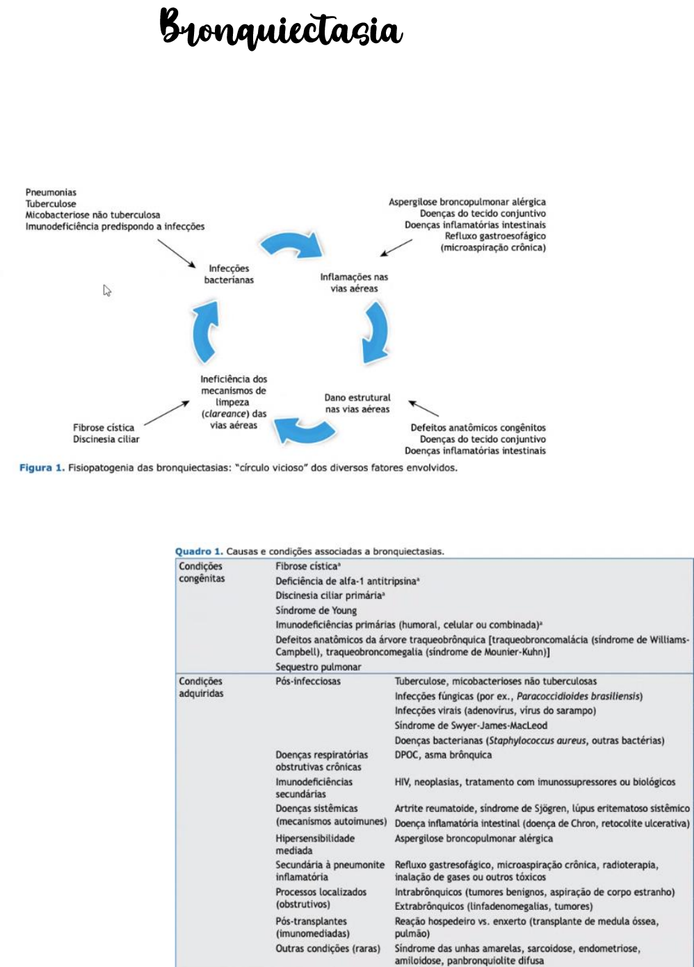 Pneumologia – FMBM Pamela Barbieri – T23 Profª Dra. Juliana 1 É uma dilatação irreversível da parede brônquica, observada na tomografia computadorizada de tórax (TCAR). Fisiopatologia: Ocorre destruição do músculo liso e do tecido elástico por infecções crônicas necrotizantes crônicas, levando a dilatação permanente dos brônquios e bronquíolos. Ciclo vicioso “Cole”: 1. Insulto ambiental + predisposição genétca. 2. Prejuízo do transporte mucociliar. 3. Persistênca de microrganismos na arvore brônquica. 4. Em VA de pequeno calibre: tosse é ineficaz na remoção de secreções (transporte mucociliar ineficaz). 5. Infecção e inflamação, levando a dano celular. 6. Prejuízo da motilidade ciliar. Classificação: Morfologia. Localização Pneumologia – FMBM Pamela Barbieri – T23 Profª Dra. Juliana 2 Morfologia: →Cilindrica: interrupção abrupta do brônquio que não diminui de diâmetro progressivamente. →Varicosa: regiões de dilatação e estreitamento. →Sacular: ao final forma uma dilatação sacular com predisposição a infecções. Localização: Localizada x difusa. Pneumologia – FMBM Pamela Barbieri – T23 Profª Dra. Juliana 3 Diagnóstico: Suspeita: história clínica – tosse, expectoração, dispneia... Dx por imagem: TC de tórax de alta resolução. →Sintomas: tosse crônica (há mais de 2 meses); episódios frequentes (intervalados) de expectoração. Dispneia (de evolução lenta, com perda funcional a longo prazo). Hemoptises. Sibilância durante exacerbações. *Sintomas crônicos (mais de 6 meses): maioria dos casos tem evolução lenta. →Ao exame físico: estertores finos (localizados ou bilaterais); roncos e sibilos (durante as exacerbações); pode haver estertores grossos também; Taquipneia. *Obs: depende da apresentação da doença: consolidação, impactação de pequenas VA com produção de atelectasia de região adjacente... →RX de tórax: alguns sinais podem sugerir: Brônquios com paredes visíveis formando linhas paralelas – sinal do trilho de trem. Imagens císticas de paredes finas ou espessas, com ou sem conteúdo e nível hidroaéeo. Espessamento das paredes brônquicas. Atelectasias lineares – obstrui um brônquio e região adjacente atelectasia. Imagens císticas de paredes finas ou espessas, com ou sem conteúdo e nível hidroaéreo. Espessamento de paredes brônquicas. Lembrando que não são sinais específicos. TCAR: Dilatações císticas das paredes brônquicas, que únicas formam imagens de ‘cachos de uva’. Dilatação da via aérea com perda da forma em funil do brônquio e espessamento das paredes brônquicas. Pneumologia – FMBM Pamela Barbieri – T23 Profª Dra. Juliana 4 Áreas de atenuação em ‘mosaico’. Áreas de anéis de sinete (brônquio+vaso). Pequenos pontos: impactação mucoide. Diferença de densidade: parte mais aerada mais escura. Consolidações subsegmentares em bronquiectasias. Sinal do anel de sinete, dilatações císticas. Impactação mucoide (círculos). Pneumologia – FMBM Pamela Barbieri – T23 Profª Dra. Juliana 5 1) CILÍNDRICA 2) VARICOSA 3) CÍSTICA →Diagnóstico – exacerbação infecciosa: Critérios: Caracterizada pela piora de 3 ou mais dos seguintes sintomas por pelo menos 48h: 1) tosse; 2) volume ou viscosidade do escarro; 3) purulência de escarro; 4) dispneia ou intolerância ao exercício; 5) fadiga; 6) hemoptise. ATBterapia na bronquiectasia: Adm ATB nesses casos. Pneumologia – FMBM Pamela Barbieri – T23 Profª Dra. Juliana 6 Exames complementares: →Broncofibroscopia: localizar obstrução brônquica, identificar hemoptise, remover e colher secreções, acompanhar a colonização das VA. →Prova de função pulmonar: acompanhar a evolução da dispneia, evitar evolução para cor pulmonale. Anualmente. Diagnóstico etiológico: Sinais de acordo com a clínica, pede exames relacionados específicos! Pneumologia – FMBM Pamela Barbieri – T23 Profª Dra. Juliana 7 Pneumologia – FMBM Pamela Barbieri – T23 Profª Dra. Juliana 8 Tratamento: clínico (na maioria dos casos); cirúrgico (casos selecionados). →Antibióticos – durantes exacerbações. →Fisioterapia respiratória/reabilitação pulmonar. →Broncodilatadores LD. →Corticosteróides inalados (casos selecionados - asma, sibilações ou espirometria com distúrbio obstrutivo reversível). →Prevenção de infecção (vacina da gripe, vacina anti-pneumocócica). →Acetilcisteina – pouco eficiente. →Agentes hiperosmolares (inalação com soluções salinas hipertônicas 7%), para escarrar. Há risco de broncoespasmo. →Macrolídeos como imunomoduladores para pacientes que estão se infectando com grande frequência (3x na semana, por 4 meses; há risco de indução de resistência bacteriana). **Obs paciente com DPOC: adm corticoides se asma, sibilações ou espirometria distúrbio obstrutivo reversível. Pneumologia – FMBM Pamela Barbieri – T23 Profª Dra. Juliana 9 →Tratamento cirúrgico: pacientes com doença localizada e sem resposta ao tratamento clínico adequado (provocando sintomatologia intensa – supuração crônica). Hemoptise grave (embolização ineficaz). Tto cirúrgico com intenção paliativa (doença difusa): presença de áreas abscedadas que não foram responsivas ai tto com antimicobrianios.
