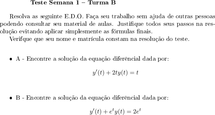Teste Semana 1 � Turma B Resolva as seguinte E.D.O. Faça seu trabalho sem ajuda de outras pessoas podendo consultar seu material de aulas. Justi�que todos seus passos na res- olução evitando aplicar simplesmente as fórmulas �nais. Verifque que seu nome e matrícula constam na resolução do teste. � A - Encontre a solução da equação diferêncial dada por: y′(t) + 2ty(t) = t � B - Encontre a solução da equação diferêncial dada por: y′(t) + ety(t) = 2et Rodolfo Rodolfo