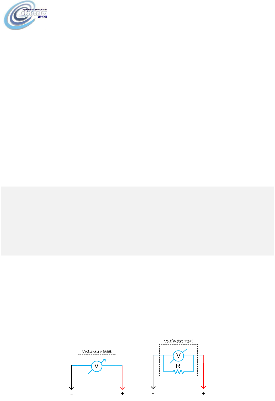 1 ____________________________________________________________________________________________ Laboratório de Eletricidade - Professores André Lazzaretti / Fabiana Pöttker / Simone Crocetti / Carmen Rasera Fonte: Laboratório de Eletricidade e Eletrônica – Francisco Gabriel Capuano e Maria Aparecida Mendes Marino 24a Edição Experiência 02 – Lei de Ohm e Potência Aluno: ________________________________ Data: ____/ _____/________ 1. Objetivos de Aprendizagem deste Experimento A experiência 2 trata dos capítulos 3, 4, 5 e 6 do livro texto. Os objetivos deste experimento são: Utilizar o voltímetro para medidas de tensão contínua. Utilizar o amperímetro para medidas de corrente contínua. Verificar a lei de Ohm. Levantar a curva da tensão em função da corrente e da potência em função da corrente de um resistor. 2. Componentes Utilizados na Experiência 2 Neste experimento serão utilizados os seguintes resistores de 1/4W: 680Ω e 2,2kΩ. Também será utilizada uma fonte de tensão variável 0V-12V, um protoboard e um multímetro digital, além de papel milimetrado. AAAAntes da aula de laboratório cada aluno deve fazer os ntes da aula de laboratório cada aluno deve fazer os ntes da aula de laboratório cada aluno deve fazer os ntes da aula de laboratório cada aluno deve fazer os cálculos e cálculos e cálculos e cálculos e preencher as tabelas preencher as tabelas preencher as tabelas preencher as tabelas com os valores teóricos, quando for o caso,com os valores teóricos, quando for o caso,com os valores teóricos, quando for o caso,com os valores teóricos, quando for o caso, além além além além de montar de montar de montar de montar os componentes no protoboard os componentes no protoboard os componentes no protoboard os componentes no protoboard (deixar “jumpers” para as (deixar “jumpers” para as (deixar “jumpers” para as (deixar “jumpers” para as medidas de correntmedidas de correntmedidas de correntmedidas de corrente)e)e)e) cada circuito que será testado!cada circuito que será testado!cada circuito que será testado!cada circuito que será testado! 3. Experiência 2 3.1 Voltímetro e Amperímetro Um voltímetro real pode ser considerado como um voltímetro ideal (impedância de entrada infinita) em paralelo com uma impedância de entrada muito alta (R=200KΩ, 2M Ω ou 2TΩ), como mostra a figura 1. Considerando-se o voltímetro ideal, ao ser colocado em paralelo com os pontos do circuito no qual se deseja medir a tensão, não altera o funcionamento do circuito, pois não desvia corrente do circuito. Figura 1 – Voltímetro. 2 ____________________________________________________________________________________________ Laboratório de Eletricidade - Professores André Lazzaretti / Fabiana Pöttker / Simone Crocetti / Carmen Rasera Fonte: Laboratório de Eletricidade e Eletrônica – Francisco Gabriel Capuano e Maria Aparecida Mendes Marino 24a Edição No entanto, a resistência interna do voltímetro, apesar de valor elevado, na prática altera as características elétricas do circuito que está medindo a tensão, pois desvia uma pequena corrente do circuito. A tensão que ele mede não é exatamente a mesma tensão que existe nos pontos considerados quando o voltímetro não está conectado no circuito. De maneira análoga um amperímetro real pode ser considerado um amperímetro ideal (impedância de entrada nula) em série com uma impedância de entrada pequena (Ω, mΩ, ...), como mostra a figura 2. Considerando-se o amperímetro ideal, ao ser colocado em série com o elemento de circuito no qual se deseja medir a corrente, não altera o funcionamento do circuito, pois apresenta resistência interna nula. Figura 2 – Amperímetro. No entanto, a resistência interna do amperímetro, apesar de muito pequena, na prática altera as características elétricas do circuito que está medindo a corrente, pois muda a resistência total no ramo de circuito no qual está inserido. A corrente que ele mede não é exatamente a mesma corrente que existe no ramo considerado quando o amperímetro não está conectado no circuito. Para medirmos uma tensão sobre um Para medirmos uma tensão sobre um Para medirmos uma tensão sobre um Para medirmos uma tensão sobre um componente de um circuito elétrico colocamos componente de um circuito elétrico colocamos componente de um circuito elétrico colocamos componente de um circuito elétrico colocamos o o o o VOLTÍMETVOLTÍMETVOLTÍMETVOLTÍMETRO EM PARALELORO EM PARALELORO EM PARALELORO EM PARALELO com o com o com o com o componente!componente!componente!componente! Para medirmos a corrente que flui sobre um Para medirmos a corrente que flui sobre um Para medirmos a corrente que flui sobre um Para medirmos a corrente que flui sobre um componente de um circuito colocamos o componente de um circuito colocamos o componente de um circuito colocamos o componente de um circuito colocamos o AMPERÍMETRO EM SÉRAMPERÍMETRO EM SÉRAMPERÍMETRO EM SÉRAMPERÍMETRO EM SÉRIEIEIEIE, no ramo do circuito , no ramo do circuito , no ramo do circuito , no ramo do circuito em que seem que seem que seem que se encontra o componente!encontra o componente!encontra o componente!encontra o componente! 3 ____________________________________________________________________________________________ Laboratório de Eletricidade - Professores André Lazzaretti / Fabiana Pöttker / Simone Crocetti / Carmen Rasera Fonte: Laboratório de Eletricidade e Eletrônica – Francisco Gabriel Capuano e Maria Aparecida Mendes Marino 24a Edição 3.2 Lei de Ohm e Potência Sabendo que em um bipolo ôhmico a tensão aplicada aos seus terminais é diretamente proporcional à intensidade de corrente que o atravessa, podemos escrever: V = R x I. Portanto, a curva da tensão em função da corrente para um bipolo ôhmico tem uma característica linear, como mostrado na figura 3. Da característica linear temos tgα=ΔV/ΔI, ou seja, a 