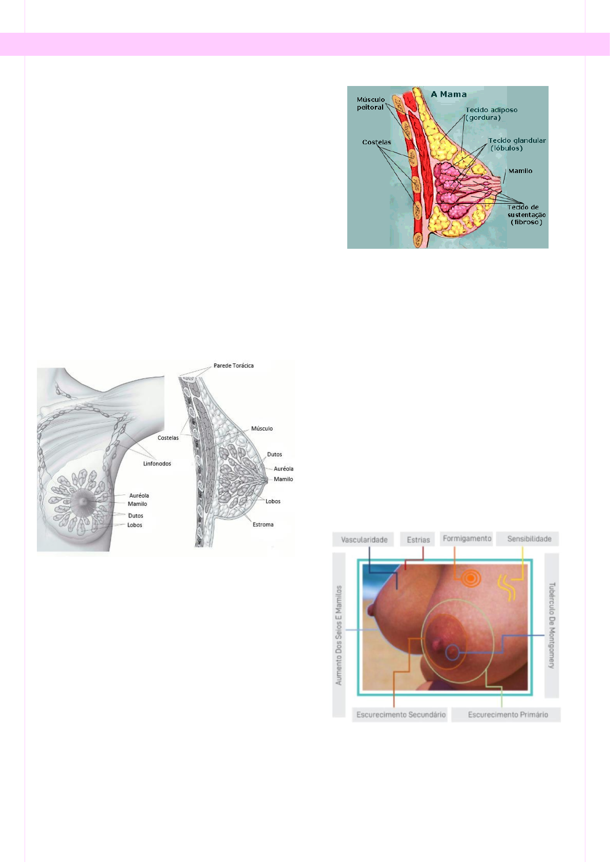 Stephane Bispo @vidadefisio_study As mamas são constituídas por tecido adiposo, tecido conjuntivo e tecido glandular, além de vasos sanguíneos, vasos linfáticos e fibras nervosas. Sua função das mamas é produzir o leite que serve de alimento para os bebês. As mamas surgem aos pares nas mulheres e estão localizadas na parte superior do tórax, sobre o músculo peitoral maior. No sentido vertical, estendem-se da segunda à sexta costela. Exteriormente, a mama é coberta por uma pele lisa. Em seu centro, aparecem a aréola, que tem forma arredondada e coloração mais escura, e as papilas, pequenos furos no mamilo onde desembocam os ductos lactíferos. Em volta do mamilo se encontram as glândulas areolares ou glândulas de Montgomery, que produzem secreções sebáceas que mantêm o mamilo lubrificado. As glândulas mamárias se distribuem por toda a mama, porém se concentram na área próxima ao mamilo. A sustentação da mama se dá graças à gordura, ao tecido conjuntivo e aos ligamentos de Cooper, que a suspendem. Os mamilos têm capacidade erétil e respondem a estímulos sexuais e ao frio, tanto nas mulheres quanto nos homens, que também têm glândulas mamárias, embora menos desenvolvidas. As mamas começam a se desenvolver na puberdade graças aos hormônios femininos, principalmente a progesterona e o estrógeno, produzidos nos ovários. O tamanho e o formato das mamas variam de mulher para mulher e não interferem na produção do leite. Na gravidez, o aumento dos hormônios estrogênio e progesterona estimulam o desenvolvimento das glândulas mamárias. Após o parto, o leite começa a ser produzido. Na menopausa, as glândulas mamárias se atrofiam, fazendo com que as mamas se tornem menos firmes. Alterações nas Mamas durante a gestação 3 a 4 semanas de gestação: • Sensibilidade; • Formigamento; • Crescimento. • Nível crescente de estrogênio e progesterona; • Aumento do peso das mamas; • Aumento do fornecimento de sangue –veias mais visíveis no peito; • Colostro / leite –OCITOCINA. Mamas Stephane Bispo @vidadefisio_study Amamentação A inervação do mamilo desempenha papel vital na lactação, mediando a ativação dos reflexos neuro- humorais responsáveis pela remoção de leite da glândula e a liberação de prolactina essencial para a manutenção do leite. • O estrogênio, associado aos hormônios da tireóide, aos corticoesteróidesadrenais e a insulina, promovem o desenvolvimento das mamas; • Após o parto,estrogênioe progesterona, ação da prolactina e ocitocina; • Primeiros dias colostro; • Mastite puerperal; • Fissuras / rachaduras. A unidade fundamental da mama é o alvéolo oco ou a glândula de leite que se desenvolve durante a 10ª à 12ª semana de vida intrauterina. A diferenciação das células alveolares terminais em unidades secretoras de leite requer a disponibilidade de insulina. prolactina, estrogênio, progesterona e cortisol. Durante a gravidez, as concentrações de prolactina sobem para níveis altos, começando em torno da 8ª semana, estimulando o crescimento da mama e tornando-a mais sensível. Sem a prolactina, a caseína, proteína principal do leite, não seria produzida. A ocitocina tem efeito na liberação do leite secretado e armazenado, contraindo as células mioepiteliais. A quantidade ótima de leite além da dependência hormonal dependerá da ingestão de nutrientes e líquidos. A concentração de vitamina A, B12 e ácido fólico apresenta-se reduzida em dietas empobrecidas. Normalmente, 1 % de qualquer substância ingerida pela mãe pode passar pelo leite para o recém-nascido. A mama pode aumentar de peso e obter 500 a 800 gramas adicionais ao final da gravidez. No período de 8 a 12 semanas, ao redor dos mamilos, as glândulas sebáceas se tornam dilatadas e nodulosas, recebendo o nome de tubérculos de Montgomery, e a pigmentação secundária que surge recebe o nome de dupla aréola. O leite humano costuma aparecer no terceiro a quarto dia após o parto, sendo precedido pelo colostro, de cor amarelada ou transparente, rico em nutrientes e anticorpos. A lactação completa pode ser inibida pela ação do estrogênio e da progesterona, que interferem na ação da prolactina no nível do receptor na célula alveolar ou por inibidores específicos da prolactina, de acordo com a fase do puerpério. O enfaixamento também pode ser utilizado. Situações nas quais a lactação pode ser inibida: • Gestante HIV-positiva; • Uso de medicação controlada em pacientes com distúrbios mentais; • Morte do recém-nascido.