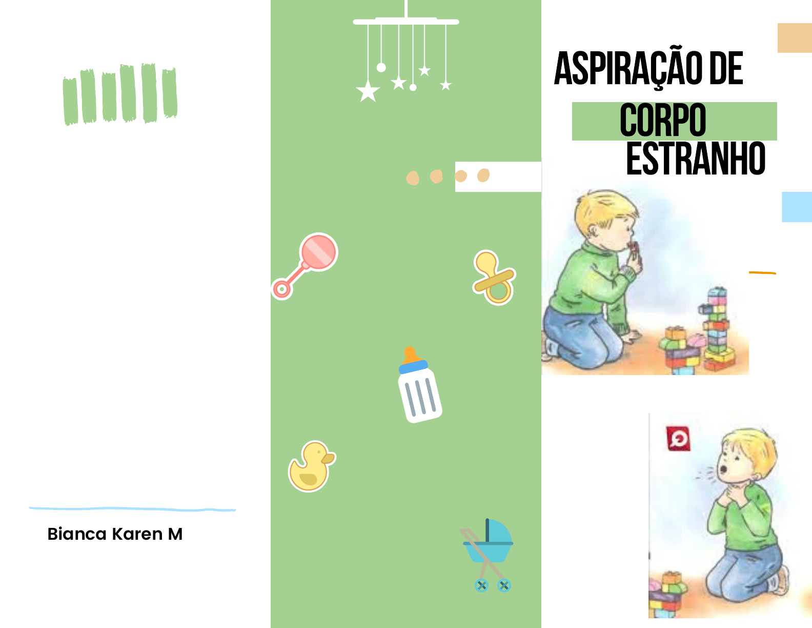 CORPO ESTRANHO Bianca Karen Maria Pereira da Luz RGM: 1990333-2 ASPIRAÇÃO DE Corpo estranho (CE) é qualquer objeto sólido ou líquido que de forma acidental pode penetrar o corpo ou suas cavidades. Habitualmente é ingerido ou colocado pela criança nas narinas e ouvidos, mas apresenta um risco maior quando é aspirado para via aérea inferior. Qualquer material pode se tornar um CE no sistema respiratório, os mais comuns que tem sido relatados são os vegetais, caroços ou sementes de frutas, grãos e brinquedos, podendo causar obstrução parcial ou total da entrada de ar. DEFINIÇÃOações preventivas primeiros cuidados Crianças pequenas não devem ter acesso a brinquedos de crianças maiores. Não deixar moedas, joias, agulhas e outros objetos ao alcance das crianças. Impedir que as crianças brinquem com plástico e balões sem uma supervisão direta. Os alimentos devem ser cortados, amassados ou triturados a tamanhos pequenos. Não oferecer alimentos duros para crianças menores de 4 anos. Ensinar as crianças a não colocarem objetos em geral na boca. Evitar que crianças corram, riam ou chorem com alimentos na boca. eSTATÍSTICAS A obstrução de vias aéreas superiores em alguns estudos, predominou no sexo masculino em 67,5% (FRAGA et al, 2008). A prevalência fica em torno de 65 a 80% dos casos em menores de 5 anos e na faixa etária de 5 a 7 anos chega a cerca de 38% (JUNIOR et al, 2017;) No Brasil a aspiração por corpo estranho está entre a terceira e a quinta causa de morte por este tipo de acidente. Maiores de um ano: manobra de Heimlich, que consiste em compressões abaixo das costelas, com sentido para cima, abraçando a criança por trás, até que o CE seja deslocado da via aérea para a boca e expelido. Menores de um ano: 5 percussões com a mão na região das costas, a criança com a cabeça virada para baixo, seguida de 5 compressões na frente, até que o CE seja expelido ou a criança torne-se responsiva e reaja. Quando a ACE é parcial, a criança pode tossir e esboçar sons. Nesta situação, o melhor procedimento é a não intervenção no ambiente doméstico e encaminhamento a um serviço de saúde, para o tratamento definitivo. Quando a ACE é total, deve- se proceder da seguinte maneira: