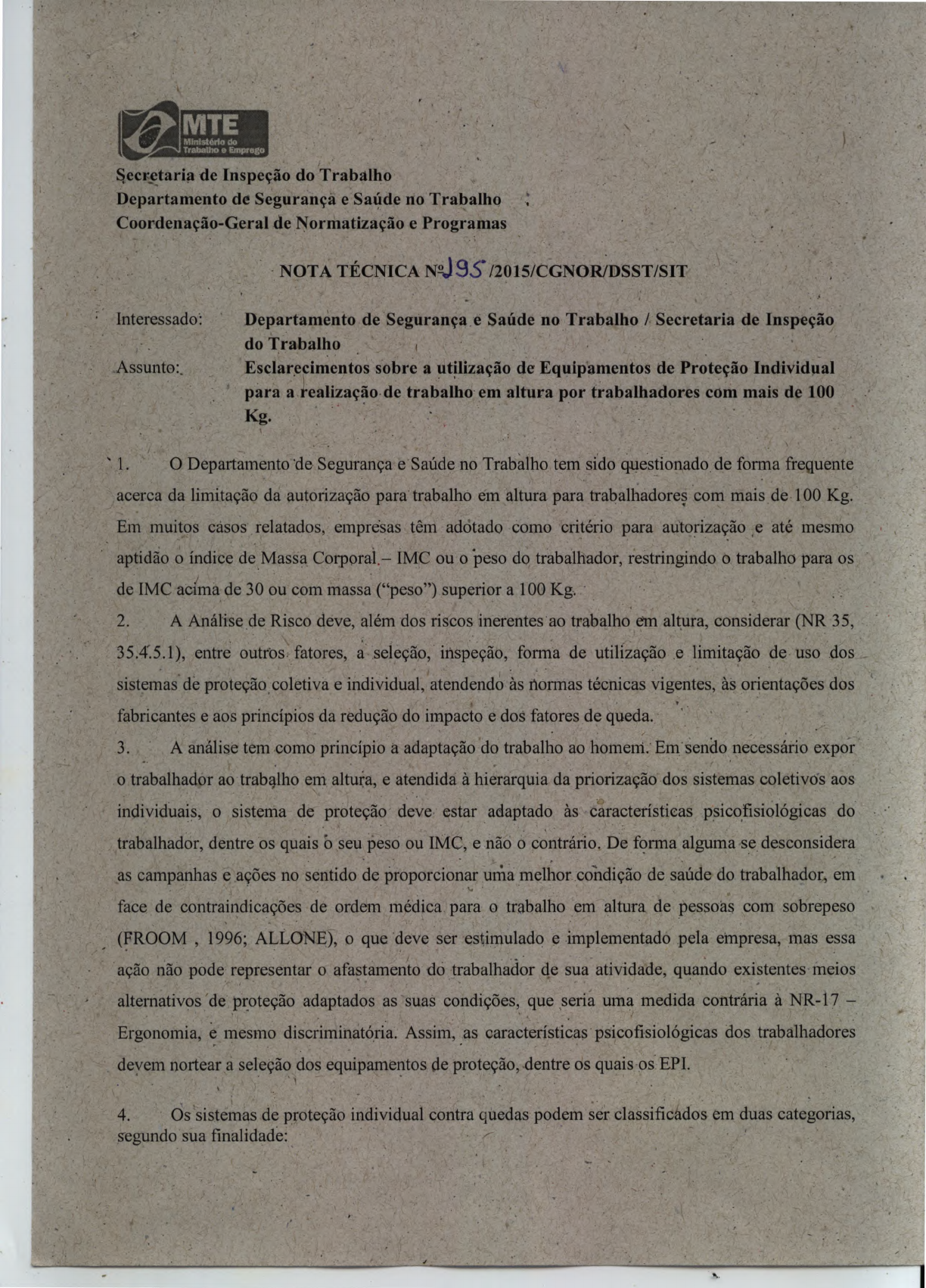 Secretaria de Inspeção do Trabalho Departamento de Segurançá e Saúde no Trabalho Coordenação-Geral de Normatização e Programas NOTA TÉCNICA NJ9S/2015/CGNOR/DSST/S1T Interessado Departamento de Segurança e Saúde no Trabalho / Secretaria de Inspeção do Trabalho Assunto:. Esclarecimentos sobre a utilização de Equipamentos de Proteção Individual para a realização-de trabalho em altura por trabalhadores com mais de 100 Kg. 1. O Departamento de Segurança e Saúde no Trabalho tem sido questionado de forma frequente acerca da limitação da autorização para trabalho em altura para trabalhadores com mais de 100 Kg. Em muitos casos relatados, empresas têm adotado como critério para autorização e até mesmo aptidão o índice de Massa Corporal.— IMC ou o peso do trabalhador, restringindo o trabalho para os de IMC acima de 30 ou com massa ("peso") superior a 100 Kg. 2. A Análise de Risco deve, além dos riscos inerentesao trabalho e'm altura, considerar (NR 35, 35.45.1), entre outros. fatores, a seleção, inspeção, forma de utilização .e limitação de uso dos sistemas dê proteção coletiva e individual, atendendo às iormas técnicas vigentes, às orientações dos fabricantes e aos princípios da redução do impacto e dos fatores de queda. 3. A análise tem como princípio a adaptação do trabalho ao homem; Em sendo necessário expor o trabalhador ao trabalho em altura, e atendida à hierarquia da priorização dos sistemas coletivos aos individuais, o sistema de proteção deve estar adaptado às características psicofisiológicas do trabalhador, dentre os quais b seu peso ou IMC, e não o contrário. De forma alguma se desconsidera as campanhas e ações no sentido de proporcionar unia melhor condição de saúde do trabalhador, em face de contraindicações de ordem médica para o trabalho em altura de pessoas com sobrepeso (FROOM , 1996; ALLONE), o que deve ser estimulado e implementado pela empresa, mas essa ação não pode representar o afastamento do trabalhador de sua atividade, quando existentes meios alternativos 'de proteção adaptados as suas condições, que seria uma medida contrária à NR-17 - Ergonomia, è mesmo discriminatória. Assim, as características psicofisiológicas dos trabalhadores devem nortear a seleção dos equipamentos de proteção, dentre os quais os EM. 4. Os sistemas de proteção individual contra qúedas podem ser classificados em duas categorias, segundo sua finalidade: • Os sistemas de restrição de movimentação, que visam impedir que otrabalhador atinja a zona com risco de queda, não permitindo que a queda ocorra. • Os sistemas de retenção de queda, que objetivam minimizar as conseqüências daqueda. Buscam controlar as energias, minimizando as forças de impacto e os deslocamentos gerados pela queda, de modo a preservar a integridade fisica do trabalhador. Portanto, é nesse tipo de siterna que a massa do trabalhador tem amaior relevância. 5 O sistema de proteção contra quedas pode ser separado em dois subsistemas: o equipamento de proteção individual e sistema de ancoragem. O equipamento de proteção individual (EM), p* sua vez, e composto pelo cinturão de segurança, pelo componente de união (que pode ser um talabarte, um trava-quedas deslizante em linha flexível ou rígida, ou ainda um trava-quedas retrátil), e pelo absorvedor de energia individual (usualmente integrado ao componente de união). 6. Para sistemas de retenção de queda, o cinto de seguraúça deve resistir às forças que se o rão aplicadas sobre ele, não permitir que o corpodo trabalhador se desprenda e distribuir a força de retenção de queda sobre pontos do corpo em que não causarão lesões. Esses requisitós são atendidos apenas por um cinturão de segurança do tipo paraquedista, certificado de acordo com a norma da ABNT NBR 1836. Consta dessa norma, entre outros requisitos, que "o cinturão de segurança tipo paraquedista deve ser projetado e fabricado de forma que o usuário possa se colocar o mais facilmente possível na posição adequada e se manter nela durante o tempo de utilização previsto, tendo em conta os fatores ambientais, movimentos a realizar e posturas a adotar. Para isso, deve : ser possível otimizar a adaptação,de um cinturão de segurança tipo .paraquedista à morfologia do usuário mediante qualquer meio adequado, como fivelas de ajuste ou uma variedade suficiente de tamanhos" (NBR 15836, 4.1). O cinturão, pode ser ajustado pelas fivelas dentro de certos limites, a partir dos quais, cumpre selecionar o tamanho de cintwão adequado ao porte fisico do trabalhador. Um cinturão de tamanho dernasiàdo grande ou pequeno poderia deixar escapar o trabalhador, ou causar lesão pela aplicação de força em pontos inadequados, como também ser um fator de desestímulo ao uso do EPI. 7. Os demais componentes usados em sistemas de retenção de quedas também são certificados por normas específicas da ABNT, como o talabarte de segurança (NBR 15834), o absorvedor de energia (NBR 14629), o trava-quedas deslizantes em linha flexível (NBR 14626), o trava-quedas deslizantes em linha rígida (NBR 14627) e o trava-quedas retrátil (NBR 14628). Todas essas normas incluem um ensaio de comportamento dinâmico, em que e utilizada uma massa de ensaio de 100 kg Nesses ensaios,. uma das extremidades do componente de união é conectada à massa e a outra extremidade é conectada a um instrumento de medida de força conectado por sua vez em um ponto de ancoragem fixo. A massa é levantada a partir do repouso até a altura, de queda prevista na norma, e então solta, sendo medida a força durante a retenção de queda e a distância de parada. As normas exigem que a fórça de retenção de queda não exceda a 6 kN e que a distância de parada não exceda o valor previsto em norma. 8. - Manter o valor da força em até 6 kN tem dupla finalidade: por um lado, proteger a integridade fisica do trabalhador, evitan