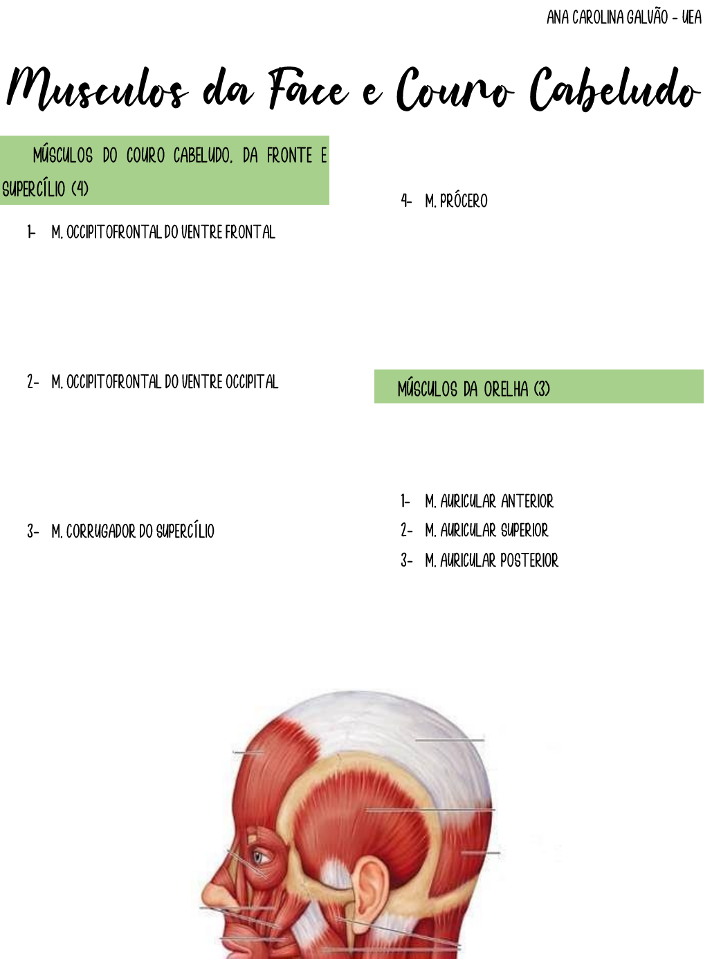 ➙ O: aponeurose epicrânica I: pele dos supercílios e raiz do nariz Ação: eleva os supercílios (como no olhar de espanto). O: ossos occipital e temporal I: aponeurose epicrânica Ação: fixa a aponeurose e traciona o couro cabeludo posteriormente. O: extremidade medial do arco superciliar I: pele superior ao meio da margem supraorbital Ação: traciona medial e inferiormente o supercílio O: fáscia aponeurótica que cobre o osso frontal I: pele da fronte entre os supercílios Ação: traciona a pele do nariz para cima, formando rugas transversais. ➙ O: gálea aponeurótica I: orelha externa ➙ O: extremidade medial do arco superciliar I: pele superior ao meio da margem supraorbital Ação: traciona medial e inferiormente o supercílio O: margem orbital medial, ligamento palpebral medial, lacrimal I: pele ao redor da margem da órbita, lâminas tarsais Ação: fecha o olho. - Faz parte dos músculos extrínsecos do olho ➙ O: I: Ação: O: I: Ação: O: maxila, sob o forame infra-orbital I: lábio superior, parte medial Ação: ➙ O: parte anterolateral do corpo da mandíbula e do platisma I: pele do lábio inferior Ação: comprime o lábio inferior O: parte medial da maxila e mandíbula, face profunda da pele periodontal, medíolo I: túnica mucosa dos lábios Ação: fecha os lábios O: mandíbula, abaixo do ângulo da boca I: ângulo da boca Ação: puxa para baixo o ângulo da boca da expressão de tristeza O: maxila infraorbital (fossa canina) I: medíolo Ação: O: face lateral zigomático I: ângulo da boca Ação: elevam o ângulo da boca. ao sorrir O: zigomático I: lábio superior, parte lateral Ação: eleva o lábio superior corrugado para cima. Ex: descrença, negação, desprezo. O: fáscia da glândula parótida I: ângulo da boca Ação: traciona lateralmente o ângulo da boca O: porção anterior do corpo da mandíbula I: pele do mento Ação: enruga o mento (projeta o lábio inferior) O: tela subcutânea das regiões infraclaviculares e supraclavicular I: base da mandíbula pele da bochecha e do lábio inferior, ângulo da boca. Ação: tensiona a pele do pescoço. O: processo alveolar da região molar da maxila e mandíbula I: orbiculador da boca Ação: comprime a bochecha ➙ O: arco zigomático e osso zigomático I: ângulo e ramo da mandíbula Ação: eleva a mandíbula (fecha a boca) O: fossa temporal I: processo coracoide da mandíbula via um tendão que passa inferiormente arco zigomático. Ação: eleva e retrai a mandíbula O: asa maior e face lateral da lâmina lateral do processo pterigoide do osso esfenoide. I: processo condilar da mandíbula e cápsula da articulação temporomandibular Ação: projeta a mandíbula e produz movimento de lateralidade O: face medial da lâmina lateral do processo pterigoide (esfenoide) e túber da maxila I: face medial da mandíbula perto do seu ângulo Ação: atua com o M. pterigoideo lateral para projetar a mandíbula e produzir movimentos de lateralidade