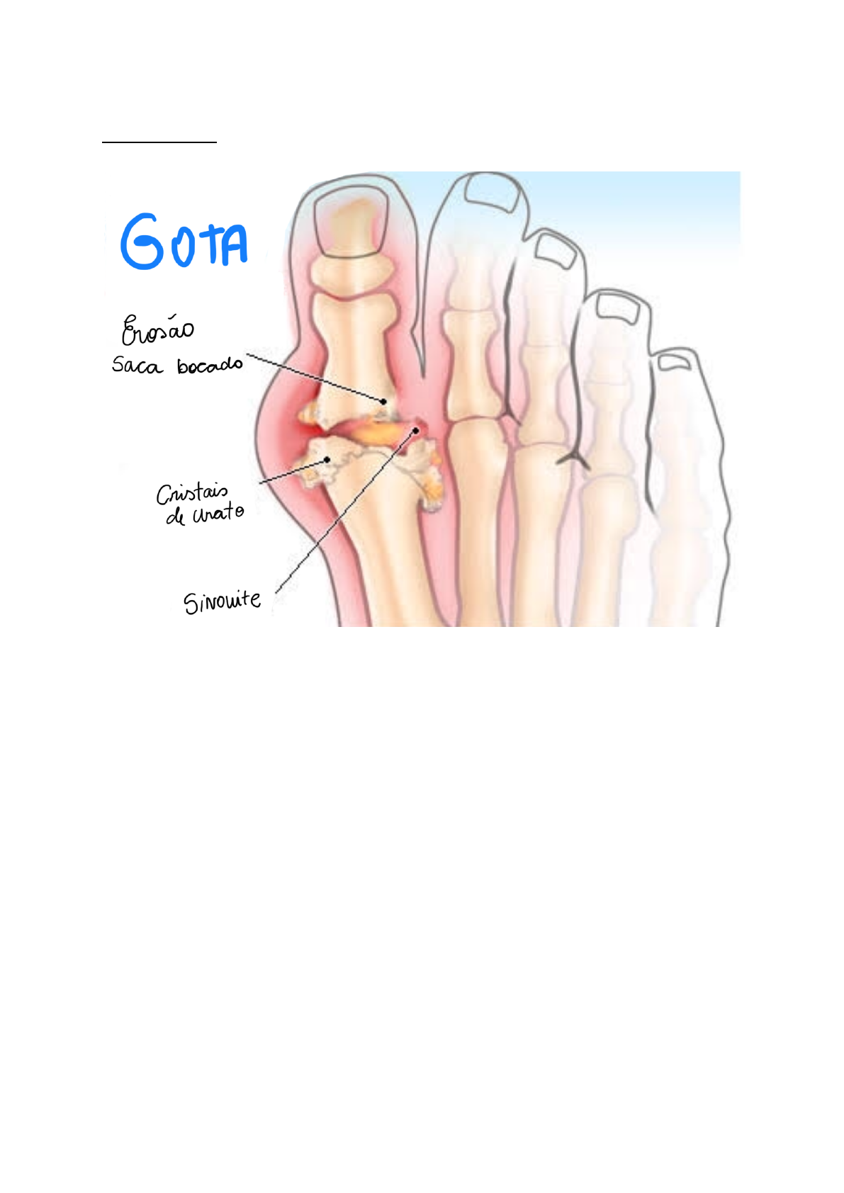1 Artrite Gotosa A artrite gotosa é um tipo de artrite de deposição. Sendo decorrente da hiperuricemia, níveis séricos de ácido úrico elevados. O ácido úrico é sintetizado endogenamente através do metabolismo das purinas, como também absorvido através da alimentação, principalmente alimentos de origem animal. O excesso de ácido úrico pode se depositar nas articulações, na forma de monourato de sódio, levando a um processo inflamatório articular. Geralmente a deposição ocorre nas articulações periféricas, uma vez que as baixas temperaturas auxiliam na precipitação dos cristais e deposição. Quanto a sua epidemiologia, a Gota é mais frequente em homens. Numa proporção de 10:1. Geralmente consiste em monoartrite assimétrica, sendo mais comum iniciada na articulação metatarso falangeana proximal do hálux, podagra, na fase crônica da doença costuma se apresentar como poliartrite e também podem ocorrer depósito de cristais nos rins. O uso de bebida alcoólica é predisponente para o aparecimento da doença. Sua etiopatogenia está associada a dois mecanismos básicos, os quais consistem na produção excessiva endógena ou na excreção renal ineficiente. 2 Os níveis de ácido úrico sérico devem ser menores que 6 mg/dL nas mulheres e 7 mg/dL nos homens. Na crise aguda de Gota, o ácido úrico sérico pode estar normal ou baixo, justamente porque a concentração de ácido úrico está maior nos cristais depositados. Com o avançar da doença podem surgir os tofos gotosos, são nódulos com acúmulo dos cristais que se localizam por cima da cápsula articular. Diagnóstico ● RX, que se apresenta com erosões ósseas mais intensas, conhecida como lesão em saca-bocado. ● História sugestiva ● Hiperuricemia ● Análise do líquido sinovial, com achado dos cristais. ● VHS e PCR Diagnósticos diferencias Artrite Reumatóide, mais associada à fase crônica da gota, que encontra-se manifestações poliarticulares; Artrite Séptica, por ser monoarticular é importante fazer a punção do líquido sinovial, para descartar infecção. Tratamento O tratamento consiste em medidas comportamentais e medicamentosas. Comportamentais, está relacionada principalmente à mudança alimentar para evitar a hiperuricemia e manter níveis adequados de ácido úrico, evitando a deposição dos cristais. Eliminar bebidas alcoólicas, como também a fisioterapia, auxilia no tratamento. Medicamentoso Durante a crise aguda, geralmente pode ser usado os AINES ou ainda os AIES. A depender do nível de inflamação, pode também ser feito infiltrações dos medicamentos nas articulações afetadas. Os Uricosúricos são usados para evitar a hiperuricemia, aumentando a excreção renal do ácido úrico. E inibidores da síntese do ácido úrico, um exemplo é o alopurinol. REFERÊNCIAS: 3 ● TORTORA, Princípios de anatomia e fisiologia, 14 edição. ● CURRENT, Diagnóstico e tratamento, reumatologia, 8 edição. ● GRAY’S, A base anatômica da prática clínica, 40 edição.