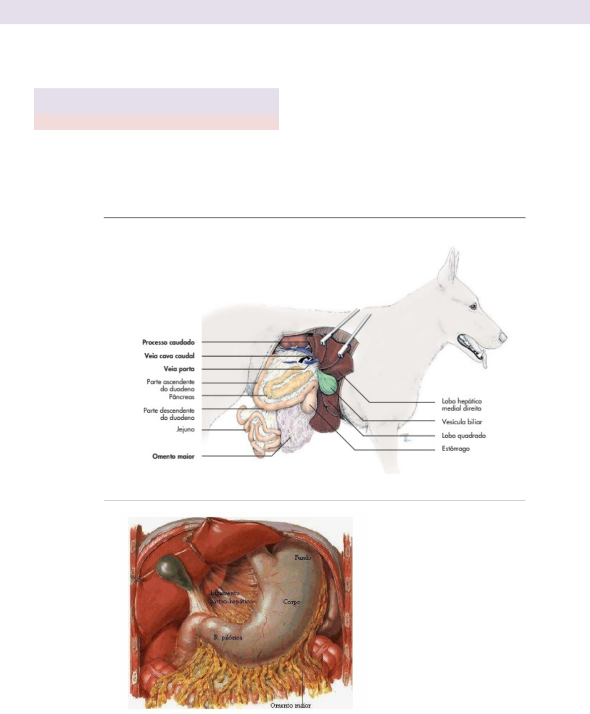 Sistema digestório Corpo animal 2 Continuação estômago monogástrico Omento • São reflexões largas do peritônio, amplas, que se dispõe entre duas vísceras • Função: comprimir e conter as vísceras abdominais mantendo-as em posição • Omento menor: entre o fígado e a curvatura menor do estomago e a primeira porção do duodeno • Omento maior: vai da curvatura maior do estomago ao diafragma, baço e cólon transverso Sistema digestório Incisura angular do estomago • Encaixe (chanfradura) na curvatura menor do estomago, entre o corpo e a parte pilórica. Óstio cárdico • Orifício (abertura) de passagem entre o esôfago e o estômago Ostio pilórico • Passagem do estomago para o intestino Face parietal • Situada contra o diafragma e fígado Face visceral • Em contato com os órgãos adjacentes na direção caudal Sistema digestório Glândulas • Cárdicas e pilóricas produzem muco que atua na proteção da mucosa. Glândulas gástricas próprias (fundicas) possuem células: • Células mucosas do colo: produzem muco • Células principais: produzem pepsinogênio promove a digestão • Células parietais: H+ e Cl- promove a digestão Histologia Vascularização e inervação • Artérias � Artéria gástrica esquerda � Artéria hepática,leva a substância do fígado � Artéria esplênica,vem do baço � As artérias gástricas direita e esquerda acompanham a curvatura menor; as artérias gastroepiploicas direita e esquerda acompanham a curvatura maior. Desse modo, a Sistema digestório vascularização é particularmente generosa nas duas curvaturas, porém menor na metade das faces parietal e visceral, o que deve ser levado em consideração ao se executar uma gastrotomia. • Veia � Veia porta � Veia esofágica � Veia gástrica esquerda Inervação � Fibras parassimpáticas do nervo vago � Fibras simpáticas � Manda o comando para começar a digestão Variações de estomago simples entre as espécies Cães • Formato de c • Cardia afunilada e ampla – facilidade para vômitos (a cárdia esta no inicio do estomago, recebe o esôfago) • Região aglandular e glandular cárdica se limitam a uma zona circular ao redor da entrada do esôfago Gato • Formato de c • Distribuição glandular semelhante ao cão • Lumen mais estreito Suínos • Divertículo (serve para acumular gases) acima do fundo gástrico • Área glandular maior – abertura cárdica ate o divertículo • Região de glândulas cárdicas (produz muco) relativamente extensa • Piloro – toro pilórico – protuberância carnosa – glandular Sistema digestório Interior do estomago dos suínos Equinos • Pequeno em relação ao porte do animal • Fundo gástrico forma o saco cego • Esfíncter do cárdia excepcionalmente desenvolvido (eqüino não vomita) • Possui margem pregueada Sistema digestório Sistema digestório Estômago complexo (poligástrico) • Rúmen, reticulo e omosa - pró ventrículos (aglandular) � Mucosa aglandular � Digestão de carboidratos complexos – celulose � Produção de ácidos gástricos volares – propinato, butirato e acetato � Digestão microbiana • Abomaso – mucosa glandular Sistema digestório Trajeto do bolo alimentar em ruminantes: Para ocorrer a digestão, ocorrera muitos movimentos. O controle desses movimentos é regulado pelo SNC – receptores intramurais que são estimulantes pelo grau de estiramento da paredes. A onda de concentrações atravessa cada estrutura no sentido craniocaudal. • 1º parte: passando o bolo alimentar pelo esôfago • 2º parte: contração reticular bifásica que lança o conteúdo do retículo para o rúmen (no átrio) • 3º parte: é seguida por contração do saco ruminal dorsal e depois do saco ruminal ventral • 4º parte: passando por uma prega ruminorreticular em forma de U • 5º parte: regurgitação, o retorno do alimento para a boca para uma nova mastigação, dependera dos movimentos do esôfago, da garganta e da torácica. • 6º parte: ocorre uma concentração reticular que vai ate a região cárdica. A ingestão é levada para o esôfago á expansão do tórax. Sendo que as vias aérea superior estarão fechadas • 7º parte: o alimento é remastigado e mais umedecido e dividido. Tenderá a cair da cárdia para o retículo. Nessa segunda passagem, do reticulo o bolo cairá no omaso e em seguida no abomaso e o caminho do alimento segue, pelo piloro e intestino. Pre-estômagos • Estrutura da mucosa dos compartimentos do rúmen, reticulo e omaso • Semelhante a mucosa da região do estomago dos não ruminantes e da primeira parte do abomaso • Aglandular – presença de microorganismos (bactérias, fungos, leveduras e microplasma) • Digestão microbiana, que é fundamental no suprimento de nutrientes (energia) Introdução • Abdômen esquerdo – consegue – se visualizar quase todo os compartimentos estomacais, principalmente rúmen • Abdômen direito – apenas uma parte significativa • Abomaso (estômago verdadeiro) – maior parte ao nascer • O rúmen não é grande quando o animal é pequeno bebê Adulto Sistema digestório Rúmen e retículo Ruminação • Ato de mastigar a ingesta ruminal • Animal ingere o alimento rapidamente – complementa a mastigação mais tarde • Objetivos da ruminação: • Fragmentação do conteúdo ruminal grosseiro • Condições mais favoráveis para a digestão microbiana • Transporte do material ruminal para o omaso e abomaso • Função rúmen: produção de gases, produção de ácidos graxos voláteis e produção de massa microbiana • Rúmen é a maior câmara fermentadora Rúmen • Face pariental – adjacente ao diafragma , lateral esquerda e ventre • Reservatório e câmara fermentativa dos alimentos ingeridos • Face visceral – figado, intestino, omaso e abomaso • Prega ruminorreticular, delimita o rumen e o reticulo • Internamente é dividido em varias partes por