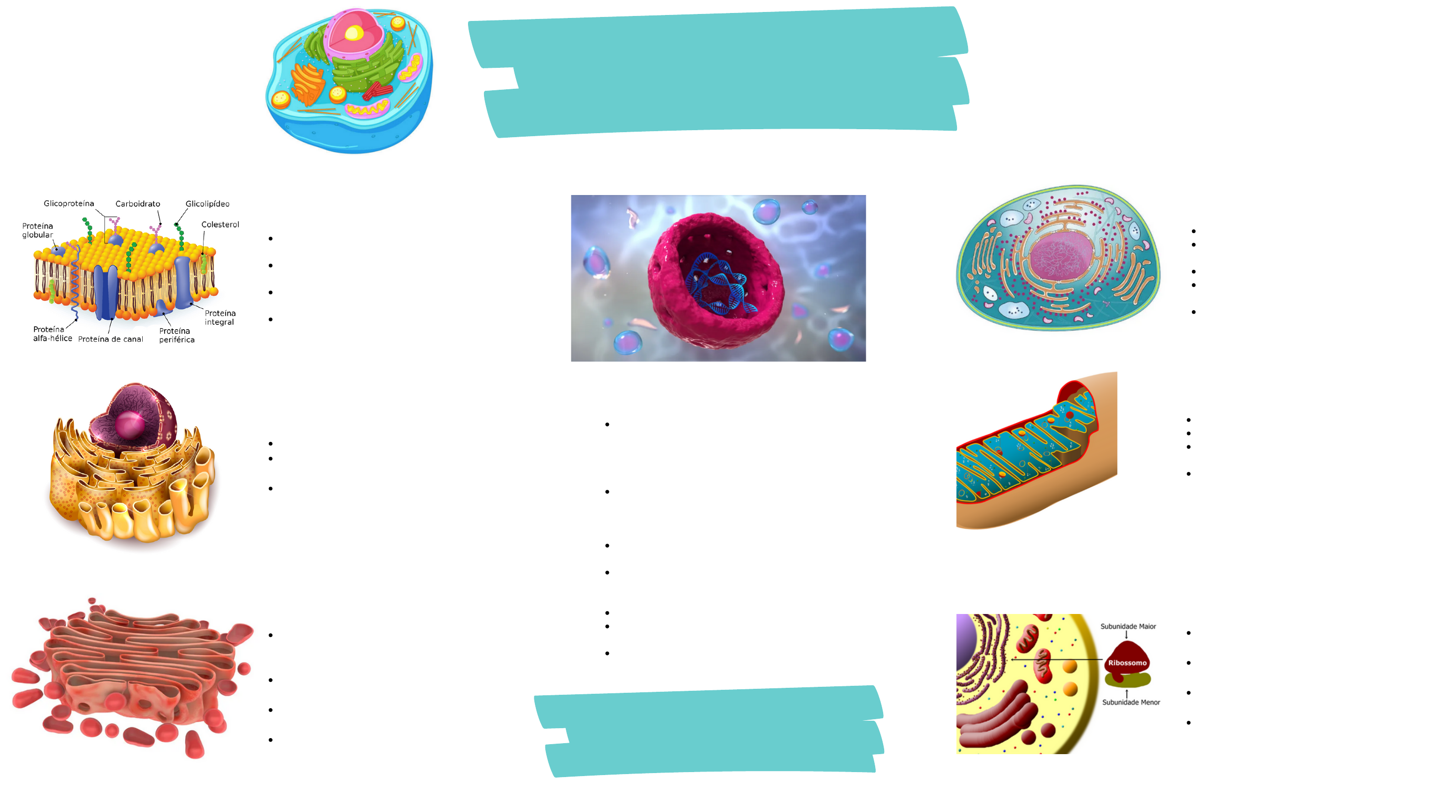 Célula eucarionte Comunicação da célula com o meio externo Bicamada de fosfolipídios hidrofílicos e hidrofóbicos Fluidez modelada por moléculas de colesterol Proteínas transportadoras, âncoras, receptoras e enzimáticas. Membrana plasmática Onde ocorre a maiorias das reações Composto pelo citosol, citoesqueleto e organelas Água (70%), íons; Pequenas moléculas: vitaminas, glicose, AAs...; Macromoléculas: Proteínas, enzimas, carboidratos, ácidos nucléicos e lipídios. Citoplasma Biossíntese de lipídeos e proteínas Granular ou Rugoso (RER): síntese de proteínas destinadas a secreção Liso (REL): produção de hormônios, fosfolipídios, hidrólise de glicogênio em glicose... Retículo endoplasmático CG: armazena, transforma e exporta as substâncias produzidas no REL e RER Lisossomos primários: armazenam enzimas catalíticas até a célula realizar endocitose Lisossomos secundários: Se funde ao endossomo digerindo as partículas Autofagia: reciclam organelas celulares envelhecidas e macromoléculas Complexo de Golgi e Lisossomos Produção proteínas essenciais para o funcionamento da célula. Sintetizados no nucléolo e tranferidos para o citoplasma Estruturas celulares constituidas por rRNA + Proteínas presentes na célula de forma livre ou ligadas ao RG Ribossomos Respiração celular - Produção de ATP Móveis e plásticas Quantidade e localização relacionadas com a necessidade energética das células Na matriz mitocondrial, encontra-se enzimas que atuam na respiração celular, outras proteínas, material genético (DNA e RNA) e ribossomos. Mitocôndria Controla o metabolismo celular pela transcrição do DNA nos diferentes tipos de RNA que são traduzidos em proteínas, os efetores finais da informação genética A maior parte da informação genética da célula está contida no DNA do núcleo, havendo apenas uma pequena porção fora dele, nas mitocôndrias e cloroplastos delimitado pelo envoltório nuclear ou carioteca A membrana externa do envoltório nuclear é contínua a do retículo endoplasmático e tem ribossomos associados O nucléolo é uma área não circundada por membrana onde ocorre a produção dos ribossomos Núcleo @ca.estudantedenutri https://brasilescola.uol.com.br/biologia/dna.htm https://brasilescola.uol.com.br/o-que-e/biologia/o-que-e-rna.htm