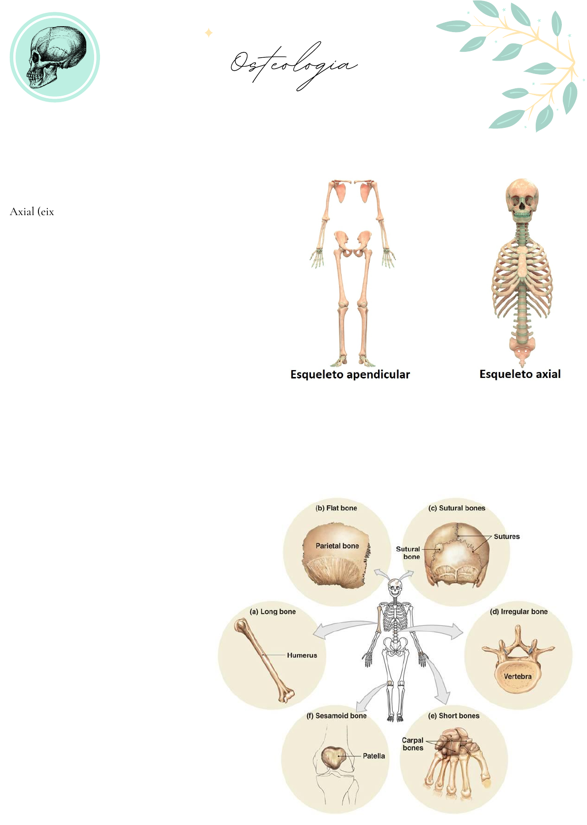 Osteologia Axial (eixo do corpo, proteção dos órgãos vitais): • cabeça (crânio) (29) • Coluna Vertebral (26) • Tórax (25) Apendicular (relacionado aos movimentos): • Cintura escapular (04) • Membros superiores (60) • Cintura pélvica (02) • Membros inferiores (60) Total=206 ossos no corpo humano adulto. Fatores • Etários • Individuais • Critério de contagem Comprimento, largura e espessura. Ossos longos: apresentam epífise (parte da “cabeça do osso” as extremidades) e diáfise (parte intermediária entre as extremidades) Ossos curtos: geralmente ficam na região do tarso e do carpo (pés e mãos) Ossos planos (ossos chatos): região da cabeça e da pelve Ossos irregulares: não relacionados com largura comprimento e espessura, difícil de classificar. (coluna vertebral) Ossos sesamóides: ossos com aspecto de semente (patela), normalmente no interior de articulações Ossos pneumáticos: ossos com cavidade (seios da face, paranasais). Constituição do Esqueleto Funções do esqueleto: sustentação e conformação do corpo, proteção à órgãos vitais e reserva de minerais (Ca,P,K,Na). Hemopoiese (condução/produção de células sanguíneas através do interior dos ossos), movimento. Classificação geral dos ossos: de acordo com suas dimensões Arquitetura dos ossos planos: Tecido ósseo compacto: • Externo • Interno Tecido ósseo esponjoso – díploe (entre o tecido ósseo compacto externo e interno). Arquitetura dos ossos curtos: • Tecido ósseo esponjoso (meio do osso) • Tecido ósseo compacto Elementos descritivos da superfície óssea (saliências): • Cabeça (ex: cabeça do fêmur) • Trocanter • Crista • Côndilo Elementos descritivos da superfície óssea (aberturas): • Forame (redondo, oval, espinhoso) • Meato • Canal Epífise: substância compacta, esponjosa, cartilagem epifisária (meio para saber o quanto o indivíduo ainda tem a crescer) se torna linha epifisária. Diáfise: em seu interior há o endóstio, tecido conjuntivo que está envolvendo internamente o osso, há também um canal medular, o qual contém medula óssea. A medula óssea pode ser vermelha ou amarela. Arquitetura interior dos ossos longos: Canal Meato Forame Crânio, contém 29 ossos. Coluna vertebral contém 26 ossos, tórax contém 25 ossos. Crânio: função de proteção do sistema nervoso central, proteção do globo ocular. O osso esponjoso que está situado no crânio é chamado díploe, localizado entre a lâmina interna e externa. Porção posterior: neurocrânio 8 ossos. Possui ossos pares (do lado esquerdo e direito) e ímpares. Ossos pares: osso paretal (origem intramembranosa), osso temporal (região da escama com origem intramembranosa e parte timpanica, restante tem origem endocondral) Ossos ímpares: frontal (origem intramembranosa), etimoide (origem endocondral), esfinoide(pequena porção de origem intramembranosa, grande parte endocondral), occipital (somente a porção superior tem origem intramembranosa, restante endocondral). Divisão: • Parte superior: abóbada craniana ou calota craniana. • Base do crânio Porção anterior: viscerocrânio 14 ossos. Ossos ímpares: mandíbula, vober. Ossos pares (maciço facial): osso nasal, osso lacrimal, osso maxilar, coxas nasais, osso palatino, osso zigomático. Periósteo: tecido conjuntivo fibroso que reveste a superfície óssea, com exceção, das regiões articulares. tem capacidade osteogênica, de reparar ossos, produzir e nutrir. É o responsável pelas fixações musculares, pelo crescimento em largura. Cartilagem articular: tem função de absorver impactos, reduzir atrito entre superfícies articulares e protege a superfície óssea. Depressões (Cavidades): • Fossa • Impressões • Sulcos Fossa Impressões Sulcos Esqueleto Axial Seios paranasais (ossos pneumáticos): reduzem o peso do crânio, são revestidos por um epitélio ricamente vascularizado, aquece e umidifica o ar respirado, amortecem traumas na região da cabeça. • Seio maxilar • Seio esfenoidal • Seio etmoidal • Seio frontal Crânio adulto e fetal A face corresponde a 1/8 em relação ao crânio em criança. No adulto corresponde a 1/3 do crânio. Fontículos - fontanelas: moleiras, espaço membranácio constituído por tecido conjuntivo fibroso entre os ossos do crânio fetal. Fontículo anterior ou bregmático: parte superior da cabeça-sagital, tem formato de losango, é delimitado pelos ossos frontais e parietais, é o maior fontículo encontrado no recém-nascido. Se fecha com 18 meses após o nascimento. Aspectos clínicos: processo de crescimento do osso frontal e parietal, dá o grau de hidratação da criança (quando está hidratada o fontículo é profundo), nível de pressão intracraniana (quando está saliente a pressão intracraniana é alta). Fontículo posterior ou lambidóide: parte de trás do crânio, tem formato triangular, limitado pelos ossos parietais e occipital, se fecha aproximadamente com 1 ano de idade. Fontículo ântero lateral: forma retangular, determinado pelo osso parietal, esfenoide e frontal, temporal e zigomático. (parte lateral da cabeça- frente), se fecha com aproximadamente 1 ano. Fontículo póstero lateral: delimitado pelo osso temporal, parietal e occipital, se fecha com aproximadamente 1 ano de idade (parte lateral - atrás) do crânio. O neurocrânio tem origem intramembranosa. Origem endocondral (cartilagem). Regiões comuns ao crânio e a face: • Cavidades orbitais • Cavidades nasais • Fossas temporais • Fossas infratemporais • Fossas pterigopalatinas Escafocefalia: fechamento prematuro da sutura sagital. Fontículo anterior pequeno ou ausente, crânio longo, estreito e cuneiforme. A cabeça fica alongada, podendo ter uma proeminência posterior mais marcante. Plagiocefalia: fechamento prematuro da sutura coronal (apenas de um lado, o crânio é torcido e assimétrico). Na visão lateral não se nota muita alteração. Oxicefalia ou 