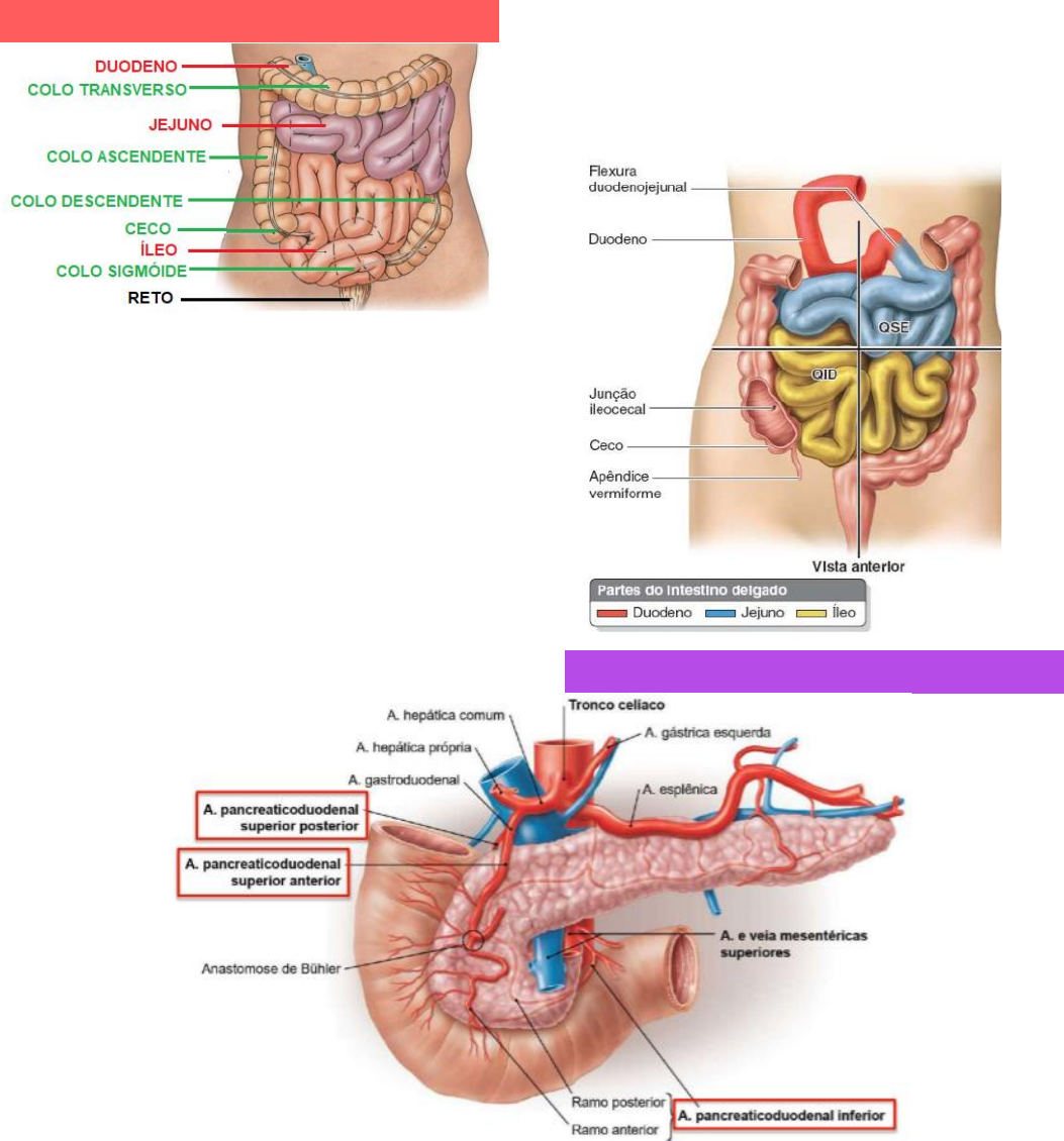 25/08 – FISIOPATO II Bloco GASTROINTESTINAL Intestino e suas Patologias ANATOMIA DO INTESTINO Extremamente grande É possível fazer ressecções Transplante extremamente delicado ➱ O intestino delgado atua essencialmente na digestão e na absorção de nutrientes ➱O intestino grosso é responsável pela condensação do conteúdo (pela reabsorção de água) e pela eliminação controlada das fezes. Funções dos intestinos ➱Transporte e fragmentação dos alimentos ➱ Digestão dos alimentos e absorção dos nutrientes ➱ Defesa imunológica ➱ Liberação de mediadores químicos e hormônios para a regulação da digestão ➱ Condensação do bolo alimentar ➱Armazenamento temporário e excreção controlada das fezes INTESTINO DELGADO - As veias possuem os mesmos nomes das artérias e drenam para a Veia Porta. - Os nervos do duodeno derivam do nervo vago e dos nervos esplâncnicos (abdominopélvicos) maior e menor por meio dos plexos celíaco e mesentérico superior. A drenagem venosa é realizada pelas veias jejunais e ileais, estas veias tributam na veia mesentérica superior, a qual irá se unir com a veia esplênica para formar a veia porta. - A linfa das alças intraperitoneais do intestino delgado é destinada para os linfonodos mesentéricos superiores, e depois destinada ao ducto torácico por meio dos troncos intestinais. - A linfa derivada do duodeno é conduzida dos linfonodos pancreaticoduodenais e dos linfonodos hepáticos, ao longo das artérias correspondentes, para os linfonodos celíacos ou, ainda, para os linfonodos mesentéricos superiores. inervação simpática chega através do plexo mesentérico superior por intermédio dos nervos: N. Esplâncnico Maior; N. Esplâncnico Menor; N. Esplâncnico Imo. - Inervação parassimpática provêm através do tronco vagal posterior. INTESTINO GROSSO - A linfa dos segmentos do intestino grosso “do lado direito” (ceco, colo ascendente e colo transverso) é destinada para os linfonodos mesentéricos superiores , e depois destinada aos troncos intestinais e ducto torácico - A linfa originada dos segmentos do intestino grosso “do lado esquerdo” (colo descendente, colo sigmoide e parte proximal do reto ) é drenada para os linfonodos mesentéricos inferiores , chegando aos troncos lombares e, então, ao ducto torácico HISTOLOGIA DO INTESTINO O que muda de fato é parte da mucosa, devido suas funções. ➱ MUCOSA: encontrado EPITÉLIO/tecido epitelial, LÂMINA PRÓPRIA (tecido conjuntivo frouxo) e Camada MUSCULAR da mucosa ➱ SUBMUCOSA: tecido conjuntivo denso não modelado e PLEXO NERVOCO (plexo submucoso) ➱MUSCULAR: interna – disposição das fibras é CIRCULAR (próximo da mucosa) e externa – disposição das fibras é LONGITUDINAL (próximo do meio externo). Entre uma camada muscular e outra, localizado o PLEXO MIOENTÉRICO. (A camada muscular é extremamente importante pois realiza PERISTALTISMO; ou seja, contração do órgão.) ➱ADVENTÍCIA: tecido conjuntivo frouxo ➱SEROSA: tecido epitelial pavimentoso simples = mesotélio Componentes intrínsecos da inervação ➱PLEXO MIOENTÉRICO e plexo nervoso: formam o sistema nervoso ENTÉRICO (é um componente INTRINSECO da inervação) – considerado o segundo cérebro. Do ESOFAGO ao final do INTESTINO GROSSO. ➱PLEXO SUBMUCOSO: um ou outro gânglio no esôfago e estomago, mais abundante no intestino delgado e grosso. INTESTINO DELGADO ➱ A partir do ESTOMAGO, no final de sua porção o alimento vira QUIMO e vai para o INTESTINO DELGADO, onde realiza um processo de DIGESTÃO ENZIMÁTICA, além de ABSORÇÃO de produtos da digestão. Isso ocorre graças as ESTRUTURAS que AUMENTAM A SUPERFICIE de CONTATO, que são as PREGAS CIRCULARES, VILOSIDADES e MICROVILOSIDADES. Após isso vão para o intestino grosso. ➱FUNÇÕES: - DIGESTÃO ENZIMÁTICA - ABSORÇÃO FINAL DE PRODUTOS: através das PREGAS CIRCULARES, VILOSIDADES e MICROVILOSIDADES. MUCOSA do intestino delgado ➱ PREGAS CIRCULARES: precisa da dobra das camadas mucosa e submucosa. ➱ VILOSIDADE: dobra/alonga apenas da MUCOSA (a partir da dobra) ➱MICROVILOSIDADE: encontrada na região apical da membrana. (a partir das vilosidades) CORTE HISTOLOGICO: - PREGAS: Ao se dobrar aumenta a superfície de contato: Dobramento da MUCOSA e SUBMUCOSA - VILOSIDADE: apenas a MUCOSA se alonga Além disso a camada MUCOSA do intestino delgado, sofre INVAGINAÇÕES. - Desceu vira: GLÂNDULA - Estendeu vira: VILOSIDADE INTESTINO DELGADO é formado por: ➱VILOSIDADE: predomínio das células ABSORTIVAS e células CALICIFORMES ➱GLÂNDULA INTESTINAL OU CRIPTA: especificas: CÉLULAS TRONCO, CÉLULAS DE PANETH e CÉLULAS ENTEROENDÓDRINAS exclusivas da cripta, além das células ABSORTIVAS, células CALICIFORMES. ➱Com EPITÉLIO COLUNAR/COLÍNDRICO SIMPLES CÉLULAS ABSORTIVAS ou ENTERÓCITOS - É a célula mais abundante - São COLUNARES ALTAS - Com um NÚCLEO OVAL BASAL - Com 3mil MICROVILOSIDADES em uma célula - FUNÇÃO: de SINTETIZAR as dissacaridases, peptidades, enteroquinase e lipase CÉLULAS CALOCIFORMES - Entre as células absortivas - Com NUCLEO BASAL PEQUENO - Tipo epitelial: glandular – com mucosa, com liberação de muco – do tipo exócrina - Vão AUMENTANDO o número em direção ao ILEO - FUNÇÃO: secretar MUCINA e gerando uma camada mucosa, com principal função de PROTEÇÃO e LUBRIFICAÇÃO CÉLULAS DE PANETH - Encontrados em abundância nas CRIPTAS - Especificamente na PORÇÃO BASAL das criptas - Com NÚCLEO BASAL - E o CITOPLASMA possui GRÂNULOS - FUNÇÃO: de liberar LISOZIMAS e a DEFENSINA (controle e defesa de bactérias) - IMUNIDADE INATA da MUCOSA - REGULAÇÃO da FLORA BACTERIANA do intestino CÉLULAS ENTEROENDÓCRINAS - São amplamente distribuídas no corpo. - Produzem vários HORMONIOS - Utilizado a imunohistoquimica - Ação ENDÓCRINA (em células distantes) - Encontrada: um poquinho nas vilosidades, porém com predomínio nas CRIPTAS CÉLULAS M – MICROFOLD - São c