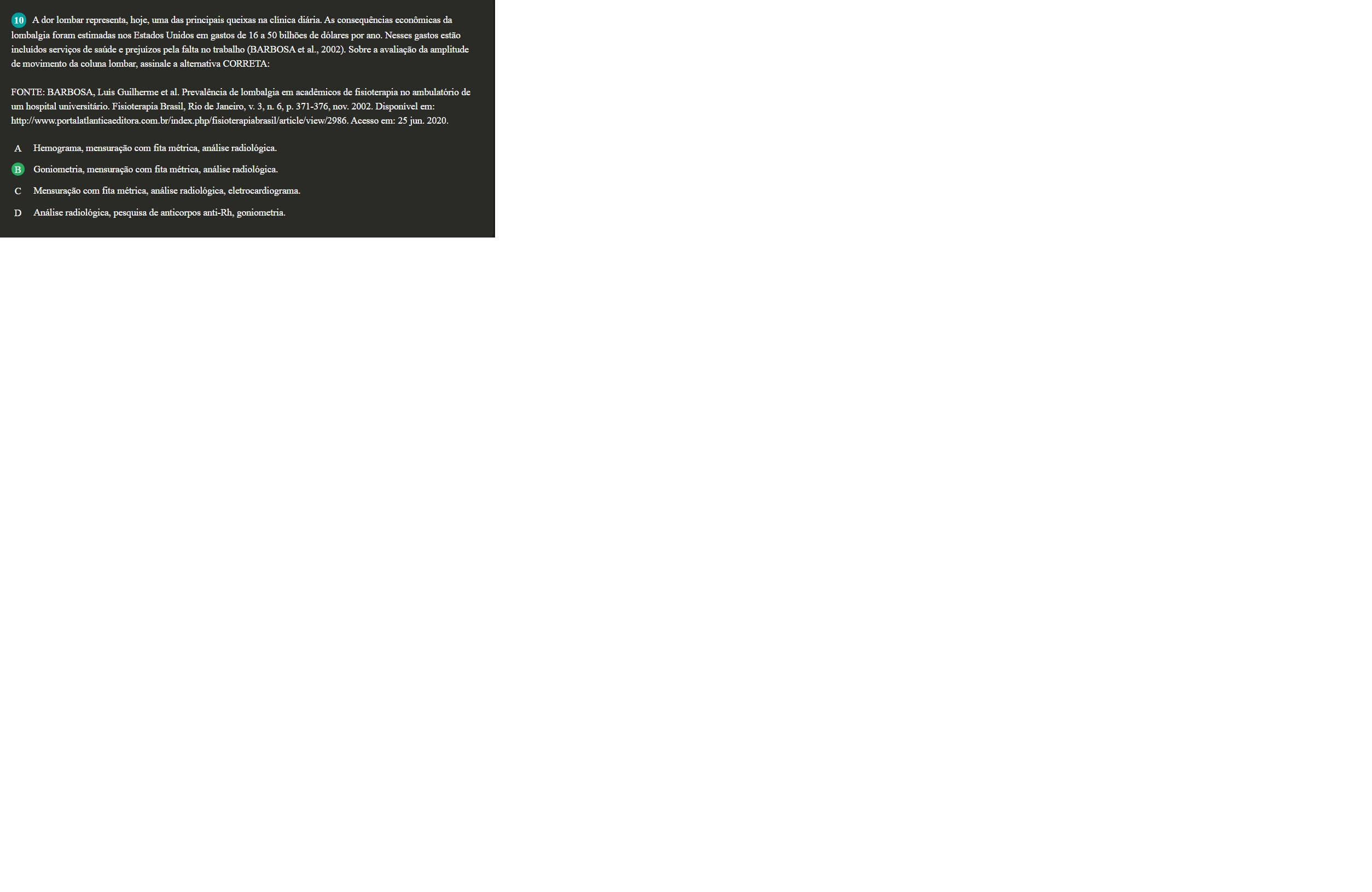 A dor lombar representa, hoje, uma das principais queixas na clínica diária. As consequências econômicas da lombalgia foram estimadas nos Estados Unidos em gastos de 50 bilhões de dólares por ano. Nesses gastos estão incluídos serviços de saúde e prejuízos pela falta no trabalho (BARBOSA et al., 2002). Sobre a avaliação da amplitude de movimento da coluna lombar, assinale a alternativa CORRETA: A Hemograma, mensuração com fita métrica, análise radiológica. B Goniometria, mensuração com fita métrica, análise radiológica. C Mensuração com fita métrica, análise radiológica, eletrocardiograma. D Análise radiológica, pesquisa de anticorpos anti-Rh, goniometria.