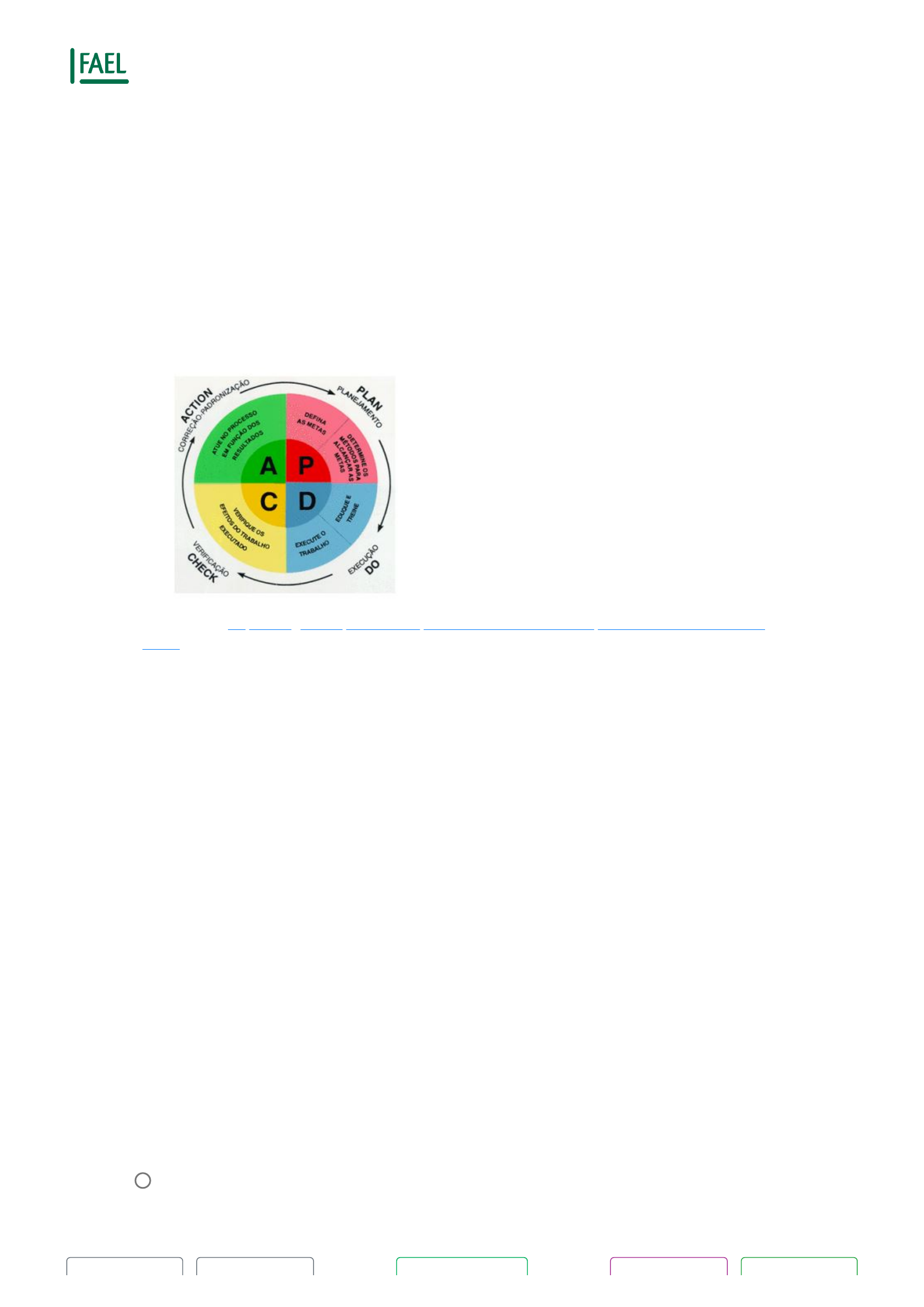 30/08/2021 Firequiz firequiz.fael.edu.br/prova?question_number=2 1/2 Resultado Aluno: Gustavo Pereira de Souza Prova de Teoria Geral da Administração - Exercício do Conhecimento - Tentativa 1 de 2 Questão 2 de 5 Podemos veri�car que toda e qualquer empresa é formada por pessoas, tecnologia e processos! Os processos de�nem as rotinas do ambiente corporativo, sejam eles dos setores de suporte ou setores responsáveis pelas atividades �ns da Organização. Disponível em: https://blogadmnapratica.wordpress.com/2016/08/30/ciclo-pdca-melhoria-continua-na- gestao/ Acessado em 08 Dez.2019 (adaptado). A ilustração acima demonstra as funções do administrador e representa um ciclo criado por Walter Andrew Sherhart, apresentado por Deming que o incluiu em seu sistema de melhoria da qualidade. É importante saber, que atualmente, é utilizado por toda a organização, não apenas pela equipe de qualidade. Veja cada etapa do ciclo: P – Planejar: No ano de 2020; nossa organização tem por objetivo aumentar no Market share em 15%, buscando uma rentabilidade de 5%. Para alcançar esses objetivos teremos um aumento de dois novos colaborados na área comercial. D – Executar: Para não haver retrabalho, é necessário que todas as etapas do processo sejam realizadas da maneira correta. O erro implica em repetição. A repetição traz prejuízo a nossa organização. C – Veri�car: Fechamento do 3° trimestre. Foi possível identi�car um crescimento de 5% em receita em relação ao mesmo período de 2018, entretanto, houve um aumento de 3% nos custos operacionais. A – Ação: O agir, está associado a realização da atividade de uma organização para que todos conheçam a atividade a ser executada; ela deve estar descrita em um local de fácil acesso. Com relação as de�nições do ciclo PDCA é correta a�rmar que: A - A de�nição planejar está correta. B - As de�nições executar e ação estão corretas. C - As de�nições planejar e ação estão corretas. D - As de�nições planejar e veri�car estão corretas. Resposta correta E - As de�nições planejar, executar e veri�car estão corretas. Questões Referência Reportar erro Avançar https://blogadmnapratica.wordpress.com/2016/08/30/ciclo-pdca-melhoria-continua-na-gestao/ http://firequiz.fael.edu.br/prova?question_number=1 http://firequiz.fael.edu.br/prova/questoes 30/08/2021 Firequiz firequiz.fael.edu.br/prova?question_number=2 2/2 Voltar Questões Referência Reportar erro Avançar http://firequiz.fael.edu.br/prova?question_number=1 http://firequiz.fael.edu.br/prova/questoes