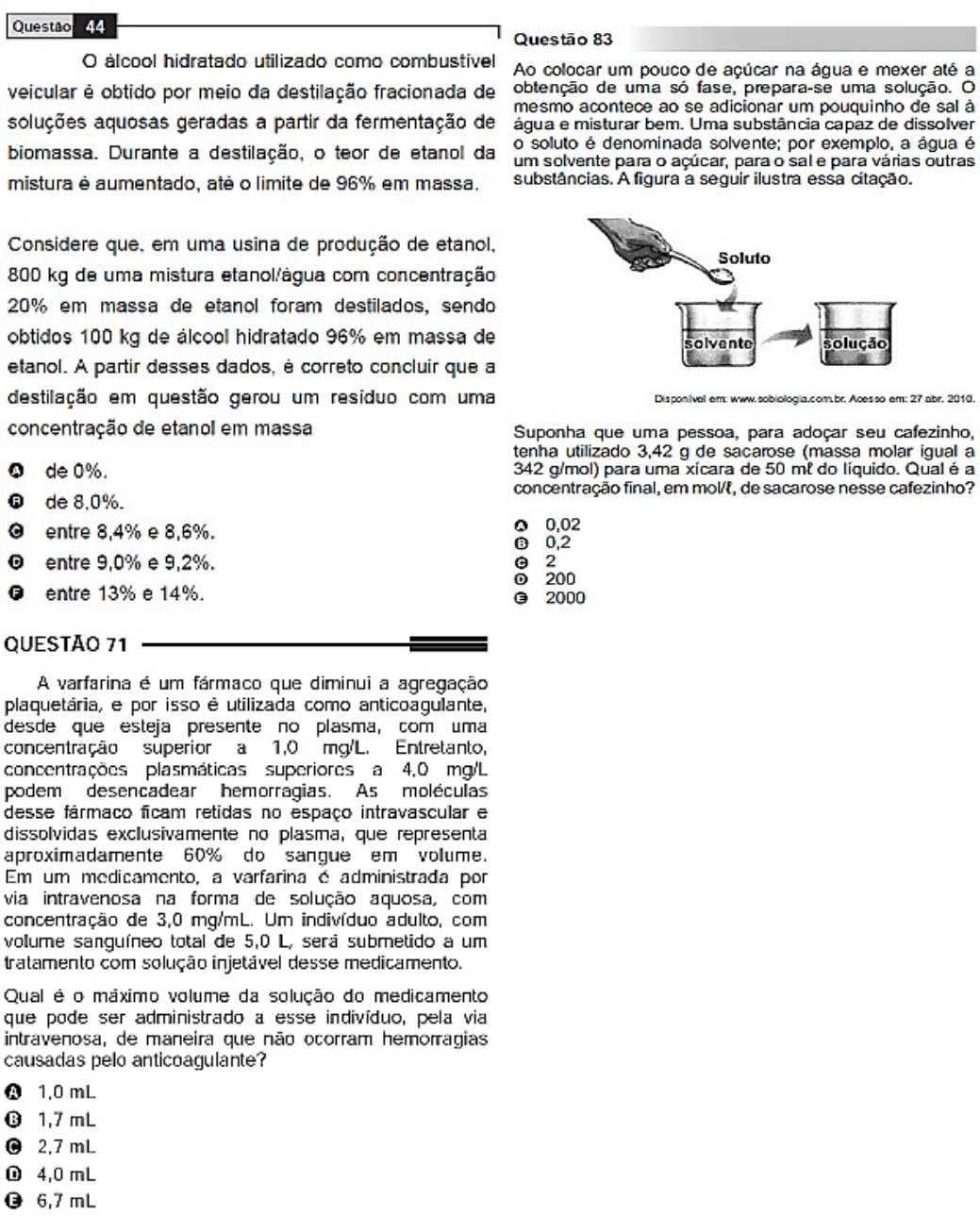 1) (Unicamp-2002) A cana-de-açúcar, o engenho, o açúcar e a aguardente estão profundamente vinculados à história do Brasil. A produção de açúcar era feita, originariamente, pela evaporação da água contida na garapa, submetendo-a a aquecimento. A solubilidade do açúcar em água é de 660 g/litro de solução a 20o C. A garapa contém, aproximadamente, 165 g de açúcar por litro e sua densidade é 1,08 g / cm3 . Considere a garapa como sendo solução de açúcar em água. a) Qual é a percentagem, em massa, de açúcar na garapa? b) A que fração deve ser reduzido um volume de garapa a fim de que, ao ser esfriado a 20oC, haja condições para a formação dos primeiros cristais de açúcar? 2) A popular maionese caseira é formada pela mistura de óleo, limão (ou vinagre) e gema de ovo; este último componente tem a função de estabilizar a referida mistura. Esta mistura é um exemplo de: a) solução verdadeira concentrada; b) solução verdadeira diluída; c) uma dispersão coloidal do tipo gel; d) uma dispersão coloidal do tipo emulsão; e) um gel que sofreu uma peptização. 03) Qual das misturas abaixo exemplifica uma dispersão coloidal? a) Soro fisiológico. d) Água sanitária. b) Ácido muriático. e) Álcool hidratado. c) Leite pasteurizado.
