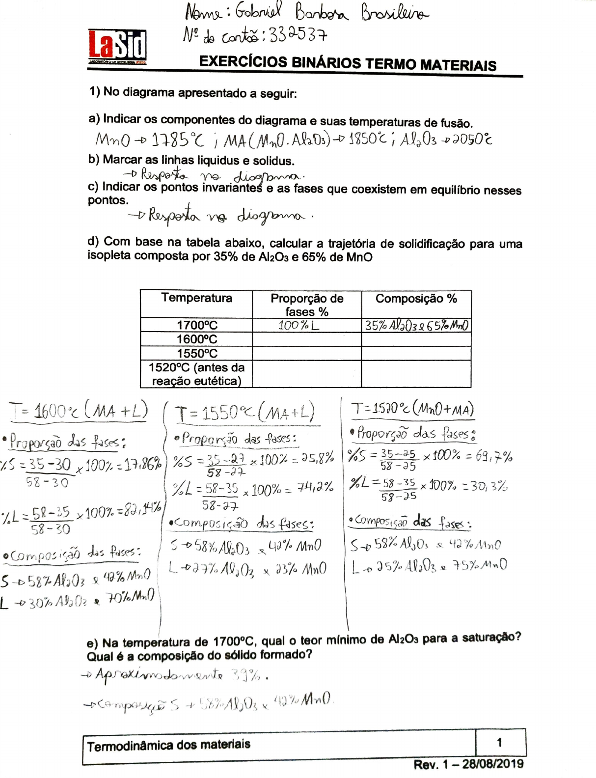 Nowng.: Grwbni Barbara brolire N s Cand:3353 EXERCÍCIoS BINÁRIOS TERMO MATERIAIS LaSid 1) No diagrama apresentado a seguir: a) Indicar os componentes do diagrama e suas temperaturas de fusão. Mn0- 1185C ) MA(M»0.A%0s)-> 1g50i AI,03 »050 b) Marcar as linhas liquidus e solidus. Renpoo c) Indicar os pontos invariantes e as fases que coexistem em equilíbrio nesses pontos. Rspelo ve dionowno d) Com base na tabela abaixo, calcular a trajetória de solidificação para uma isopleta composta por 35% de Al2Os e 65% de MnO Temperatura Proporção de fases % 1007L Composição % 35% AV3039 65%Mm0 1700°C 1600°C 1550°C 1520C (antes da reação eutética) |_ T-1600MA + T= 1550(MA*L)T150% (Mn0+MA) Proporgao das fases Praporsao das ft Proparsã0 das fasesS: S25-30 , 1007, 19.62%5 =5-100% 95,7% S = x100% = 63,2% 53-30 S2 -29 ZL:58-35, 100%= 74,3% |Z 35o07. -30, 3% 53-3 58-2 5 l 5-5 1007.-80.MA| -30 Composio das fases Composis0 däs fases S587 AN,Os « 40%Mn0 58%A0,03407 Mn0 L397.A9,02 x 37. Mn) L39 57. A9O3 « *57Mn0 Comp0sia0 da tases S-587A,0p 49%r.) L +30%A,0e %M.O e) Na temperatura de 1700°C, qual o teor minimo de Al2Os para a saturação? Qual é a composição do sólido formad0? Apraxiyoorwimle1% po S + S6AN Oy 19 Mn 1 Termodinâmica dos materiais Rev. 1-28/08/2019 Nema: Gakni! Bonsen Brovloe N cov: 33253 LaSid EXERCÍCIos BINÁRIOSTERMO MATERIAIS )Qual a temperatura de fusão da composição X no diagrama? 1665 C 2050 vw-ogmu ISaliJu 2000 iQUidos 18500 L 1800785° AlOs +L MAL MA+L 1770 MnO 1600 t SOiWs 1520 1400 Mno MA+Al2O3 MA MnO 2030 40 60 80 AlO3 53 Wt % PONTOSINVARTANTES P1L Q Mn0 + MA Pa-L MA + AR,02 Termodinâmica dos materiais 2 Rev. 1-28/08/2019 Nerme:Gbni Bonbe Barhir N de Cond:33a53 LaSid EXERCÍCIOS BINÁRIOS TERMO MATERIAIS 2. Considerando o diagrama binário SiO2- Al2Os Mole fraction Alz03- 0.2 Al203 Si02 01 03 04 05 06 07 08 09 10 2100 b) 2000 Liquid 1900- Corundum FFn Srterna uenk 1815Liquid 1800cristobalite 1700 iquid Corundum+ Mullite Mullite-Liquid T1550 1600 1500 Cristobalite+ Mullite 1400 010 20 30 40 50 60 70 80 90 100 Si02 Mullite Weight /o AlzU3i Al203 a) Quais são os compostos formados e suas temperaturas de fusão? CRTSTO B I TA - 1730 MULITA1815' CORTDOW- 3050< b) Quais são os pontos invariantes do diagrama? Mostre as reações. Qual a composição da fase líquida nesses pontos? 11550(11% AD-03) -Liguids susbalta + Mulia leutshica); 2 1915(5% AY0:) = Ligd 5 Mulits + Liguck c) Indique se o diagrama tem compostos com fusão congruente ou incongruente: *T ts dntanvquuente (1315', 917AR303 , Malta Cáucon tigue) Tem wo CavauRmts (1550%, 117. AY03,Cnusokolla +Mult <La d) Para a composição bruta de 70% Alz03, quals são as fases fomadas a 2000 e 1900°C? Qual a fração das fases? 3000 100% Lguido i -D7,Cenicom = 1,28% 1100 Cdon tliqucb. Ligud 100 -90 Termodinâmica dos materiais 3 Rev. 1-28/08/20199 Newna Grkre barboro Browbire Nd Gnks: 33953 EXERCÍCIOS BINÁRIOS TERMo MATERIAIS aSid e) Para a composição bruta de 70% Al203 o que acontece a 1815°C? Expliqueo mecanismo. conu sma umha de ovLod da oR m quR a mula N ommmo ve Coniden : Mlila +Ligquwcs- Cenden +Liguib Um fabricante de refratários possui dois tipos de tijolos: Tijolo A 70% Al2Os 30% SiO2 Tijolo B 90% AlLOs 10% SiO2 Qual dos dois resiste à temperatura de 1600°C? Porque? tiple B iro rein pois os aes prwodos naya JBwparura cmpenico se naludos (Cáricbm+ Muuta. u e tiiee A oprasntord, wwo Pp de p lignhluluiat Termodinamica dos materiais Rev. 1-28/08/2019 Nema Gohnilborbea Broletre aSid Nde Cont:33053+ EXERCÍCIoS BINÁRIOS TERMO MATERIAIS 3. Do diagrama abaixo, identifique: Mole fraction Mgo 04 0.6 1,0 2 2500 L Z1o0 wemana*******e**an Schenck, Ptof - Shin, Bor-Ye ** w** 1900 Scheel 1300 Fe,Mgio8 1600 4560 AGO 3003 68 15 Feo a0 100 Mea Wioss Mg0 a) Escrever as temperaturas de fusão a) Mgo.22°L b) FeO.. aronsses*e*e***. b) Considerando o binário isomorfo da figura acima, pergunta-se qual a composição da fase sólida formada em 1700°C na concentração de 20% MgO. Qual a temperatura de fusão dessa mistura? s 30- -3X7p1,13% FeO 10,08% MgO Topuouwa da w 1900. c) Nas temperaturas de 1500°C, 1550°Ce 1600°C. qual é a saturação do MgO em llquido? T 1500" -o 4» da Mg0. T 1550 67% d Mg0. T 600 87 da 0. Termodinâmica dos materiais 5 Rev. 1-28/08/2019 Nerwa:Fbriel Bonber Bnokoire Nee cont6: 33253 EXERCÍCIoS BINÁRIOS TERMO MATERIAIS LaSid 4. Indicar no diagrama Mgo-SiO2 2872 2600 o O 3530 2200Oo oo 725 1890 R3 1800 70 1695 1600 470 400 1000 40 Bo 100 Mgo sio, % SiO a) Os pontos invariantes, a composição e as temperaturas do mesmo, PL-1830L(387% Si Oa), Pa 1S5 (617, SA03) , P3+1543C((SADa). 45°e (11% SAO), ) A saturação de MgO no liquido a 1600, 1700 e 1800°C. 1600%- 41% 1900°C 45 13002 - 4870. c) Os campos de precipitação primária. upe (S Proapdoo fhuini) d) Para um composto com 20% SiO2, indique: - a temperatura de fusão: 590°C -a fraçãoe composição das fases a 2000°C: L -0 59,55% 36-J0 145% 3-0 - a composição do primeiro sólido formado: No- D-37 -o campo de precipitação secundária: 6 Temodinâmica dos mateñais Rev. 1-28/08/2019 Nema: Gobrid Brkea. Broloire aSid N de Cont: 33a53 EXERCÍCIOS BINÁRIOS TERMO MATERIAIS 5. No diagrama abaixo, indicar: 2.400 Liquido OLia 2.13 CaSi0,+ Liq= 2.000 2.050° CaysiOs+ Liq. Dois Liquidos 1705 Ca,sio,+ aCa,Sio CaySiO,+Liq. 1.544 NAA2 1.4S0 | 1.460 a-Casip 1.600K CSi0 Cay$i0, + -Ca,$iO,- 1,436 CaySiOs+Cao Tridimita + Liquido aCaSiO+ Liq. 1.250° 1.200 Tridimita+ Pseudovolastonita L.125° Ca,Si,0,| (C-CaSiO) a-Casio+ Cao BCaSo Tridimita+ Volastonita (BCaSio) 870 + Ca,Si 800 CaySi,0,+7+ Ca,SiO, a- Quartzo +Volastonita , r-Ca Sio+Cao SiO2 10 90 CaO CaO Sio 3Ca0 2Si0, 2Ca0 Si0, 3CaO Sio a) Temperatura de fusão do Ca0: TE 0590'%. b) A saturação máxima do líquido em CaOa 1600°C: urce mouwa=57o d Ca0. c) Cite dois compostos com fusão congruente: ¥o0.Si0a -oTE= 1544 C0.SA0a Te:2130%. d) Cite dois compostos com fusão incongruente: 3).I