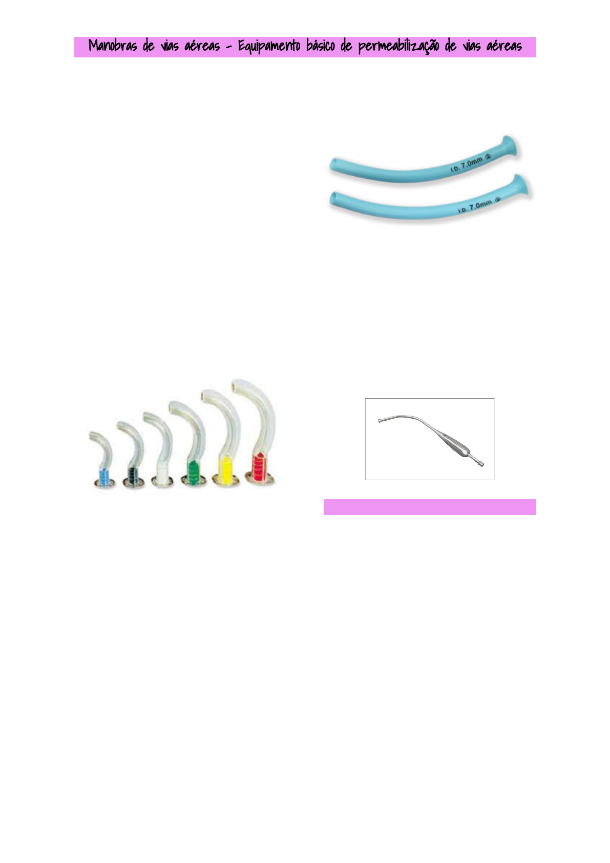 Manobras de vias aéreas - Equipamento básico de permeabilização de vias aéreas A utilização dos equipamentos permite manter as vias aéreas permeáveis. 1. Cânulas orofaríngeas (Guedel): plástico ou borracha, sua função é evitar a queda da língua sobre a parede posterior da faringe e permitir a aspiração. Só deve ser utilizada em pacientes inconscientes e com ausência de reflexo de proteção da via aérea. A cânula deve ser adequada às dimensões da vítima,comparando a distância entre a comissura labial e o ângulo da mandíbula.Deve ser introduzida com o lado côncavo para cima e efetuada rotação de 180º quando a extremidade distal atingir o palato mole. 2. Cânula nasofaríngea: tubo macio com 15 cm de comprimento de borracha ou plástico. É indicado em pacientes com trismo, no entanto, é contraindicado em traumas faciais ou crânio. O tamanho ideal deve ir ângulo da mandíbula na narina. Introduzida pela narina, após ser lubrificado com geléia anestésica. 3. Aspiração das vias aéreas: a finalidade é remover sangue, vômito e de outros materiais. Os aspiradores podem ser rígidos ou flexíveis. Dispositivos para oferta de O2 1. Cateter O2: inserção do cateter pelo nariz, sendo a primeira opção.Usado em casos menos graves e para baixos fluxos (max 5L/min). Cada L/min aumenta em 3-4% a saturação de O2 (FiO2). 2. Máscara de venturi: mistura de ar e oxigênio. Uso em altos fluxos O2 (3-15L). O paciente está dessaturando com FiO2 menor que 90% precisa (24-50%). Manobras de vias aéreas - Equipamento básico de permeabilização de vias aéreas 3. Máscara não reinalante: não é encontrado em todo PS.É composta por uma bolsa inflável que armazena O2 e contém uma válvula unidirecional (O2 só vai na inspiração). Usada em altos fluxos O2, havendo uma alta FiO2 (60-90%). Usada em casos de hipoxemia grave. 4. Bolsa-válvula-máscara (AMBU): semelhante à máscara não reinalante. Oxigenação com O2 alto fluxo. Ventilação manual, é o médico que oferece o O2 e não o paciente que inspira, como a descrita anteriormente.