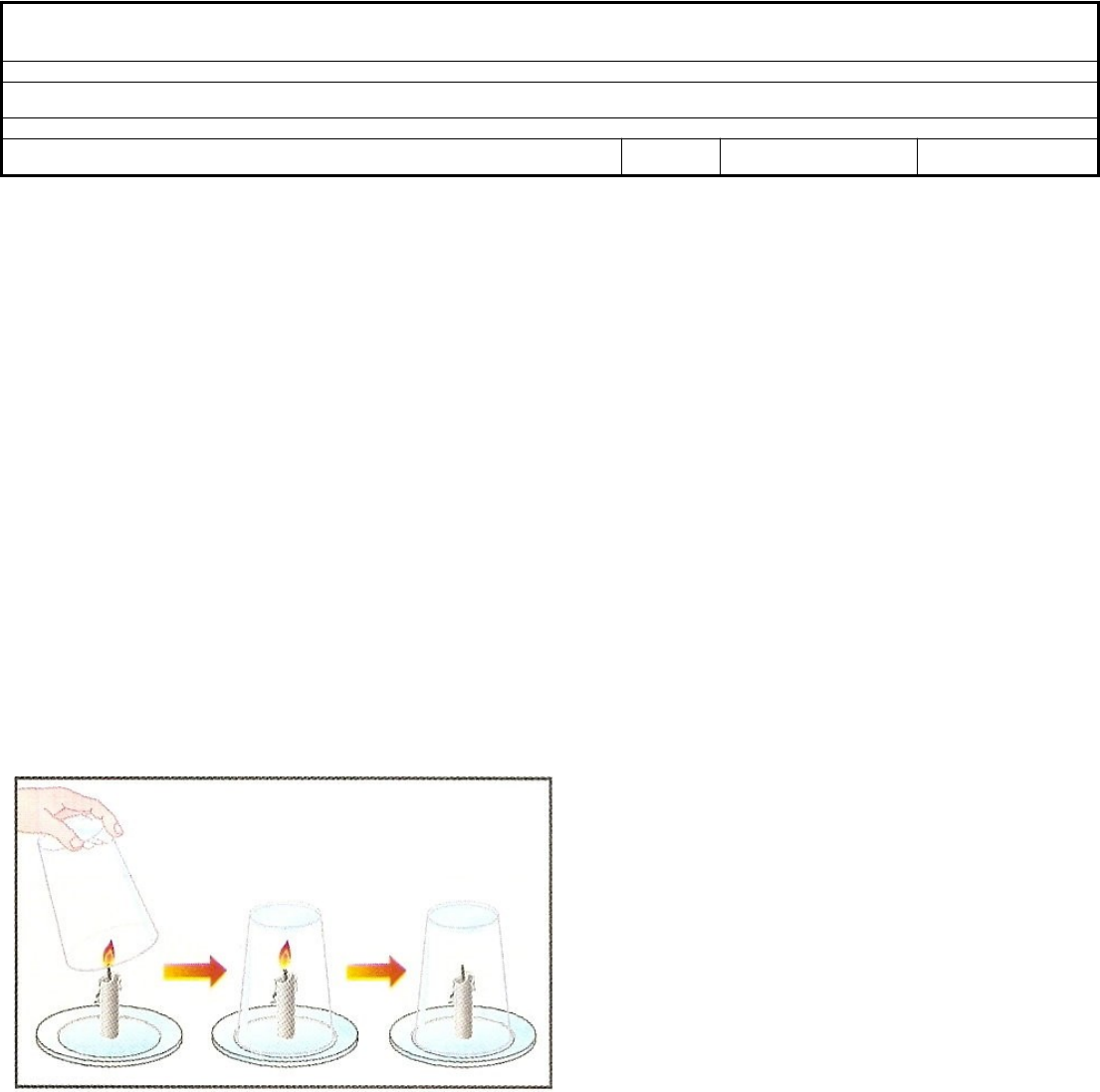 Secretaria Municipal de Educação - Prefeitura Municipal de Rio das Pedras – SP Escola Municipal “Agela Regina Sacaro Oriqui” Docente: Renan Bastos Componente Curricular: Ciências Físicas e Biológicas Conteúdos: Ar atmosférico Nome do aluno: Nº Ano/Série Data: 01) Leia as frases e reescreva as corretamente: a) O ar não pode ser comprimido. b) o oxigênio é o gás que forma o ar. 02) Relacione as colunas abaixo: I- Gás oxigênio ( ) Indispensável para o processo de fotossíntese II- Gás nitrogênio ( ) Indispensável para a respiração da maioria dos seres vivos e para a combustão. III-Gás carbônico ( ) Está envolvido na regulação do clima, formação das nuvens e da chuva. IV- vapor –d’água ( ) Gás mais abundante na atmosfera. 03) Uma vela acesa, após ser tampada por um copo, apaga-se como mostra a figura. a) Por que isso ocorre? b) Ainda existem gases dentro do copo? Explique. Leia o trecho a seguir: “A chuva ácida pode ser responsável pela corrosão de pedra, metal ou tinta. Praticamente todos os materiais se degradam gradualmente quando expostos à chuva e ao vento. A chuva ácida acelera esse processo, destruindo estátuas, prédios ou monumentos. É importante saber que reparar os estragos causados pela chuva ácida em casas e prédios pode ser extremamente caro; além do mais, muitos monumentos encontram-se já muito degradados e a sua recuperação ou substituição muitas vezes é impossível. ” Uma das principais causas da chuva ácida é a queima de carvão mineral e outros derivados do petróleo, produzindo certos gases que, combinados com a água da atmosfera, formam ácidos. http://www.uenf.br/uenf/centros/cct/qambiental/ar_chuvacida.html 04) Quais a consequências da chuva ácida no meio ambiente? 05) Como é formada a chuva ácida? 06) Certamente você já deve ter visto uma reação de combustão acontecer. Para que ela ocorra, é necessária a presença de alguns elementos, caso contrário, não há combustão. No caso da figura ao lado, quais são esses elementos e qual a função deles para que ocorra a reação? Responda à questão, ilustrando com o triângulo do fogo. 07) Na tirinha, a Magali propõe a plantação de árvores como uma opção para melhorar o cenário do aquecimento global. De acordo com o nosso aprendizado, explique qual a relação entre o plantio de árvores e a diminuição do aquecimento global. 08) Analise as frases a seguir e diga em qual delas a palavra tempo é utilizada no sentido de tempo atmosférico. a) A previsão do tempo hoje para o Rio de Janeiro é de sol entre nuvens. b) A civilização egípcia se desenvolveu em um tempo muito diferente do atual. c) Não terminei a prova porque não tive tempo. d) Faz muito tempo que não chove em Petrópolis.