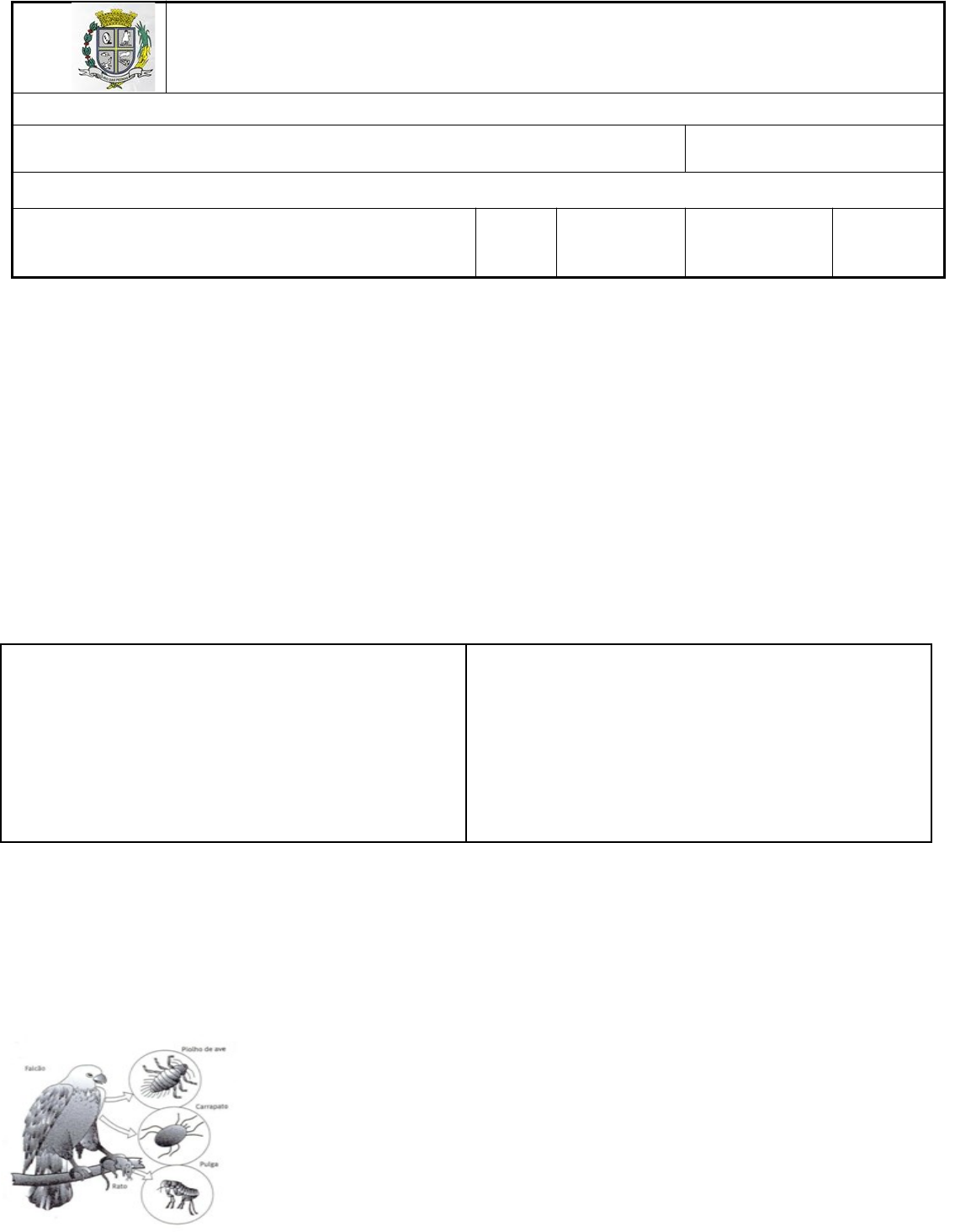 Prefeitura Municipal de Rio das Pedras – SP Secretaria Municipal de Educação Escola Municipal “Contador Waldomiro Domingos Justolim” Docente: Renan Bastos Componente Curricular: Avaliação Bimestral de Ciências Responsável: Valéria Conteúdos: Reinos: Cadeias alimentares, teias alimentares, relações alimentares entre os seres vivos. Nome do aluno: Nº Ano/Série Data: Nota: 01- Leia o texto abaixo e depois responda às questões. Pesquisadores advertem que as onças-pintadas podem ser extintas em cinco anos, se a ação de caçadores e fazendeiros da região não for impedida. Esse predador se alimenta de capivaras, pacas e tatus, herbívoros frequentes naregião. Um sinal de que as onças-pintadas estão desaparecendo é o fato de onças-pardasjá serem encontradas com maior frequência, pois as espécies lutam pelo mesmo território. (Jornal O Globo, 26/3/2001. Texto adaptado.) a)Como se chama a relação entre onças e capivaras? b)Como se chama a relação entre as onças-pintadas e as onças pardas? 02-Relacione as colunas de acordo com os tipos de relações: 1. Protocooperação 2. Comensalismo 3. Predatismo 4. Parasitismo 5. Competição ( ) Pássaro catando carrapatos do boi ( ) Onça matando e comendo uma capivara ( ) Luta entre dois machos da mesma espécie ( ) Lombriga alimentando-se no intestino Humano e causando doenças ( ) Rêmora comendo restos de comida do tubarão 03- Observe a figura: Identifique as relações ecológicas estabelecidas entre e justifique sua resposta: a) O falcão e o rato: b) O carrapato e o piolho que vivem no falcão: c) A pulga e o rato: 04- A seguir você encontrará várias informações sobre o relacionamento entre os seres vivos. Avalie cada uma delas, assinale com V as afirmativas verdadeiras e com F as falsas. a) ( ) Uma sociedade é composta por um grupo de indivíduos da mesma espécie que vivem juntos cooperando entre si. b) ( ) Quando existe uma relação obrigatória entre duas espécies diferentes e que traz benefícios para as duas, esta relação é chamada mutualismo. c) ( ) Sempre que um organismo se beneficia sem que o outro tenha qualquer ganho ou prejuízo, a associação é chamada competição. d) ( ) A lombriga é um organismo que se instala no corpo do outro para extrair alimento, mas não lhe causa prejuízo. e) ( ) Predatismo é uma maneira exclusiva de combater os organismos que prejudicam algumas plantações usando o seu predador natural. 05- Analise a imagem abaixo em seguida responda os itens I e II. I) Que posição ocupa a criança A? a-( ) Consumidor primário. b-( ) Consumidor secundário. c-( ) Consumidor terciário. d-( ) Consumidor quartenário. II) Que posição ocupa a criança B? a-( ) Consumidor primário. b-( ) Consumidor secundário. c-( ) Consumidor terciário. d-( ) Consumidor quartenário. 06-De acordo com a imagem abaixo responda: Classifique os animais em: Produtor: Herbívoro: Carnívoros: Decompositores: 07) preencha a tabela com os animais abaixo: ANIMAIS ONÍVOROS ANIMAIS HERBÍVOROS ANIMAIS CARNÍVOROS .......................................... ............................................. ............................................. ............................................. ................................................... ................................................... ................................................... ................................................... ...................................................... ...................................................... ...................................................... ...................................................... Peixes – canguru – tartaruga – coruja – escorpião – capivara – porco – tucano- zebra- ovelha- Crocodilo-lobo-raposa-gambá- quati- ema. 08) Marque V se a afirmativa for verdadeira e F se a afirmativa for falsa: ( )Os animais se alimentam para ter energia e alimento necessários a sua sobrevivência. ( )Herbívoros são animais que se alimentam de vegetais e outros animais. ( )O macarrão é um alimento de origem vegetal. ( )Alimentos que nos fornecem energia são chamados de energéticos, um exemplo é o ovo. ( )Quilocaloria é a unidade utilizada para medir a quantidade de energia fornecida por um alimento. ( )Animais onívoros se alimentam tanto de vegetais quanto de outros animais.