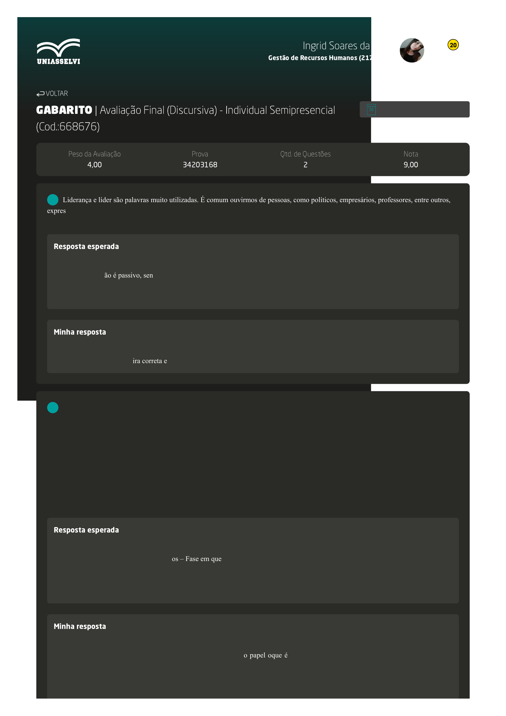 31/08/2021 AVA https://ava2.uniasselvi.com.br/subject/grades-and-tests/answer-book/eyJ0ZXN0Ijp7InRlc3RDb2RlIjoiNjY4Njc2IiwiZGVzY3JpcHRpb24iOiJBdmFsaWHDp8OjbyBGaW5hbCAoRGlzY3Vyc2l2YSkgLSBJbmRpdmlkdWFs… 1/2 GABARITO | Avaliação Final (Discursiva) - Individual Semipresencial (Cod.:668676) Peso da Avaliação 4,00 Prova 34203168 Qtd. de Questões 2 Nota 9,00 Liderança e líder são palavras muito utilizadas. É comum ouvirmos de pessoas, como políticos, empresários, professores, entre outros, expressões como: "esse menino é um líder", "esse político não tem nenhuma liderança". Disserte sobre o que é preciso para que ocorra a liderança. Resposta esperada Para ocorrer a liderança é preciso que uma pessoa influencie outra em suas atividades ou comportamento. Isso significa que o comportamento não é passivo, sendo a influência projetada para alcançar um determinado fim. Portanto, podemos entender o termo como a capacidade de influenciar pessoas ao alcance de metas organizacionais, sendo a liderança recíproca. A liderança deve ocorrer de modo não coercitivo para levar o grupo a realizar o que antes foi determinado. Minha resposta Para ocorrer uma liderança de sucesso, é preciso que o líder tenha uma boa comunicação com os funcionários a serem liderados, saiba motivar os demais da maneira correta e alinhar todos para um mesmo objetivo em comum. Gestão do conhecimento é o conjunto de esforços que, sistematizados, desenvolvem a criação de um novo conhecimento. A gestão do conhecimento auxilia na otimização de produtos e serviços e, ainda, na prevenção do uso inadequado. Dentro das empresas, a gestão do conhecimento pode ser utilizada como uma vantagem competitiva, tudo através da gestão correta das informações e ainda através de determinadas etapas de construção. Nonaka e Takeuchi (apud LOCHA; ASHLEY, 2008) desenvolveram um modelo que explica a construção do conhecimento organizacional em cinco etapas: (1) compartilhamento do conhecimento tácito; (2) criação de conceitos; (3) justificativa dos conceitos; (4) construção de arquétipos; (5) difusão interativa do conhecimento. Portanto, disserte sobre essas etapas da construção do conhecimento organizacional. FONTE: LOCHA, Marta Lucia Marinatto; ASHLEY, Patrícia Almeida. Gestão por Competências: Um estudo e proposta de modelo alinhado à gestão do conhecimento e objetivos estratégicos organizacionais. VI Encontro Nacional de Excelência em Gestão, 2008. Resposta esperada Compartilhamento do conhecimento tácito – Fase em que existe a troca entre os colaboradores dos aprendizados e práticas, em busca de um mesmo propósito. Criação de conceitos – Fase em que se colocam no papel as práticas necessárias para desenvolver os princípios para a organização. Justificativa dos conceitos – Fase em que há uma análise dos conceitos, a fim de identificar se eles estão alinhados com o propósito da organização. Construção de arquétipos – Fase em que o projeto é aplicado na empresa, deixa de ser intangível para se tornar tangível. Difusão interativa do conhecimento – Fase de aprovação e inovação de novos projetos. Minha resposta Compartilhamento do conhecimento tácito: Fase de troca de conhecimento entre os colaboradores da empresa, todos em busca de um mesmo objetivo. Criação de conceitos: Fase em que se coloca no papel oque é necessário para para desenvolver os elementos de uma organização. Justificativa dos conceitos: Fase em que é analisado os conceitos, verificando se estão de acordo com o propósito da empresa. Construção de arquétipos: Fase em que o projeto é colocado em prática. Difusão interativa do conhecimento: Fase de aprovação de projetos e criação de novos projetos. VOLTAR Alterar modo de visualização 1 2 Ingrid Soares da Silva Gestão de Recursos Humanos (2173772) 20 31/08/2021 AVA https://ava2.uniasselvi.com.br/subject/grades-and-tests/answer-book/eyJ0ZXN0Ijp7InRlc3RDb2RlIjoiNjY4Njc2IiwiZGVzY3JpcHRpb24iOiJBdmFsaWHDp8OjbyBGaW5hbCAoRGlzY3Vyc2l2YSkgLSBJbmRpdmlkdWFs… 2/2 Ingrid Soares da Silva Gestão de Recursos Humanos (2173772) 20