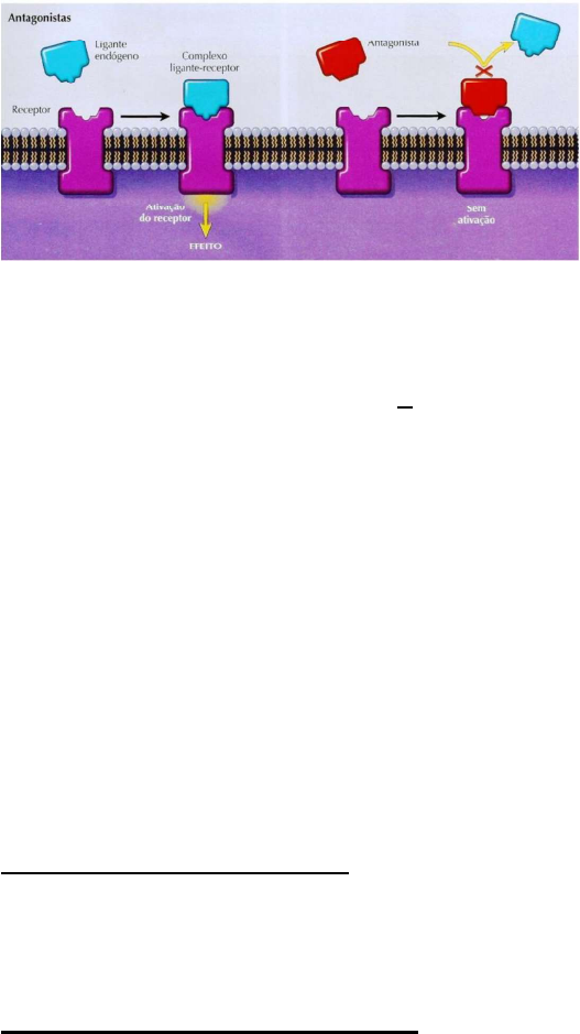 Antagonista - Fármaco ou composto-protótipo que apresenta efeitos fisiológicos ou farmacológicos opostos a outro. Ao nível do biorreceptor, é a entidade química que bloqueia as respostas associadas ao agonista. É planejado para bloquear o mensageiro natural. Antagonistas possuem grande afinidade pelo sítio ligante, promovendo a formação de um complexo ligante + sítio ligante muito estável. Porém, a ligação não leva a modificação na proteína a fim de disparar o efeito biológico. Os antagonistas podem ser categorizados com base na sua ligação a um sítio do receptor para o agonista (antagonistas dos receptores) ou interrupção da sinalização do complexo agonista receptor por outros meios (antagonistas sem receptores). Os antagonistas de receptores também podem ser divididos em antagonistas reversíveis e irreversíveis. Os antagonistas sem receptores podem ser classificados em antagonistas químicos e antagonistas fisiológicos. Os antagonistas dos receptores podem ligar-se ao sítio do agonista (ativo) ou a um sítio alostérico no receptor; em ambos os casos, eles não afetam a atividade basal do receptor (isto é, a atividade do receptor na ausência do agonista). Os antagonistas dos receptores no sítio do agonista (ativo) impedem a ligação do agonista ao receptor. Antagonistas competitivos: competem com o ligante pela sua ligação ao sítio agonista; a presença de altas concentrações do agonista pode superar o antagonismo competitivo. Antagonistas não-competitivos: ligam-se de modo covalente ou com afinidade muito alta ao sítio agonista, de modo que até mesmo concentrações elevadas do agonista são incapazes de ativar o receptor. Antagonistas alostéricos: ligam-se ao receptor em um local distinto do sítio agonista. Não competem diretamente com o agonista pela ligação ao receptor, porém alteram a constante de dissociação para a ligação do agonista ou inibem a resposta do receptor à ligação do agonista. Em geral, a presença de concentrações elevadas do agonista não é capaz de reverter o efeito de um antagonista alostérico. O antagonista sem receptor não se liga ao receptor do agonista; entretanto, inibe a capacidade do agonista de iniciar uma resposta. Em nível molecular, essa inibição pode ocorrer através da inibição direta do agonista (por exemplo, utilizando anticorpos), ou através da ativação de uma via que se opõe à ação do agonista. Os antagonistas sem receptores podem ser classificados em antagonistas químicos e antagonistas fisiológicos. Antagonistas químicos: sequestram o agonista e, por conseguinte, impedem a interação do agonista com o receptor. Inativam o agonista antes de ele ter a oportunidade de atuar. Antagonistas fisiológicos: induzem uma resposta fisiológica oposta àquela do agonista, porém através de um mecanismo molecular que não envolve o receptor do agonista. REFERÊNCIAS http://www.iq.ufrgs.br/biolab/images/courses/aula11-12.pdf https://medpri.me/upload/texto/texto-aula- 1066.html#:~:text=No%20estudo%20da%20farmacodin%C3%A2mica%2C%20 os,ativa%C3%A7%C3%A3o%20do%20receptor%20pelos%20agonistas.