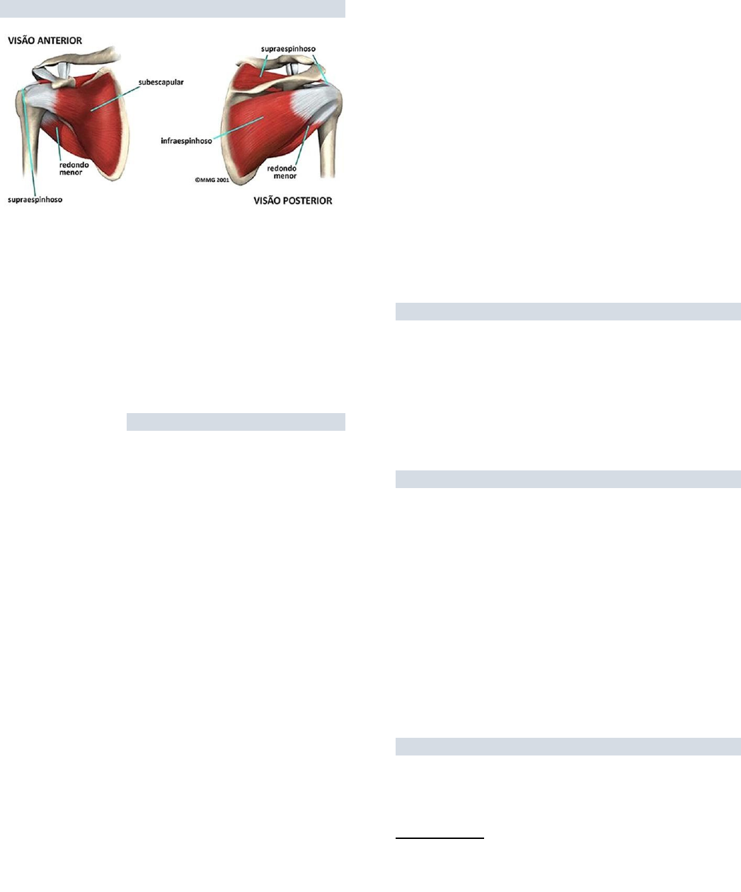 (Síndromes do Manguito rotador) Aspectos anatômicos Manguito rotador é formado por 4 músculos que se originam na escápula e se inserem nos tubérculos do úmero, sendo eles: · supra-espinhoso · infra-espinhoso · redondo menor · subescapular Aspectos fisiológicos O MR trabalha como unidade combinada para estabilizar a cabeça do úmero na cavidade glenóide. Sua principal função é de compressão, pois ele comprime a cabeça umeral contra a glenóide, aumentando a estabilidade, resistindo ao deslizamento e à translação da mesma (nos sentidos ântero-posterior e ínfero-superior), permitindo ainda alguma rotação em torno dos seus três maiores eixos (ântero-posterior, médio-lateral e diáfiso-umeral), isoladamente ou em conjunto. O efeito compressivo exercido pelo MR é relativamente independente da posição em que se encontra a articulação, embora nos movimentos de deslizamento e translação sua função se alterne. Em abdução e rotação neutra, o infra-espinhoso é depressor da cabeça umeral, mas em abdução e rotação externa, ele se torna elevador. O infra-espinhoso, juntamente com o redondo menor, são os únicos rotadores externos O subescapular é depressor mais efetivo em rotação externa. Tem pouco efeito na translação ântero-posterior em abdução e rotação externa, sendo importante rotador interno nos últimos graus desse movimento. O supra-espinhoso é importante estabilizador e compressor da cabeça umeral e está ativo em qualquer movimento envolvendo a elevação do membro superior O MR também se beneficia das ações de outros músculos no desempenho de suas funções, ou por sinergia ou pela criação de um ambiente biomecânico mais adequado. A função do deltóide demonstra claramente esse fenômeno. No início da elevação, com o membro superior em adução, a sua contração produz uma força de cisalhamento em direção cranial. O deltóide ântero-lateral, pela direção de suas fibras contornando o tubérculo maior, cria uma força que se opõe à primeira e aumenta o efeito compressivo e a estabilidade glenoumeral. Conceito As síndromes do manguito rotador representam um espectro de doenças podendo ser uma tendinite aguda a uma lesão maciça comprometendo todos os seus componentes. Essas lesões são caracterizadas de dor no ombro frequente. Epidemiologia · Prevalência alta; · Varia de 7 a 40%, aumentando de acordo com a idade; · Lesões parciais são mais comuns que as lesões totais; · Lesões na superfície articular são duas a três vezes mais comuns que na superfície bursal; · Lesões intratendinosas são menos frequentes, isso porque seus casos podem ser subdiagnosticados. Classificação Pode ser classificada de acordo com: Sua espessura: · Parciais ou não transfixantes; · Completas ou transfixantes. Tamanho da lesão quando completa: · Pequena, < 1cm; · Média, de 1 a 3cm; · Grande, de 3 a 5cm; · Maciça, de mais de 5cm. Grau de retração do coto tendinoso em relação à cabeça umeral: · Distais ou periinsercionais; · Intermediárias; · Proximais. A cronologia da lesão: · Agudas; · Crônicas; · Crônicas agudizadas. A etiologia: · Traumática; · Microtraumáticas; · Degenerativas; · Associadas às instabilidades. As lesões parciais podem ser classificadas de acordo com a sua localização: · Bursal · Articular · Intratendinosa Sua espessura e o seu tamanho (lesões parciais): · Grau I = 25% ou até 3mm · Grau II = 50% ou de 3 a 6mm; · Grau III = 50% ou > 6mm) As lesões do manguito rotador em três estágios: · I = edema e hemorragia, idade típica < 25 anos; · II = fibrose e tendinite, idade típica entre 25 e 40 anos; · II modificado = lesões parciais; · III = osteófitos e ruptura tendinosa, idade típica > 40 anos. Fisiopatologia · Intrínseca – Fatores vasculares · Extrínseca ou traumática – Fatores Biomecânicos 1. Intrínseca Processo degenerativo relacionado ao envelhecimento natural dos tendões (entesopatia), devido a mudanças na vascularização do manguito ou outras alterações metabólicas associadas com a idade. Um sistema microvascular comprometido agrava o problema criando uma “zona crítica” de avascularidade no local da lesão. Esse mecanismo proposto envolvendo a interação entre a lesão do tendão e o comprometimento microvascular permanece controverso. a maioria das lesões ocorria no lado articular, sugerindo que as mudanças degenerativas e o suprimento vascular insuficiente eram fatores patogênicos importantes, havendo evidências claras de preexistirem mudanças degenerativas relacionadas à idade como conseqüência de microtrauma. Portanto, todos esses indicativos nos levam a crer que a doença do manguito seja uma tendinopatia intrínseca causada por avascularidade, ida-de ou sobrecarga de uso. 2. Extrínsecos 0 a 95% das anormalidades do manguito são secundárias a trauma, sobrecarga em tensão ou excesso de uso. O atrito anormal entre o arco coracoacromial e os tendões seria a causa da lesão que ele denominou de síndrome do impacto subacromial. Em adição, fricção e atrito na superfície do acrômio poderiam agravar as mudanças degenerativas do manguito, conduzindo a uma lesão completa Tipos morfológicos de acrômio (planos, curvos e ganchosos) e que as lesões eram iniciadas pelo impacto subacromial; na presença de acrômios curvos e ganchosos, a predisposição seria maior O esporão acromial, têm papel secundário na lesão do manguito rotador e que sua etiologia, na verdade, é multifatorial. Quadro clinico Dor – principal sintoma · Localiza na região ântero-lateral do ombro e face lateral do braço · Sua intensidade é variável. · Atividades diárias dolorosas podem incluir vestir uma camisa ou escovar os cabelos. · A maioria dos pacientes se queixa de dor noturna e dificuldade ou incapacidade de deitar-se sobre o lado afetado, sendo este um aspecto muito característico e constante da doença do manguito