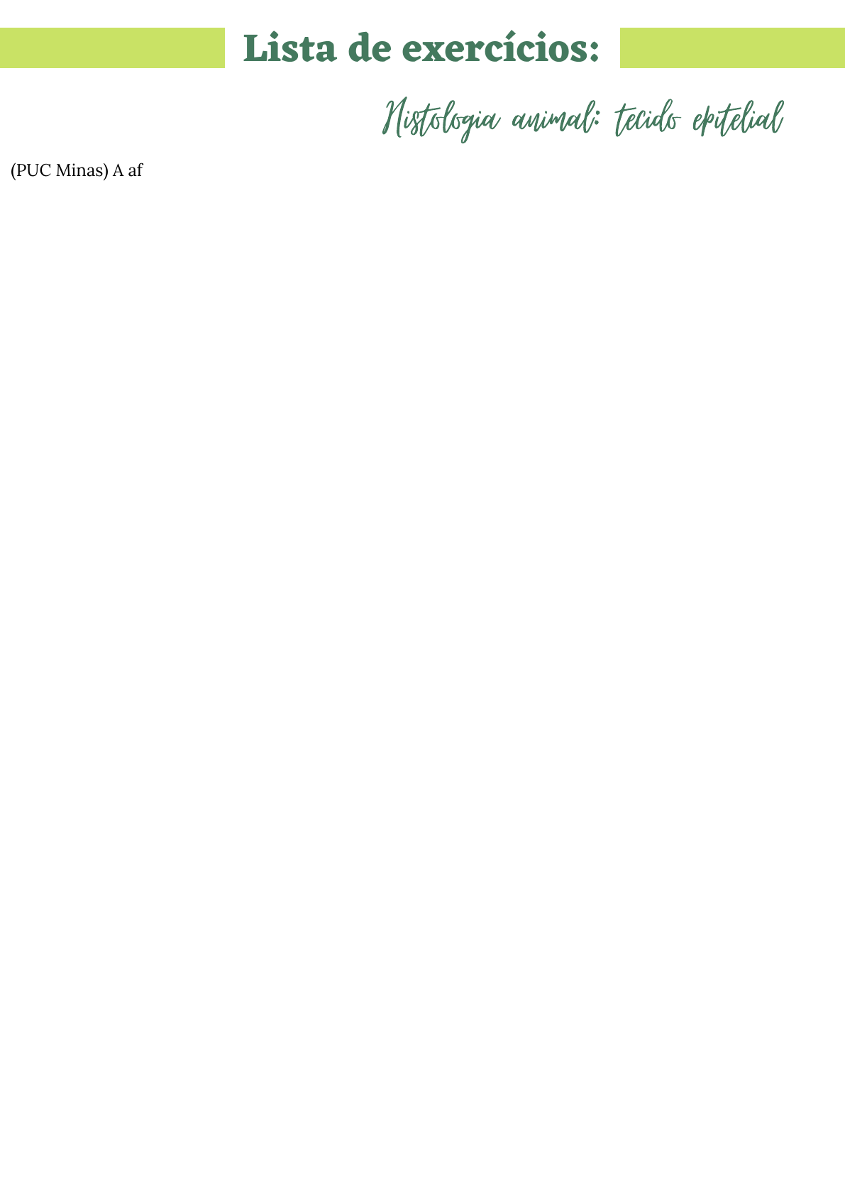 Histologia animal: tecido epitelial Lista de exercícios: (PUC Minas) A afirmativa FALSA sobre o epitélio é: A) O estratificado de transição é encontrado em revestimento interno da bexiga. B) O estratificado pavimentoso é encontrado em revestimento do esôfago. C) O simples prismático é encontrado em revestimento do intestino. D) O simples pavimentoso é encontrado em revestimento de vasos. E) O pseudoestratificado é encontrado em revestimento da boca. Resposta: "E" (UFF-RJ) Quando observamos um tecido epitelial ao microscópio, verificamos que A) geralmente é vascularizado, com exceção dos epitélios encontrados no sistema respiratório. B) é altamente vascularizado na epiderme e nos intestinos. C) geralmente é avascularizado, com exceção do epitélio do tubo digestório. D) geralmente é avascular e recebe nutrição do conjuntivo subjacente, por difusão. E) é altamente vascularizado, com exceção dos epitélios encontrados no tubo digestório e na epiderme. Resposta: "D" (UFPR) Quais as características do tecido epitelial? A) Tecido derivado do ectoderma e constituído por estruturas que funcionam preferencialmente dando conexão orgânica. B) Tecido derivado do mesoderma com abundante substância intercelular e com funções de proteção. C) Tecido proveniente de qualquer um dos folhetos embrionários, de constituição eminentemente celular e com funções de revestimento, proteção e secreção. D) Tecido derivado do endoderma, formado por células preferencialmente poliédricas e com funções de proteção. E) Tecido formado por células pavimentosas, de origem mesodérmica e com funções de contração celular. Resposta: "C" (PUC Minas) São respectivamente glândulas exócrinas holócrina e merócrina: A) Tireoide e salivar. B) Tireoide e sebácea. C) Sebácea e mamária. D) Sebácea e salivar. E) Sudorípara e mamária. Resposta: "D"