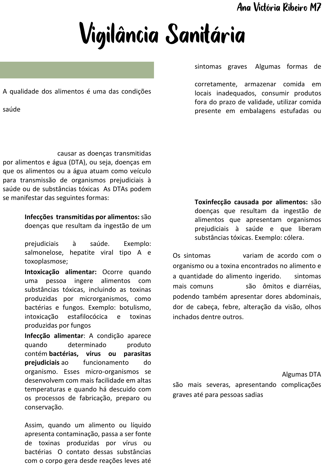 CONCEITOS A qualidade dos alimentos é uma das condições essenciais para a promoção e manutenção da saúde e deve ser assegurada pelo controle eficiente da manipulação em todas as etapas da cadeia alimentar. Procedimentos incorretos de manipulação de alimentos podem causar as doenças transmitidas por alimentos e água (DTA), ou seja, doenças em que os alimentos ou a água atuam como veículo para transmissão de organismos prejudiciais à saúde ou de substâncias tóxicas. As DTAs podem se manifestar das seguintes formas: Infecções transmitidas por alimentos: são doenças que resultam da ingestão de um alimento que contenha organismos prejudiciais à saúde. Exemplo: salmonelose, hepatite viral tipo A e toxoplasmose; Intoxicação alimentar: Ocorre quando uma pessoa ingere alimentos com substâncias tóxicas, incluindo as toxinas produzidas por microrganismos, como bactérias e fungos. Exemplo: botulismo, intoxicação estafilocócica e toxinas produzidas por fungos; Infecção alimentar: A condição aparece quando determinado produto contém bactérias, vírus ou parasitas prejudiciais ao funcionamento do organismo. Esses micro-organismos se desenvolvem com mais facilidade em altas temperaturas e quando há descuido com os processos de fabricação, preparo ou conservação. Assim, quando um alimento ou líquido apresenta contaminação, passa a ser fonte de toxinas produzidas por vírus ou bactérias. O contato dessas substâncias com o corpo gera desde reações leves até sintomas graves. Algumas formas de contágio são: não lavar os alimentos corretamente, armazenar comida em locais inadequados, consumir produtos fora do prazo de validade, utilizar comida presente em embalagens estufadas ou amassadas, etc. Ps.: intoxicação de infecção alimentar são, muitas vezes, utilizados como sinônimo, mas há diferenças. A intoxicação nem sempre está associada à presença de um agente infeccioso, enquanto a infecção há bactéria, protozoário ou vírus provocando sintomas. Toxinfecção causada por alimentos: são doenças que resultam da ingestão de alimentos que apresentam organismos prejudiciais à saúde e que liberam substâncias tóxicas. Exemplo: cólera. Os sintomas das DTA variam de acordo com o organismo ou a toxina encontrados no alimento e a quantidade do alimento ingerido. Os sintomas mais comuns das DTA são vômitos e diarréias, podendo também apresentar dores abdominais, dor de cabeça, febre, alteração da visão, olhos inchados dentre outros. Para adultos sadios a maioria das DTA dura alguns dias e não deixa sequelas; para pessoas mais susceptíveis, como crianças, idosos, gestantes e pessoas doentes, as conseqüências podem ser mais graves, podendo levar à morte. Algumas DTA são mais severas, apresentando complicações graves até para pessoas sadias. Para evitar ou reduzir os riscos de DTA, medidas preventivas e de controle, incluindo as boas práticas de higiene, devem ser adotadas na cadeia produtiva, nos serviços de alimentação, nas unidades de comercialização de alimentos e nos domicílios, visando à melhoria das condições sanitárias dos alimentos. MICROBIOLOGIA E CONTAMINAÇÃO ALIMENTAR O perfil epidemiológico das doenças transmitidas por alimentos no Brasil ainda é pouco conhecido. Somente alguns estados e/ou municípios dispõem de estatísticas e dados sobre os agentes etiológicos mais comuns, alimentos mais frequentemente implicados, população de maior risco e fatores contribuintes. Normalmente seu modo de transmissão se dá pela ingestão de alimentos e/ou água contaminados. Agentes etiológicos mais comuns – dados disponíveis de surtos apontam como agentes mais frequentes os de origem bacteriana e dentre eles, Salmonella spp, Escherichia coli, Staphylococcus aureus, Shigella spp, Bacillus cereus e Clostridium perfringens. Doença transmitida por alimento é um termo genérico, aplicado a uma síndrome geralmente constituída de anorexia, náuseas, vômitos e/ou diarreia, acompanhada ou não de febre, atribuída à ingestão de alimentos ou água contaminados. Sintomas digestivos, no entanto, não são as únicas manifestações dessas doenças, podem ocorrer ainda afecções extraintestinais, em diferentes órgãos e sistemas como: meninges, rins, fígado, sistema nervoso central, terminações nervosas periféricas e outros, de acordo com o agente envolvido. AS DTA PODEM SER CAUSADAS POR: Toxinas: produzidas pelas bactérias Staphylococcus aureus, Clostridium spp, Bacillus cereus, Escherichia coli, Vibrio spp, etc. Bactérias: Salmonella spp, Shigella spp, Escherichia coli, etc. Vírus: Rotavírus, Noravírus, etc. Parasitas: Entamoeba histolytica, Giardia lamblia, Cryptosporidium parvum, etc. Substâncias tóxicas: metais pesados, agrotóxicos, etc. Doenças transmitidas por alimentos e água São doenças que ocorrem devido à ingestão de alimentos, bebidas e água, contaminados por: microrganismos como bactérias, vírus, parasitas, príons e toxinas; ou por produtos químicos, agrotóxicos e metais pesados ou outros contaminantes. São conhecidas, também, como infecção ou intoxicação alimentar. SINTOMAS Os mais comuns são: diarréia líquida, náusea, vômitos, cólicas abdominais, e febre em alguns casos. Os sintomas podem durar de um dia a uma semana, em geral três dias. Alguns microrganismos podem causar sintomas mais graves, como distúrbios neurológicos, nos rins, no fígado, alérgicos, infecção generalizada, e até morte. CAUSAS MAIS FREQUENTES DE CONTAMINAÇÃO DOS ALIMENTOS? Um dos principais problemas é o preparo inadequado do alimento, seja pela falta de higienização da matéria‐prima, ou pela falta de higienização das mãos e dos utensílios e das superfícies da pia, pelo cozimento inadequado, etc. Manipuladores de alimentos, com lesões na pele ou com ferimentos nas mãos, podem transmitir microrganismos para os alimentos e causar doenças nos consumidores. Outro i