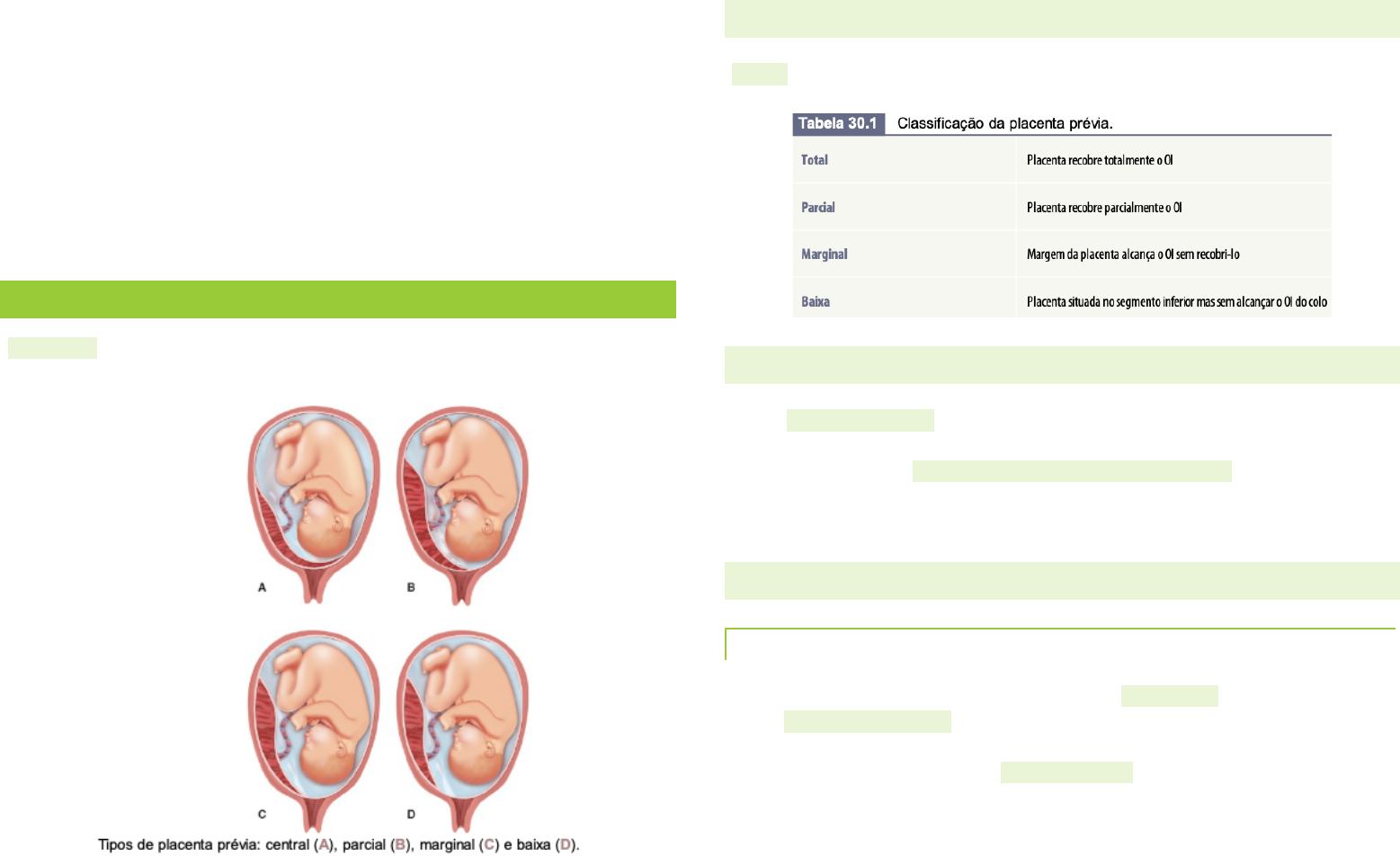 @resumosdamed_ 1 SANGRAMENTO DE SEGUNDA METADE DA GESTAÇÃO PLACENTA PRÉVIA: Definição: Considera-se placenta prévia aquela situada total ou parcialmente no segmento inferior do útero. CLASSIFICAÇÃO 4 tipos: central, parcial, marginal e baixa FATORES DE RISCO o A cesárea anterior constitui o fator de risco mais importante para a placenta prévia e o risco aumenta progressivamente com o número de procedimentos. Constituem outros fatores de risco: qualquer cicatriz uterina, idade materna avançada, multiparidade, tabagismo e gravidez gemelar. QUADRO CLÍNICO HEMORRAGIA. o Sem dúvida, é um sinal pontual e o mais importante o A hemorragia indolor, de sangue vermelho, brilhante, desvinculada de quaisquer esforços ou traumatismos, ocorre em mais de 90% dos casos, em geral despontando no último trimestre. Habitualmente, as perdas se sucedem, hemorragias cada vez mais importantes, pausas que se amiúdam, espoliação maciça pela intensidade ou que, somadas as crises, exsanguinam lentamente a gestante. @resumosdamed_ 2 EXAME FÍSICO. o A palpação é capaz de identificar a estática fetal alterada: situações oblíquas e transversas (15%), apresentação pélvica (15%) e cefálicas altas, por motivo da interposição da placenta entre a cabeça e o andar superior da bacia. o A ausculta do abdome revela batimentos cardíacos e a cardiotocografia (CTG) demonstra ser boa a viabilidade fetal. o A exploração digital do canal cervical está proscrita, pois há muito perdeu validade em face da precisão do diagnóstico ultrassonográfico. EXAME ESPECULAR. o Confirma, sob visão direta, que a hemorragia tem origem no canal cervical. PARTO. o A hemorragia tende a crescer de intensidade com o progresso da dilatação, que é proporcional à superfície da placenta descolada. o Nas placentas baixas, o sangue tende a deter-se quando se realiza a miotomia. SECUNDAMENTO. o O acretismo é comum; as retenções placentárias são habituais; a deficiente miocontração do segmento inferior é outro fator a provocar dificuldades nos 3º e 4º períodos (atonia e hemorragia). PUERPÉRIO. o Restos placentários podem permanecer aderidos e se infectar, especialmente pela proximidade entre a zona de inserção e a vagina. A subinvolução uterina e a anemia favorecem o aparecimento da infecção puérpera. DIAGNÓSTICO o O diagnóstico da placenta prévia deve ser realizado por ultrassonografia transabdominal de 20 a 24 semanas, mas a confirmação é feita pela ultrassonografia transvaginal, muito mais precisa que a abdominal, bem aceita pela paciente e segura, pois não causa sangramento. o Estima-se que cerca de 90% das placentas prévias diagnosticadas na ultrassonografia de 2º trimestre resolvam-se no exame de 36 semanas, pela expansão do segmento inferior no 2ºe no 3ºtrimestre, fenômeno conhecido como “migração placentária”. o A despeito de 2/3 das mulheres com placenta prévia sangrarem no período anteparo, esses raramente são episódios graves a ponto de exigirem interrupção da gravidez. Acredita-se que as mulheres com placenta prévia que apresentam sangramento (sintomáticas) e que permaneçam hemodinamicamente estáveis possam ser conduzidas ambulatoriamente. o O achado de área sonolucente na margem placentária que recobre o orifício interno (OI) do colo (seio marginal) eleva em 10 vezes o risco de hemorragia grave anteparo. o O colo com comprimento < 3 cm, pela ultrassonografia de 3º trimestre, indica possibilidade elevada de cesárea de emergência, antes de 34 semanas, por sangramento importante anteparo. o Pacientes que apresentam distância entre a borda da placenta e o OI ≥ 2 cm podem ser candidatas ao parto vaginal. Aquelas com essa @resumosdamed_ 3 distância < 4 cm (placenta baixa) apresentarão sangramento intenso no pós-parto. DIAGNÓSTICO DIFERENCIAL ENTRE A PLACENTA PRÉVIA E O DESCOLAMENTO PREMATURO DA PLACENTA (DPP) NORMALMENTE INSERIDA. @resumosdamed_ 4 PLACENTA ACRETA E VASA PRÉVIA o Duas condições estão intimamente associadas à placenta prévia: placenta acreta e vasa prévia. Elas elevam sobremaneira a morbiletalidade materna e fetal; a acreta, a da mãe; e a vasa prévia, a do feto. PLACENTA ACRETA o A classificação do acretismo baseia-se na profundidade da invasão: • placenta acreta adere ao miométrio; • placenta increta invade o miométrio; • placenta percreta perfura o peritônio, alcançando, por vezes, órgãos vizinhos como a bexiga e os paramétrios • A placenta acreta corresponde a 80% dos casos de acretismo; a increta, a 15%, e a percreta, a 5%. o A placenta acreta é responsável por mortalidade materna elevada, tão alta quanto 6 a 7%, ou até maior em países em desenvolvimento FATORES DE RISCO o O fator de risco mais importante para o acretismo é a placenta prévia em mulheres desareadas (placenta prévia-cesárea); e o risco aumenta com o número de procedimentos. A placenta prévia-acreta-cesárea ocorre pela deficiência de decídua basal na zona da cicatriz uterina. o A elevação do número de cesáreas aumenta a taxa de placenta prévia, e a de acreta acompanha. Quanto maior o número de cesáreas anteriores, maior o risco de placenta acreta. o Incidência de acretismo em casos com placenta prévia de acordo com o número de cesáreas anteriores: QUADRO CLÍNICO o Os principais achados sonográficos sugestivos de acretismo incluem: perda/irregularidade da zona hipoecoica retroplacentária, adelgaçamento do miométrio (< 1 cm), lagos placentários anômalos com fluxo turbulento ao Doppler colorido, hipervascularização ou disrupção da interface serosa- parede vesical com protrusão do tecido placentário para dentro da bexiga o Tanto a ultrassonografia quanto a ressonância magnética (RM) são altamente sensíveis e específicas para diagnosticar ou excluir a placenta acreta. • A ultrassonografia é o procedimento de escolha pela praticidade e pelo baixo custo. • A RM seria especialmente útil para car
