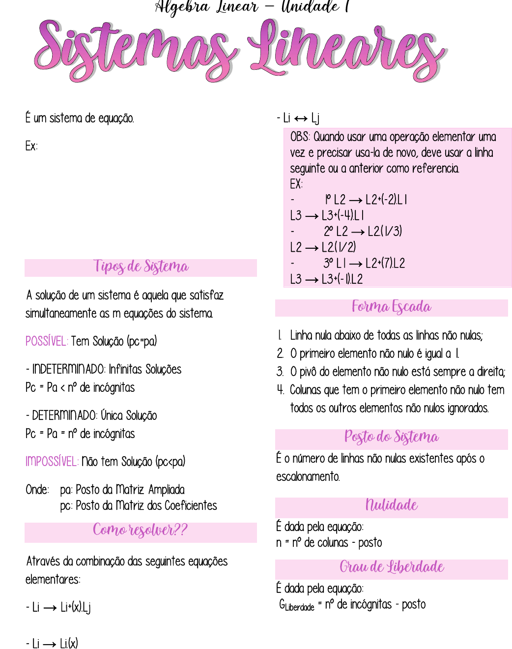 Álgebra Linear – Unidade I @engenherei 4x − 5y = 1 −2x + y = −11 2𝑥 + 3𝑦 + 6𝑧 = 15 −𝑥 + 4𝑦 + 𝑧 = 21 3𝑥 − 𝑦 + 7𝑧 = −7 → Quando quiser que um elemento fique nulo. → Quando quiser que um elemento vire 1 (um). → Quando quiser inverter linha.