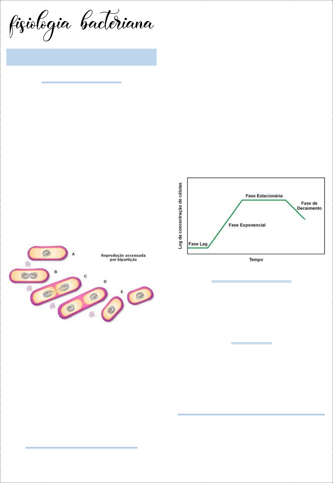 introdução crescimento bacteriano Na vida boa, ou seja, em condições de sobrevivências, ela está vegetativa. Nesse momento, a proliferação acontece. Essa proliferação ocorre por bipartição. Fissão binária: Ao mesmo tempo que duplica o DNA, a bactéria aumenta a quantidade de todas as suas outras estruturas. A bactéria gerada é idêntica à mãe. → É um processo de reprodução assexuada dos organismos unicelulares que consiste na divisão de uma célula em duas por mitose, em que cada célula filha é geneticamente igual à mãe. → É um processo dinâmico. O tempo de geração é a demanda desde o início da duplicação até o final, a formação efetiva de duas bactérias. Depende de vários fatores, tais como disponibilidade de nutrientes, temperatura, pH etc. → As bactérias, na grande maioria, preferem um pH neutro. → A temperatura ótima é, usualmente, 30°C. → O tempo de duração da S. coli, em condições ótimas, é de 15 minutos. curva de crescimento bacteriano Fase LAG é a adaptação ao meio, uma vez que não tem aumento populacional, mas tem intensa atividade metabólica. Fase exponencial é caracterizada por uma bactéria já adaptada. É nesse momento que inicia a fissão binária. Ocorre um crescimento exponencial ou logarítmico. Fase estacionária: Estabiliza a população de bactérias. É nesse período que o crescimento = morte. Fase de declínio: Redução da população bacteriana, já que mais células morrem do que proliferam. → Com o crescimento populacional, os nutrientes ficam escassos. cultivo na placa de petri A placa deve estar aberta por 15 minutos com um meio de cultura. Algumas bactérias do ar caem na superfície e após algumas horas/dias, é possível ver uma colônia de bactérias. metabolismo As bactérias captam a glicose do meio a fim de produzir ácido pirúvico/piruvato. Esse processo não demanda oxigênio, porém, em seguida, existem bactérias que passam por processos aeróbicos ou anaeróbicos. classificação quanto a tolerância ao oxigênio Aeróbios estritos: Exigem a presença de oxigênio. Anaeróbicos estritos: Não toleram a presença de oxigênio livre. Anaeróbicos facultativos: Crescem na presença ou não de oxigênio livre. Microaerófilos: Quantidade de oxigênio muito pequena pode satisfazer o organismo. Anaeróbicos aerotolerantes: Crescem na ausência de oxigênio, mas toleram a presença. temperatura Assim como as proteínas, por exemplo, as bactérias também dependem de uma temperatura ótima para poderem se reproduzir e formar colônias. Psicrófilos: 10°C - 12°C. Mesófilo: ± 36°C. Termófilo: ± 65°C. Hipertermófilo: ± 94°C - 97°C. transferências de material genético Transformação: A bactéria ganha um “pedaço” de DNA. Ocorre ocasionalmente em células do ambiente. Transdução: A bactéria recebe um pedaço de material genético de outro organismo, como um vírus, por exemplo. Geralmente, o vírus demanda a bactéria para usar seus componentes celulares e se replicar, podendo ter pedaços de DNA viral e bacteriano. Esse é o ciclo lítico. Há, também, o caso da bactéria que incorpora DNA viral em seu DNA. Conjugação: Uma bactéria recebe informações genéticas de outra bactéria através de uma ponte chamada pili sexual, formada por pili. Geralmente compartilham-se plasmídeos. Todos os organismos que nos causam infecções são mesófilos.