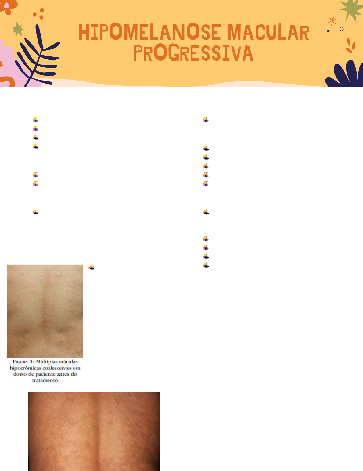 Sinonímia Cutis trunci Hipomelanose macular idiopática múltipla Hipomelanose numular confluente Hipomelanose macular do mestiço Epidemiologia Dermatose comum de alta incidência Acomete adultos jovens mestiços Etiologia Incerta, mas acredita-se que as alterações decorram do caráter de miscigenação em que há alteração no tamanho e na distribuição dos melanossomos. Clínica Múltiplas máculas pequenas hipocrômicas, mosqueadas, confluentes, sem infiltração, eritema ou escamas, assintomáticas e que afetam dorso, abdome, lombar e região sacral. Regiões expostas ao sol são poupadas. Diagnóstico Anamnese e exame clínico Diagnóstico diferencial Ptiríase versicolor Hanseníase indeterminada Vitiligo Micose fungóide hipocrômica Leucodermia por substâncias químicas Tratamento Fotoquimioterapia usando 8-MOP, seguida por períodos breves de exposição à UVA duas vezes por semana Frequência e duração ainda não definidas Pode-se usar também fototerapia com UVB Há risco de recidiva A resposta terapêutica, muitas vezes, é desapontadora. Bibliografia CAVALCANTI, Silvana Maria de Morais. Uso da limeciclina associada com o peróxido de benzoíla no tratamento da hipomelanose macular progressiva: um estudo prospectivo. Disponível em: https://www.scielo.br/j/abd/a/DWHhcdHrXxSDQpW9kHhHtRm/a bstract/?lang=pt. Acesso em: 03 set. 2021. WULKAN, Claudio. Hipomelanose macular progressiva. Disponível em: https://clinicawulkan.com.br/hipomelanose_racial-2/. Acesso em: 03 set. 2021. Belda Júnior W, Di Chiacchio N, Criado PR. Tratado de Dermatologia. 2ª. edição. São Paulo: Ed. Atheneu; 2014 AZULAY, Rubem Davi d. Dermatologia. 6. ed. Rio de Janeiro: E ditora Guanabara Koogan, 2013.