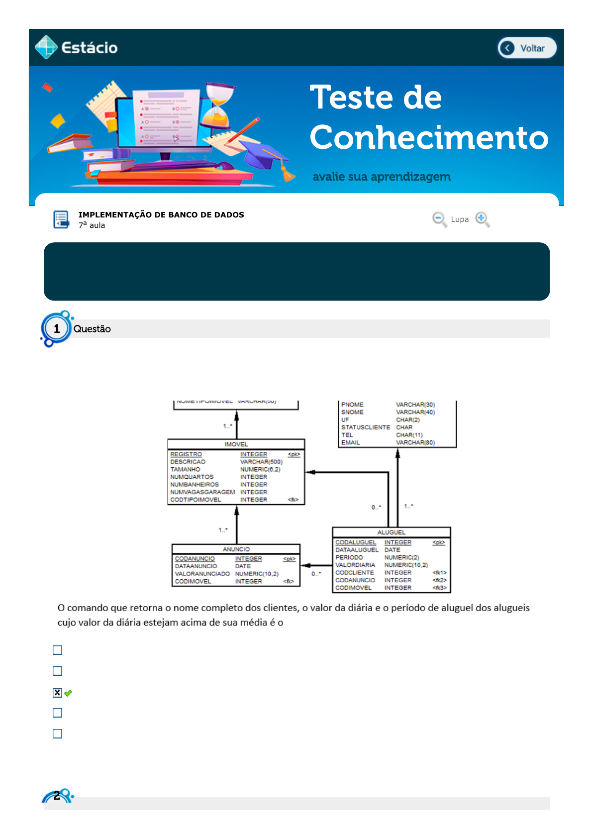 03/09/2021 EPS https://simulado.estacio.br/alunos/?p0=45695178&user_cod=2443080&matr_integracao=201907335651 1/4 Teste de Conhecimento avalie sua aprendizagem IMPLEMENTAÇÃO DE BANCO DE DADOS 7a aula Lupa Exercício: CCT0768_EX_A7_201907335651_V1 03/09/2021 Aluno(a): RAFAEL BARROSO DOS SANTOS 2021.3 EAD Disciplina: CCT0768 - IMPLEMENTAÇÃO DE BANCO DE DADOS 201907335651 SELECT PNOME || || SNOME CLIENTE, VALORDIARIA, PERIODO FROM CLIENTE NATURAL JOIN ALUGUEL WHERE VALORDIARIA > (SELECT AVG(PERIODO) FROM ALUGUEL); SELECT PNOME || || SNOME CLIENTE, VALORDIARIA, PERIODO FROM CLIENTE NATURAL JOIN ALUGUEL WHERE PERIODO > (SELECT AVG(VALORDIARIA) FROM ALUGUEL); SELECT PNOME || || SNOME CLIENTE, VALORDIARIA, PERIODO FROM CLIENTE NATURAL JOIN ALUGUEL WHERE VALORDIARIA > (SELECT AVG(VALORDIARIA) FROM ALUGUEL); SELECT PNOME || || SNOME CLIENTE, VALORDIARIA, PERIODO FROM CLIENTE NATURAL JOIN ALUGUEL WHERE PERIODO > (SELECT AVG(PERIODO) FROM ALUGUEL); SELECT PNOME || || SNOME CLIENTE, VALORDIARIA, PERIODO FROM CLIENTE NATURAL JOIN ALUGUEL WHERE VALORDIARIA*PERIODO > (SELECT AVG(VALORDIARIA) FROM ALUGUEL); Respondido em 03/09/2021 14:27:04 Questão1 2 https://simulado.estacio.br/alunos/inicio.asp javascript:voltar(); javascript:diminui(); javascript:aumenta(); 03/09/2021 EPS https://simulado.estacio.br/alunos/?p0=45695178&user_cod=2443080&matr_integracao=201907335651 2/4 SELECT NOMETIPOIMOVEL, TAMANHO, NUMQUARTOS || - || NUMBANHEIROS "NUMERO QUARTOS E BANHEIROS" FROM IMOVEL I, TIPOIMOVEL T WHERE I.CODTIPOIMOVEL = T.CODTIPOIMOVEL AND UPPER(NOMETIPOIMOVEL) = APARTAMENTO PADRÃO; SELECT NOMETIPOIMOVEL, TAMANHO, NUMQUARTOS "NUMERO QUARTOS E BANHEIROS", NUMBANHEIROS FROM IMOVEL , TIPOIMOVEL WHERE UPPER(NOMETIPOIMOVEL) = APARTAMENTO PADRÃO; SELECT NOMETIPOIMOVEL, TAMANHO, NUMQUARTOS || - || NUMBANHEIROS "NUMERO QUARTOS E BANHEIROS" FROM IMOVEL I, TIPOIMOVEL T WHERE I.CODTIPOIMOVEL = T.CODTIPOIMOVEL AND NOMETIPOIMOVEL = APARTAMENTO PADRÃO; SELECT NOMETIPOIMOVEL, TAMANHO, NUMQUARTOS , NUMBANHEIROS "NUMERO QUARTOS E BANHEIROS" FROM IMOVEL I, TIPOIMOVEL T WHERE I.CODTIPOIMOVEL = T.CODTIPOIMOVEL; SELECT NOMETIPOIMOVEL, TAMANHO, NUMQUARTOS || - || NUMBANHEIROS "NUMERO QUARTOS E BANHEIROS" FROM IMOVEL , TIPOIMOVEL WHERE NOMETIPOIMOVEL = APARTAMENTO PADRÃO; Respondido em 03/09/2021 14:27:08 eM um banco de dados há três tabelas: T1, T2 e T3, com 10, 20 e 30 registros respectivamente. Cada tabela possui um atributo A, sobre o qual é definida uma chave primária. Nesse cenário, está correto concluir que o comando select T1.* from T1 cross join T2 cross join T3 produz um resultado que, além da linha de títulos, possui: 20 linhas; 600 linhas; 6.000 linhas. 30 linhas; 10 linhas; Respondido em 03/09/2021 14:27:13 SEJA O MODELO: Forncedor(cod_fornec, nome_fornec, telefone, cidade, uf) Estado(UF, nome_estado) A expressão SQL Questão Questão3 Questão4 03/09/2021 EPS https://simulado.estacio.br/alunos/?p0=45695178&user_cod=2443080&matr_integracao=201907335651 3/4 que obtém os nomes dos estados para os quais não há fornecedores cadastrados é: SELECT E.nome_estado FROM Estado AS E, FROM Fornecedor as F WHERE E.nome_estado = F.UF SELECT E.nome_estado FROM Estado AS E WHERE E.UF IN (SELECT F.UF FROM FORNECEDOR AS F) SELECT E.UF FROM ESTADO AS E WHERE E.nome_estado NOT IN (SELECT F.UF FROM FORNECEDOR AS F) SELECT E.nome_estado FROM Estado AS E, FROM Fornecedor AS F WHERE E.UF = F.UF SELECT E.nome_estado FROM Estado AS E WHERE E.UF NOT IN (SELECT F.UF FROM FORNECEDOR AS F) Respondido em 03/09/2021 14:27:24 A junção irrestrita também é conhecida como: Junção Cruzada Junção Exterior Junção Contínua Junção Interior Autojunção Respondido em 03/09/2021 14:27:26 Considere as seguintes tabelas de um banco de dados: Estado (UF, NomeEstado) Cidade (CodCidade, NomeCidade, UF) UF referencia Estado Escolha o comando SQL que liste o nome de cada estado e a quantidade de cidades cadastradas para cada um: SELECT E.NomeEstado, Count(*) FROM Cidade C, Estado E WHERE C.UF = E.UF GROUP BY E.NomeEstado SELECT Count(*) FROM Estado SELECT UF, Count(*) FROM Cidade GROUP BY UF SELECT E.NomeEstado, Count(*) FROM Cidade C, Estado E GROUP BY E.NomeEstado (J) SELECT E.NomeEstado, Count(*) FROM Cidade C, Estado E WHERE C.UF = E.UF HAVING Count(*) >= 1 Respondido em 03/09/2021 14:27:39 O esquema de banco de dados apresentado abaixo faz parte de um banco de dados criado a partir de um conjunto de dados públicos de captura de tubarões entre os anos de 2001 e 2013 na costa da Austrália. Os dados podem ser baixados no endereço: https://data.qld.gov.au/dataset/shark-control-program-shark-catch-statistics/resource/5c6be990-3938-4125-8cca- dac0cd734263 Características do esquema: Chave primária sublinhada e chave estrangeira em itálico. Seguem algumas tabelas do Esquema: Nome (IDNome, IDEspécie, NomePopular) Tubarão (IDTubarão, IDEspécie, Comprimento, Sexo) Captura (NumCaptura, IDTubarão, IDLocal, Data, TempAgua) Local (IDLocal, CodArea, NomeLocal) Area (CodArea, NomeArea) Sabendo-se que a tabela nome contém nomes populares de tubarões e deseja-se listar o comprimento e o sexo de todos os tubarões que tem nome popular terminado com a letra k. Assinale a alternativa abaixo que retorna corretamente a consulta desejada: Questão5 Questão6 Questão7 03/09/2021 EPS https://simulado.estacio.br/alunos/?p0=45695178&user_cod=2443080&matr_integracao=201907335651 4/4 SELECT Comprimento, Sexo FROM Tubarão T, Espécie E, Nome N WHERE T.IDEspecie = E.IDEspecie AND N.IDEspécie = E.IDEspecie AND UPPER (NomePopular) like %k%; SELECT Comprimento, Sexo FROM Tubarão T, Espécie E, Nome N WHERE T.IDEspecie = E.IDEspecie AND N.IDEspécie = E.IDEspecie AND NomePopular like %k; SELECT Comprimento, Sexo FROM Tubarão T, Espécie E, Nome N WHERE T.IDEspecie = N.IDEspécie AND NomePopular like %k; SELECT Comprimento, Sexo FROM Tubarão T, Espécie E, Nome N WHERE T.IDEspecie = E.IDEspecie AND N.IDEspécie = E.IDEspecie AND UPPER (NomePopular