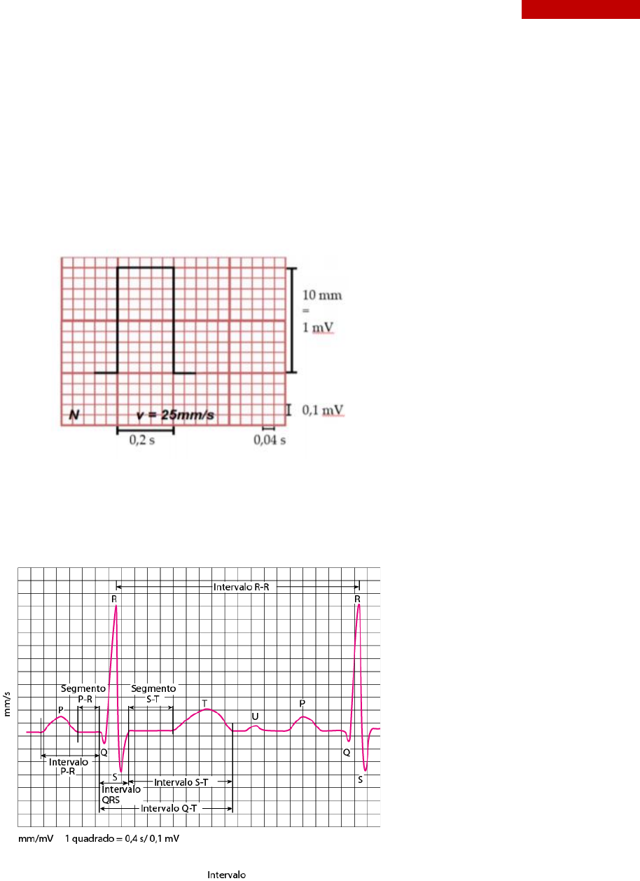 1 Michele Aita Chaves, Medicina 111 ELETROCARDIOGRAMA ✓ INTRODUÇÃO: • Papel do eletrocardiógrafo: o Velocidade de saída do papel é de 25mm/s; o Voltagem é N (10mm equivale a 1mV); o Cada milímetro no eixo x corresponde a 0,04s (40ms); o Um quadrado de 5mm x 5mm terá uma equivalência de 0,2s x 0,5mV. o A calibração é muito importante! O normal é 10mm = 1mV. Se o retangulo de calibração está com 5mm de altura isso quer dizer que em 1mV ele fez 5mm, tendo então uma calibração N/2. • Ondas, seguimentos e intervalos: 1. Onda P – despolarização atrial: O nó sinusal se localiza no átrio direito, próximo a veia cava superior. Dessa forma, ao haver uma despolarização sinusal, a primeira câmara a seguir com a despolarização é o AD (átrio direito) e depois o AE (átrio esquerdo). A onda P é a representação do vetor resultante da despolarização atrial. 2 Michele Aita Chaves, Medicina 111 2. Intervalo PR: momento em que o nó sinusal inicia seu estímulo até o instante anterior a despolarização ventricular. Segmento PR: final da onda P até o início do QRS. Na prática clínica, medimos o intervalo PR para avaliação do nó AV. Isso ocorre porque o segmento PR pode ser maior ou menor em decorrência de alterações ocorridas onda P. 3. QRS – despolarização ventricular a. Onda Q – vetor 1: despolarização septal, uma onda negativa e de pequena amplitude. Da esquerda para direita – ramo esquerdo despolariza mais rápido; maior massa do VE. Onda negativa – pequena amplitude. b. Onda R – vetor 2: despolarização das paredes livres ventriculares; uma onda positiva e de grande amplitude (o vetor resultante aponta para o VE, pois tem mais massa e mais dipolo). Onda positiva – grande amplitude. c. Onda S – vetor 3: despolarização basal. Pequena amplitude e negativa, representa a ativação das partes basais e seu vetor resultante aponta para cima. OBSERVAÇÃO: A nomenclatura da onda se correlaciona com sua polaridade – se positiva ou negativa, e não com o que representa. A despolarização septal numa derivação pode ser representada pela onda q (como D1) e por uma onda positiva em outra derivação (como a onda R, na derivação V1). 4. Segmento ST: se inicia no ponto J (ponto onde termina o QRS) e vai até o início da onda T. Segundo potencial de ação – O principal íon envolvido é o cálcio. 5. Onda T – Repolarização ventricular; 6. Onda U: É normal aparecer, mas incomum; 7. Intervalo QT – intervalo entre a despolarização e repolarização ventricular; Na clínica, esse intervalo pode ser afetado por uso de algumas drogas, hipotermia, distúrbios eletrolíticos ou mesmo síndromes congênitas e isso pode se relacionar com a gênese de arritmias graves. Um aumento no intervalo QT pode indicar uma taquiarritmia. 3 Michele Aita Chaves, Medicina 111 • DERIVAÇÕES: nada mais são do que registros da mesma atividade elétrica, mas por ângulos diferentes. Conhecer onde está posicionado a “câmera” /eletrodo explorador permite saber exatamente pra onde olhar quando se quer ver uma alteração em algum lugar específico do coração. As derivações D1, D2 e D3 são chamadas Derivações Bipolares pois são formadas por apenas um eletrodo EXPLORADOR (E) e, outro REFERÊNCIA. As derivações aVR, aVR e aVF são chamadas Derivações Unipolares Aumentadas – o eletrodo referência é formado por mais de um membro. Essas derivações, juntamente com as bipolares, formam o plano periférico. o Derivações precordiais: visualizam o coração de frente. Vai de V1 a V6. 4 Michele Aita Chaves, Medicina 111 • Frequência cardíaca: em caso de ritmo regular, as ondas QRS possuem intervalos equidistantes entre si. Assim, a frequência cardíaca é contada da seguinte maneira. FC: 1500/ nº de mm entre 2 ondas (ex: duas ondas R – número de quadradinhos). FC: 300/ nº de quadrados grandes entre duas ondas R. Em caso de ritmo irregular: 1. Basta contar quantos QRS há em 3s e multiplicar por 20; 2. Basta contar quantos QRS há em D2 longo e se multiplicar por 6. ANÁLISE DA ONDA P: utilizar as derivações D2 e V1. ✓ Em D2: a onda P deve ter DURAÇÃO inferior a 0,12s e amplitude menor que 0,25mV. ✓ Em V1: a onda P “pode” ter componente duplo (positivo e negativo), sendo o positivo a representação do AD. • Ondas: Eletrodos ligados a um aparelho que transforma esse registro em registro gráfico. Quando há a despolarização, o dipolo se aproxima com carga POSITIVA do eletrodo explorador fazendo com que o aparelho comece a registrar uma carga positiva (subindo a linha) até deixar de existir, o que faz o registro voltar a zero. A onda negativa aparece durante a repolarização do eletrodo até que o cardiomiócito fique em repouso. Isoelétrico: sem diferença de potencial 1. Eletrodo E no início da fibra = onda negativa. 2. Eletrodo E no meio da fibra = onda QRS. 5 Michele Aita Chaves, Medicina 111 3. Eletrodo E no final da fibra = onda positiva. ✓ POR QUE A ONDA T É POSITIVA SE É REPOLARIZAÇÃO? A despolarização ventricular começa do endocárdio para o epicárdio, e o vetor fica apontado para o mesmo sentido. Mas na hora da despolarização/contração o endocárdio tem um momento de colabamento dos capilares (isquemia transitória fisiológicas) fazendo com que o epicárdio fique com maior quantidade de sangue, assim, repolarizando antes do endocárdio. Desse modo o vetor vai do epicárdio para o endocárdio. Se a repolarização sempre tem vetor ao contrário, o vetor continua apontando para o eletrodo explorador, gerando onda T positiva. Se o QRS é para cima a onda T é pra cima. Se o QRS é pra baixo, a onda T é para baixo. • Eixo elétrico normal: -30º a +90º Ritmo sinusal significa que os átrios se despolarizaram, ou seja, que o estímulo da despolarização veio do nó sinoatrial. Para verificar o RITMO SINUSAL, é necessário observar algumas derivações específicas. O vetor resultante 