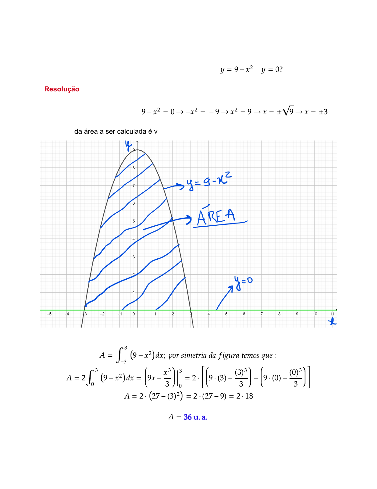 Tiago Lima - Instagram: @professor_disciplinas_exatas • Calculando a área da região limitada pelas curvas e y = 9 - x2 y = 0? Resolução: A interseção entre as curvas é: 9 - x = 0 -x = - 9 x = 9 x = ± x = ±32 → 2 → 2 → 9 → O gráfico da área a ser calculada é visto abaixo; A área da região é dada pela integral: A = 9 - x dx; por simetria da figura temos que : 3 ∫ -3 2 A = 2 9 - x dx = 9x - = 2 ⋅ 9 ⋅ 3 - - 9 ⋅ 0 - 3 0 ∫ 2 x 3 3 3 0 ( ) 3 3 ( )3 ( ) 0 3 ( )3 A = 2 ⋅ 27 - 3 = 2 ⋅ 27 - 9 = 2 ⋅ 18( )2 ( ) A = 36 u. a. (Resposta)