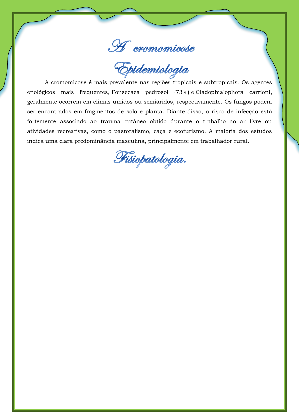 A cromomicose é mais prevalente nas regiões tropicais e subtropicais. Os agentes etiológicos mais frequentes, Fonsecaea pedrosoi (73%) e Cladophialophora carrioni, geralmente ocorrem em climas úmidos ou semiáridos, respectivamente. Os fungos podem ser encontrados em fragmentos de solo e planta. Diante disso, o risco de infecção está fortemente associado ao trauma cutâneo obtido durante o trabalho ao ar livre ou atividades recreativas, como o pastoralismo, caça e ecoturismo. A maioria dos estudos indica uma clara predominância masculina, principalmente em trabalhador rural. A infecção geralmente resulta de uma lesão cutânea traumática, onde os agentes ganham entrada no corpo humano por contato com solo e planta contaminados. Assim como acontece com outros fungos patogênicos, múltiplos fatores de virulência provavelmente desempenham um papel no desenvolvimento da cromomicose, tais como: presença de melanina na parede celular fúngica, hidrofobicidade e adesão celular. Além disso, os mecanismos que interferem com a resposta do hospedeiro podem contribuir para a persistência da infecção. As lesões se desenvolvem no local da inoculação, acometendo a pele e algumas vezes o tecido subcutâneo. Trata-se uma infecção fúngica que pode afetar a pele ou, raramente, o cérebro, tendo como agente etiológico os fungos: 1. Fonsecae pedrosoi (O maior responsável pela cromomicose) 2. Cladosporium carionii, 3. Phialophora verrucosa 4. Rhinocladiella aquaspersa. Estes fungos são apresentam como habitat natural o solo, os vegetais e a água. Embora se trate de uma desordem universal, ocorre com maior frequência na zona tropical e subtropical. É descrita com maior frequência em adultos do sexo masculino, especialmente entre a segunda e a quarta décadas de vida, predominando em trabalhadores ou ex-trabalhadores da área rural. No caso da cromomicose cutânea, o contágio ocorre pela inoculação do agente em áreas de pele lesionadas. Com relação à cromomicose cerebral existem poucos casos https://www.infoescola.com/ecologia/habitat/ https://www.infoescola.com/geografia/clima-tropical/ https://www.infoescola.com/geografia/clima-tropical/ https://www.infoescola.com/geografia/clima-subtropical/ relatados na literatura médica, contudo é provável que as portas de entrada incluam os pulmões e os seios paranasais. As manifestações clínicas aparecem pela primeira vez no local da inoculação semanas a meses após o trauma na pele, muitas vezes despercebido ou não lembrado. Desenvolve-se uma pápula pequena, eritematosa, assintomática. À medida que a lesão progride, ela assume um aspecto escamoso e infiltrado. Na ausência de diagnóstico precoce e tratamento, as lesões podem aumentar de tamanho e/ou espalhar-se localmente, produzindo lesões satélite. As manifestações da doença progressiva são polimórficas e pode ocorrer uma das cinco morfologias: nodular, verrucosa, tumoral, cicatricial e em placa. Geralmente, a doença permanece localizada na área da infecção inicial ou da pele vizinha, mas pode ocorrer disseminação linfática e hematogênica, produzindo lesões metastáticas. O exame da superfície das lesões muitas vezes revela numerosos pontos negros ou uma aparência de “pimenta caiena”. Os locais mais comumente afetados são as extremidades inferiores, especialmente os pés. As mãos, braços e nádegas também são frequentemente envolvidos, e relatos esporádicos mencionam lesões nos ouvidos, face, seios e axilas. No início da doença, os sintomas são mínimos. Porém, à medida que a doença avança, o prurido torna-se uma queixa dominante e pode ser acompanhado de dor local. A infecção secundária com bactérias é comum, dando à lesão um mau odor característico. Acredita-se que a infecção secundária seja importante na gênese da estase linfática e consequentemente no aparecimento do linfedema. A forma cutânea costuma desenvolver-se dentro de dois meses após o contágio e inicia-se como uma lesão papulosa ou papulo-nodular, que evolui para uma úlcera, adquirindo, por conseguinte, um aspecto verrucoso ou serpíngino-vegetantes. É mais comum nos membros inferiores e tipicamente fica circunscrita ao membro afetado, incapacitando-o. No entanto, pode afetar também os membros superiores, o tronco e a extremidade cefálica. Há raros relatos do acometimento da córnea e dos ossos. No que diz respeito à forma cerebral, os maiores responsáveis por levar à cromomicose são os fungos do gênero Fonsecaea e Cladosporium. Esta forma evolui lentamente, propagando-se por contiguidade, sendo rara a disseminação pela corrente linfática ou sanguínea. Clinicamente, pode estar presente uma síndrome de hipertensão intracraniana, associada ou não a sinais meningorradiculares, podendo evoluir para uma meningite. https://www.infoescola.com/anatomia-humana/pulmoes/ https://www.infoescola.com/visao/cornea/ https://www.infoescola.com/doencas/meningite/ Pode ser estabelecida por meio de exames laboratoriais, como a análise de secreções e crostas, cultura ou histopatologia, com esta última evidenciando a presença dos fungos em células gigantes, nos abscessos ou até mesmo difuso pelo epitélio. A cromomicose possui diagnóstico diferencial em decorrência das características clínicas da lesão, sendo fundamentais, para sua confirmação diagnóstica, exames específicos. As características da lesão sugerem como hipóteses diagnósticas doenças que causam a síndrome verrucosa LECT (leishmaniose, esporotricose, cromomicose e tuberculose). Um sistema de classificação para a gravidade da doença ajuda a orientar a abordagem do tratamento: Doença leve: Doença moderada Doença grave Placa solitária ou nódulo < 5 cm de diâmetro Lesões únicas ou múltiplas com morfologia nodular, verruga ou placa < 15 cm de diâmetro e envolvendo uma ou duas áreas de pele adjacentes Envolvimento extensivo de áreas de pele adjacentes ou não 