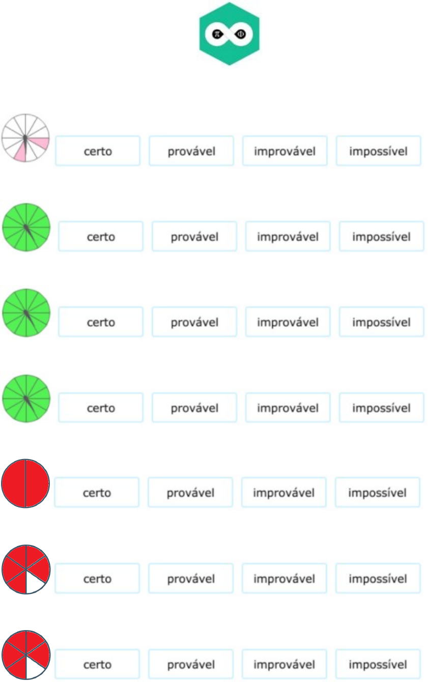 www.matematico10.com CERTEZA , PROVÁVEL , IMPROVÁVEL E IMPOSSÍVEL 1.Quais são as chances de o ponteiro para no espaço branco? 2.Quais são as chances de o ponteiro para no espaço branco? 3.Se você escolhesse um espaço branco para o ponteiro parar,quais as chances? 4.Se você escolhesse um espaço verde para o ponteiro parar,quais chances? 5.Quais são as chances de o ponteiro para no espaço branco? 6.Quais são as chances de o ponteiro para no espaço branco? 7.Quais são as chances de o ponteiro para no espaço vermelho?