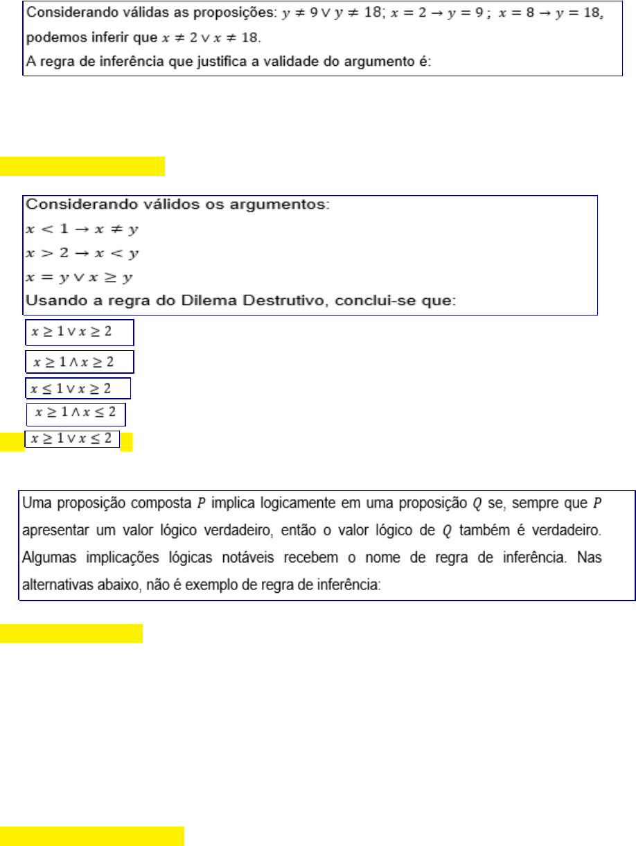 Exercícios de Lógica Matemática 1- A - Modus Tollens. B - Modus Ponens. C - Silogismo disjuntivo. D - Dilema construtivo. E - Dilema destrutivo. check_circle Resposta correta 2- A - B - C - D - E - check_circle Resposta correta 3- A - Simplificação. a B - Multiplicação. check_circle Resposta correta C - Silogismo disjuntivo. D - Modus Ponens. E - Modus Tolens. 4- Considere os seguintes argumentos: Se um homem é careca, então ele é inteligente. Se um homem é inteligente, então ele tem sucesso na vida. Logo, os carecas tem sucesso na vida. Esta argumentação é válida pela regra: A - Silogismo hipotético. check_circle Resposta correta B - Silogismo disjuntivo. C - Dilema construtivo. D - Dilema destrutivo. E - Idempotência. 5- A - B - check_circle Resposta correta C - D - E - 6- A - FVF B - VFV C - VFF D - FFV check_circle Resposta correta E - FVF 7- A - B - C - check_circle Resposta correta D - E - 8- Considere a proposição: “Se o quadrado de um número é par, então este número é par”. A contrapositiva desta proposição é: A - Se o quadrado de um número é par, então este número é par. B - Se um número é par, então o quadrado deste número é par. C - Se o quadrado de um número é impar, então este número é impar. D - Se o quadrado de um número é impar, então este número é par. E - Se um número é impar, então o quadrado deste número é impar. check_circle Resposta correta 9- A - B - check_circle Resposta correta C - D - E - 10- A - Tautologia. B - Contradição. C - Contingência. check_circle Resposta correta D - Contra positiva. E - Condicional.