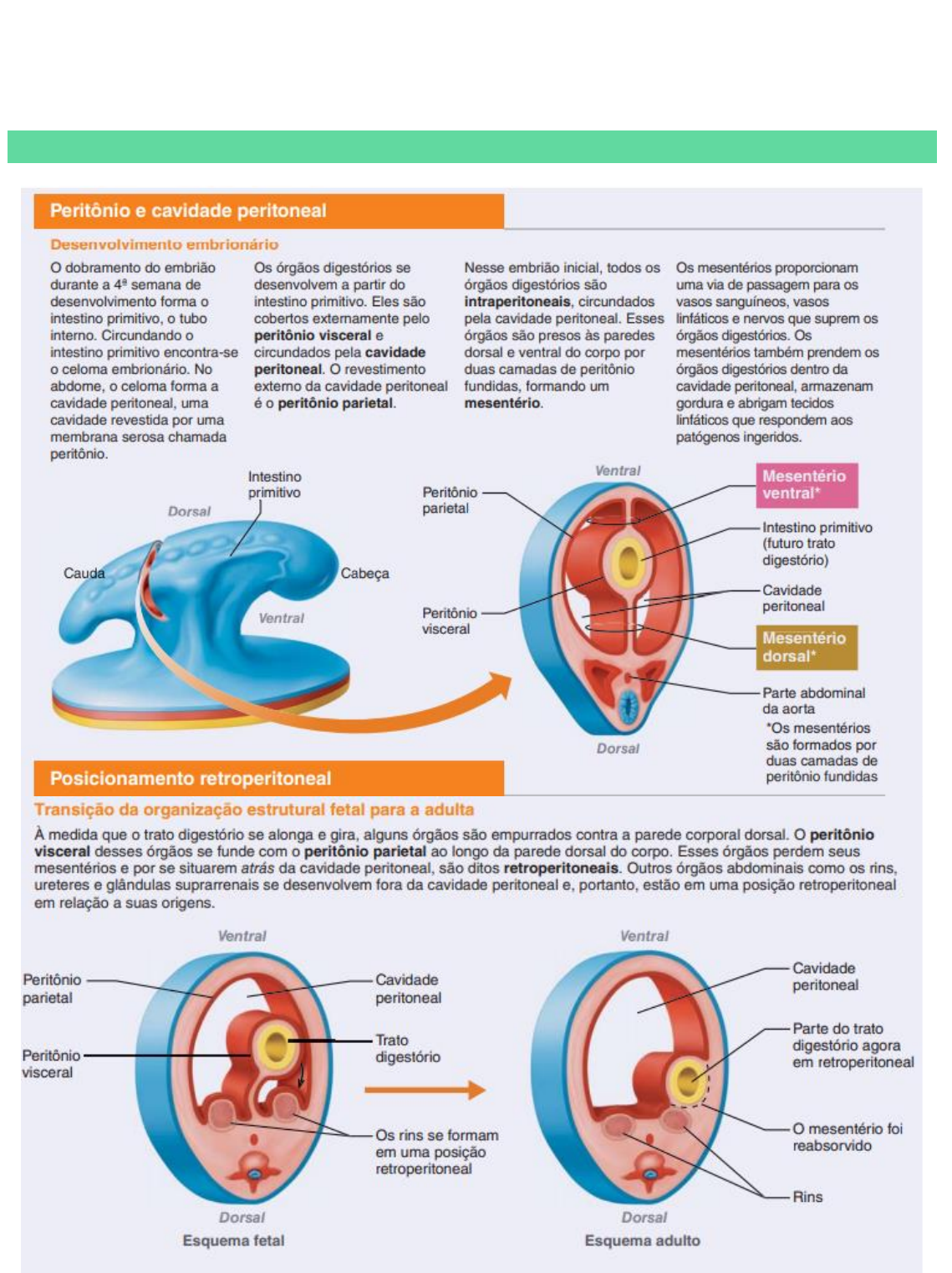 Órgãos Abdominais Embriologia MORFO - 3 ETAPA Tammy Caram Sabatine Membranas Peritônio • Membrana serosa localizada na cavidade abdominopélvica • O parietal reveste a parede corporal • O visceral envolve os órgãos, e é continuo com o parietal • A cavidade peritoneal é um potencial espaço entre os dois peritônios, e se localiza entre os órgãos e a parede abdominal. Contém um fluido seroso lubrificante que permite que os órgãos deslizem facilmente durante a digestão Mesentérios • Dupla camada de peritônio, uma lâmina de duas serosas fundidas • Mantém os órgãos em posição, armazenam gordura e proporcionam uma rota para os vasos circulatórios e nervos chegarem aos órgãos na cavidade peritoneal • São chamados de ligamentos, porém não tem semelhança com os que ligam os ossos • VENTRAIS o Ligamento falciforme ▪ liga a face anterior do fígado à parede anterior do abdome e ao diafragma o Omento menor ▪ vai do fígado à curvatura menor do estômago • DORSAIS o Omento maior ▪ conecta a curvatura maior do estomago á parede posterior do abdome ▪ anteriormente é mais alongado e cobre o colo transverso e as espirais do intestino delgado. ▪ A margem esquerda envolve o baço como ligamento gastroesplênico, e entre o baço e o rim esquerdo como lligamento esplenorrenal o Mesentério ▪ sustenta as espirais do jejuno e íleo. Se abre em leque, como cortinas grandes e pregueadas. ▪ O colo transverso é preso na parede posterior do abdome pelo mesocolo transverso (mesentério do colo). ▪ O mesocolo sigmóide é o mesentério que conecta colo sigmóide à parede posterior da pelve Fígado Ácino hepático • é a unidade funcional do fígado (parte triangular) • As células estão dispostas em zonas concêntricas que cercam os vasos aferentes terminais. o Zona 1 (periportal) – mais próxima ao espaço porta, é a primeira a receber sangue com alto conteúdo de oxigênio, insulina e glucagon. Tem alta taxa metabólica e é a última a sofrer necrose e a primeira a mostrar sinais de regeneração. o Zona 2 (mediolobular) – recebe sangue com conteúdo intermediário de oxigênio. o Zona 3 (centrilobular) – mais próxima às veias hepáticas terminais, recebe sangue por último. Aqui estão muitas das enzimas que participam de biotransformação (NADPH citocromo P450-redutase). É mais susceptível a lesões, pois recebe menos nutrientes e menos oxigênio, tendo menor capacidade regenerativa Espaço porta • Cada espaço-porta é composto por uma vênula e uma arteríola (ramos da veia porta e da artéria hepática, respectivamente), um ducto biliar, vasos linfáticos e nervos. • É cercado por uma capa de tecido conjuntivo, contínua com a cápsula de Glisson, que recebe o nome de placa limitante. • O espaço-porta também pode receber o nome de tríade porta pois, suas estruturas predominantes são a vênula, a arteríola e o ducto biliar Colestase neonatal • Retardo ou interrupção do fluxo biliar • Pode ter causas extra-hepáticas ou intra-hepáticas • Resulta em hiperbilirrubinemia Extra-hepáticas • Atresia biliar • Síndrome do ducto biliar espessado • Cistos biliares Intra-hepáticas • Infecções (virais, bacterianas, parasitárias) • Doença hepática aloimune gestacional (passagem de igG materno que induz ataque as membranas, mediada pelo complemento, lesando o fígado fetal) • Causas metabólicas • Síndrome da hepatite neonatal idiopática Degeneração Gordurosa • Grandes vacúolos no citoplasma dos hepatócitos, que deslocam o núcleo para a periferia • Sinusóides com hemácias Imagem • Gordura é mais branca • Nos graus 1 e 2 de esteatose ainda vemos vasos, no grau 3 não vemos mais