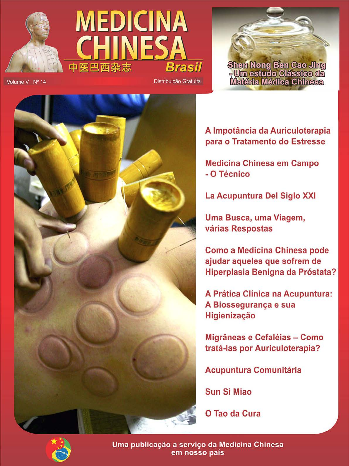 1Medicina Chinesa Brasil Ano V n o 14 Corpo Editorial Editor Chefe Dr. Reginaldo de Carvalho Silva Filho, Fisioterapeu- ta; Acupunturista; Praticante de Medicina Chinesa Editor Executivo Dr. Cassiano Mitsuo Takayassu, Fisioterapeuta; Acu- punturista; Praticante de Medicina Chinesa Editor Científico Dr. Rafael Vercelino, PhD, Fisioterapeuta; Acupun- turista Coordenação Editorial Gilberto Antonio Silva, Acupunturista; Jornalista (Mtb 37.814) Revisão Adilson Lorente, Acupunturista; Jornalista Comitê Científico Dr. Mário Bernardo Filho, PhD (Fisioterapia e Biomedicina) Dra. Ana Paula Urdiales Garcia, MSc (Fisioterapia) Dra. Francine de Oliveira Fischer Sgrott, MSc. (Fisioterapia) Dra. Margarete Hamamura, PhD (Biomedicina) Dra. Márcia Valéria Rizzo Scognamillo, MSc. (Veterinária) Dra. Paula Sader Teixeira, MSc. (Veterinária) Dra. Luisa Regina Pericolo Erwig, MSc. (Psicologia) Dra. Aline Saltão Barão, MSc (Biomedicina) Assessores Nacionais Dr. Antonio Augusto Cunha Daniel Luz Dr. Gutembergue Livramento Marcelo Fábian Oliva Silvia Ferreira Dr. Woosen Ur Assessores Internacionais Philippe Sionneau, França Arnaud Versluys, PhD, MD (China), LAc, Estados Unidos Peter Deadman, Inglaterra Juan Pablo Moltó Ripoll, Espanha Richard Goodman, Taiwan (China) Junji Mizutani, Japão Jason Blalack, Estados Unidos Gerd Ohmstede, Alemanha Marcelo Kozusnik, Argentina Carlos Nogueira Pérez, Espanha As opiniões emitidas em matérias assinadas são de responsabilidade de seus autores e não representam, necessariamente, a opinião da publicação. CONTATOS Envio de artigos: editor@medicinachinesabrasil.com.br Publicidade: comercial@medicinachinesabrasil.com.br Sugestões, dúvidas e críticas: contato@medicinachinesabrasil.com.br www.medicinachinesabrasil.com.br Medicina Chinesa Brasil Ano V no 14 EDITORIAL Perspectivas de aprimoramento Se fizermos um retrospecto, o tema dor nunca foi tão discutido nas áreas da saúde e humanas. No ocidente, a acupuntura ganhou seu espaço no âmbito científico principalmente mostrando sua eficácia no tratamento das condições dolorosas de diferentes etiologias. Apesar de o racional científico biomédico ocidental diferir muito do racional da Medicina Tradicional Chinesa, em nenhum momento estas formas de pensamento devem ser vistas antagônicas, e cada vez mais fica evidente sua complementariedade. Ao fazermos um levantamento na base de dados PUBMED, um banco de citações de literatura biomédica, verificamos que há 21694 artigos com a palavra acupunture, e 5928 ao associarmos a palavra acupunture com a palavra pain. Isso é realmente relevante, pois são 27,32% do total dos artigos publicados com o tema acupuntura. Em 1827 podemos encontrar o primeiro estudo de caso publicado na revista Medico-chirurgical transactions, em que avalia o papel da acupuntura em um caso de reumatismo (Med Chir Trans. 1827;13:451-68). No entanto, somente a partir dos anos 50 houve maior frequência de publicações, aparecendo 1 ou 2 publicações por ano, mas o aumento significativo de artigos científicos ocorreu a partir dos anos 70, possivelmente devido ao evento ocorrido com o jornalista da Comitiva de Rich- ard Nixon em visita à Republica Popular da China, que após uma apendectomia, foi tratado com acupuntura para a dor pós-operatória. Para termos uma ideia, em 1972 havia 99 artigos de acupuntura cadastrados no Pubmed, e atualmente 1406 só no ano de 2014. O interesse crescente da comunidade científica no papel da acupuntura no controle da dor também pode ser visto no Congresso Mundial de Dor, que ocorreu este ano na Argentina. Foram 21 pôsteres apresentados em 2014, sendo 7 de brasileiros, 19 em 2012, e 14 em 2010. Pode até parecer um número pequeno, porém para um congresso onde o foco principal é o uso de fármacos para o controle da dor. Esse crescente número mostra o interesse pelos profissionais em divulgar e investigar as evidências clínicas e os mecanismos neurofisiológicos da acupuntura. Assim, com o advento da tecnologia, captação de imagens de atividade cerebral por ressonância magnética funcional, e outras inúmeras formas de investigação, os cientistas chegam cada vez mais próximos das conclusões já obtidas pelos chineses da antiguidade, descritos nos tratados de medicina chinesa. A acupuntura é um método eficaz no tratamento de diversas condições, capaz de modular o sistema nervoso, ativar regiões específicas do cérebro, ou desativar outras, assim como faz o qi circular, dispersar os agentes perversos e tonificar a função dos órgãos. Independente de qual a preferencia de pensamento, o corpo é o mesmo, a agulha é a mesma e o que importa é a intenção, a intenção de tratar e aliviar o sofrimento humano. Rafael Vercelino Editor Científico S um ár io Seções: 03 Expediente 03 Editorial 04 Sumário 43 Normas para Publicação de Material Medicina Chinesa Brasil Ano V no 14 06 A Impotância da Auriculoterapia para o Tratamento do Estresse 10 Medicina Chinesa em Campo - O Técnico 12 La Acupuntura Del Siglo XXI 14 O Tao da Cura 18 Uma Busca, uma Viagem, várias Respostas 22 Como a Medicina Chinesa pode ajudar aqueles que sofrem de Hiperplasia Benigna da Próstata? 26 A Prática Clínica na Acupuntura: A Biossegurança e sua Higienização 30 Migrâneas e Cefaléias – Como tratá-las por Auriculoterapia? 34 Acupuntura Comunitária 36 Shen Nong Ben Cao Jing- Um estudo Clássico da Matéria Médica Chinesa 38 Sun Si Miao 4 Medicina Chinesa Brasil Ano V n o 14 5Medicina Chinesa Brasil Ano V n o 14 A ur ic ul ot er ap ia RESUMO Trata-se de uma revisão de literatura com caráter qualitativo, apresentando a importância da auriculoterapia para o tratamento do estresse, levando em consideração que o estresse pode in- terferir de forma significativa nos resultados e produtividade do trabalhador. A auriculoterapia, ou acupuntura auricular, faz parte de um conjunto de técnicas terapêuticas baseadas nos preceitos da Medicina C