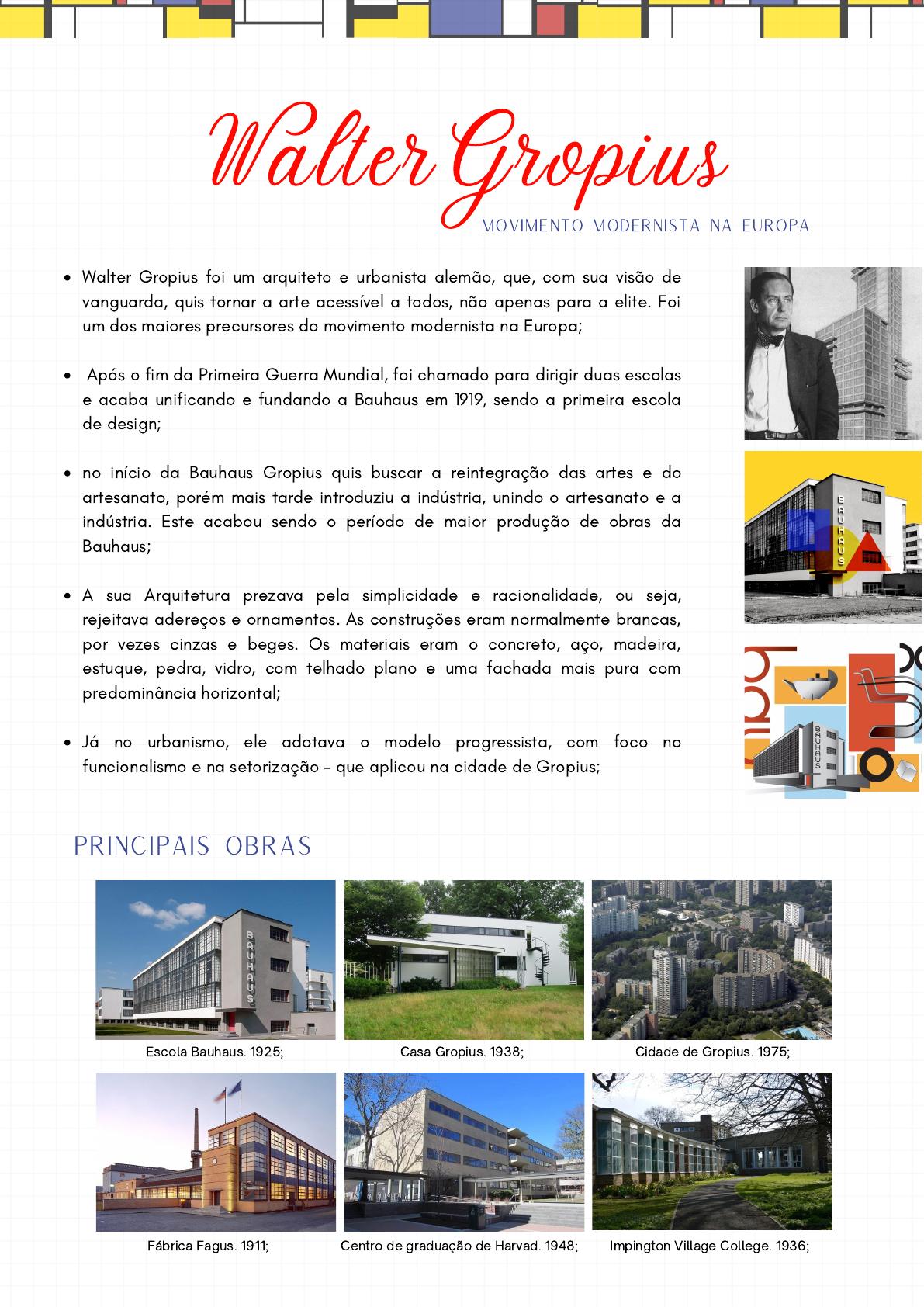 Walter Gropius foi um arquiteto e urbanista alemão, que, com sua visão de vanguarda, quis tornar a arte acessível a todos, não apenas para a elite. Foi um dos maiores precursores do movimento modernista na Europa; Após o fim da Primeira Guerra Mundial, foi chamado para dirigir duas escolas e acaba unificando e fundando a Bauhaus em 1919, sendo a primeira escola de design; no início da Bauhaus Gropius quis buscar a reintegração das artes e do artesanato, porém mais tarde introduziu a indústria, unindo o artesanato e a indústria. Este acabou sendo o período de maior produção de obras da Bauhaus; A sua Arquitetura prezava pela simplicidade e racionalidade, ou seja, rejeitava adereços e ornamentos. As construções eram normalmente brancas, por vezes cinzas e beges. Os materiais eram o concreto, aço, madeira, estuque, pedra, vidro, com telhado plano e uma fachada mais pura com predominância horizontal; Já no urbanismo, ele adotava o modelo progressista, com foco no funcionalismo e na setorização - que aplicou na cidade de Gropius; WalterGropius movimento modernista na Europa Principais Obras Escola Bauhaus. 1925; Fábrica Fagus. 1911; Cidade de Gropius. 1975; Casa Gropius. 1938; Centro de graduação de Harvad. 1948; Impington Village College. 1936;