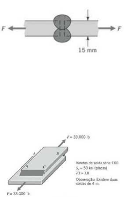 Disciplina: Elementos de Máquinas – CCE0158 Exercícios Fixação: Juntas Soldadas Os dados de tensão dos eletrodos estão apresentados na última página da lista. Exercício 1: Duas placas de aço de 15 mm com Sy= 400 MPa são soldadas de topo utilizando varetas da série E70 e a boa prática de soldagem. O comprimento da solda é de 90 mm. Qual é a carga de tração máxima que pode ser aplicada? Exercício 2: As duas placas de aço com s, = 50 ksi mostradas na figura são unidas por filetes de soldas carregados transversalmente. Cada uma das soldas possui 4 in de comprimento. Varetas de solda da série E60 são utilizadas. Qual é a menor dimensão h da solda a ser utilizada se uma força de 33.000 lb deve ser aplicada? Exercício 3 Duas placas de aço com Sy= 50 ksi são unidas por filetes de solda de 3/8 in carregados paralelamente, conforme mostrado na figura. Varetas de solda da série E60 são utilizadas. Cada uma das soldas possui 3 in de comprimento. Qual é a maior carga de tração que pode ser aplicada? Exercício 4 As duas placas de aço com Sy = 400 MPa mostradas na figura são unidas por filetes de soldas carregados transversalmente. Cada uma das soldas possui 100 mm de comprimento. Varetas de solda da série E70 são utilizadas, e a boa prática de soldagem é seguida. Qual é a menor dimensão h da solda a ser utilizada se uma força de I 50 kN deve ser aplicada. Exercício 5 O suporte mostrado na figura abaixo deve sustentar uma carga total de60 kN. Cada placa possui duas soldas de 75mm e uma de 100mm. Utilizando varetas de solda da série E60 qual a dimensão da solda a ser especificada? Exercício 6 O suporte mostrado na figura sustenta uma carga de 4000 lb. O filete de solda se estende por todo o comprimento de 4 in em ambos os lados. Qual é a dimensão da solda se varetas da série E60 forem utilizadas? Exercício 7 Uma barra de aço de ¾ in de espessura, para ser usada como viga, é soldada a um suporte vertical usando duas soldas de filete, como ilustrado abaixo. Encontre a força de flexão F segura se a tensão permissível de cisalhamento nas soldas for de 20 ksi. Foram utilizados dois cordões de solda de comprimento 2 in. Exercício 8 Encontre a tensão máxima de cisalhamento na garganta do metal de solda na figura. Exercício 9 A conexão mostrada suporta uma carga de flexão de 3 kip. O vão a deve ser de 6 in. A carga é uma carga estática de 3000 Ibf. Especifique a soldagem (dê o padrão, o número de eletrodo, o tipo de solda, o comprimento de solda e o tamanho de perna). Exercício 10 A conexão mostrada na figura é feita de aço 1018 laminado a quente de ½ in de espessura. A força estática é de 25 kip. Especifique a soldagem (dê o padrão, o número do eletrodo, o tipo de solda, o comprimento de solda e o tamanho de perna). Dados de tensão dos eletrodos: Valores dentro dos parênteses tensão em MPa; Valores fora dos parênteses tensão em ksi;