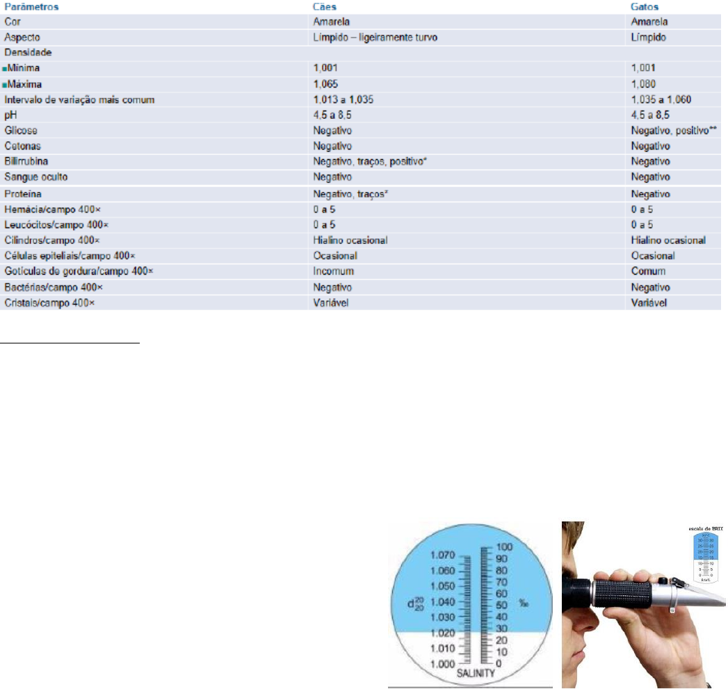 Urinálise Urinálise – Físico Químico Sedimento Cães e gatos – Aspecto físico da urina: Volume Cor Odor Aspecto Densidade COR – -Amarelo citrino (amarelo mais voltado pro verde) -Amarelo palha (claro) -Amarelo ouro (forte) -Avermelhado -Âmbar (amarelo tendendo ao marrom) ODOR – •Sui generis (característico) •Fétido •Aliáceo (alho) •Adocicado ASPECTO – pode variar de acordo com a espécie •Límpido (gato) •Ligeiramente turvo (cão) •Turvo (equino) DENSIDADE – calibrar antes (linha azul no zero) Determinada por refratometria -É a parte mais importante do exame físico da urina -Avalia a capacidade dos túbulos renais em concentrar ou diluir urina, portanto, é um teste de função tubular -Apesar da doença renal (desidratação + densidade urinária baixa), devem ser consideradas outras causas da densidade baixa -Associar histórico e exame físico do paciente e resultados de outros exames complementares Valores de referência: Cães: 1,015 – 1,045 Gatos: 1,020 – 1,040 Diluída > (+) água (--) solutos/partículas = Densidade diminui Concentrada > (--) água (+) solutos/partículas = Densidade aumenta Aspecto químico da urina: •pH •Proteína •Glicose •Corposcetônicos •Nitrito •Leucócitos •Sangue oculto •Bilirrubina *exame de sedimento para confirmar a cistite •Sangue oculto •Hematúria •Hemoglobinúria (perda de hemoglobina pela urina; hemólise aguda intravascular) •Mioglobinúria (mioglobina proveniente de lesão muscular) -Leucócitos Inflamação / Infecção (trato urinário inferior) (tiras reagentes não confiável – específico para humanos) – ideal confirmar com o sedimento urinário, pois consegue contar essas células -Nitrito Infecções bacterianas -Bilirrubina Pode indicar enfermidade hepática Outras causas: A bilirrubina conjugada aparecerá na urina se houver um aumento da sua concentração sérica (colestase;) -Glicose A causa mais comum de glicosúria (eliminação de glicose pela urina) é o teor de glicose circulante exceder o limiar tubular renal de reabsorção de glicose •Hiperglicemia - DIABETES MELITO •Avaliação da glicose na urina deve ser realizada simultaneamente à avaliação de glicose no sangue (glicosímetro; bioquímico (plasma) – tubo tampa cinza (fluoreto de sódio) •Glicosúria sem hiperglicemia: Nefropatias, Intoxicações – Medicamentos (aminoglicosídeos) Estresse intermitente Obs : Administração de fluídos que contém glicose -Cetonas / Corpos cetônicos Frequentemente acompanha casos avançados de diabetes melito •Resultado da acelerada oxidação de ácidos graxos como fonte de energia •O teste de tira reagente para cetona pode detectar acetona e ácido cetoacético, mas não detecta um outro tipo de corpo cetônico, o ácido B-hidroxibutírico -Proteína Uma pequena quantidade de proteínas atinge o filtrado glomerular, mas é reabsorvida pelos túbulos renais •Proteinúria leve e transitória •Febre, exercício muscular e estress •Obs : Sedimento ativo hemácias , leucócitos ,bactérias (quadro mais severo) Relação proteína creatinina urinária – -Exame químico da urina - Proteína -A proteinúria renal ocorre como resultado de uma permeabilidade glomerular anormal -Relação PU:CU (Proteína urinária : Creatinina urinária) -Não faz parte da urinálise -Relação maior do que 1,0 indica doença renal Obs: Usar sobrenadante da amostra após centrifugar Exame de sedimento urinário – ˃ Células ˃ Cristais ˃ Cilindros ˃ Leucócitos ˃ Hemácias ˃ Bactérias ˃ Muco ˃ Espermatozoides Epiteliais de descamação / trato urinário inferior = normal em quantidade adequada Epitélio renal / Pelve renal / “Globosas” / Neoplásicas (Carcinoma de células de transição) = preocupante Carcinoma de células de transição = mais comum no trígono vesical *Células de descamação = irregulares -Trígono vesical (descamação) -Pelve renal Filtração glomerular – Urina = ultra filtrado do plasma *Estruturas circulares/cilíndricas e proteicas de túbulos distais/ductor coletor (forma) excesso de escamação *hialino = não tem muita significância clínica; indivíduos normais as vezes tem; mais difícil de ser visualizado Cristais: Oxalato de cálcio * Fosfato triplo (estruvita) * Bilirrubina Carbonato de cálcio Fosfato / Urato amorfo Biurato de amônia *mais comuns Normal = 2 leucócitos/hemácias por campo Outros – Impregnação por bilirrubina Espermatozóides Ovos de parasitas Dioctophyma renale Relação proteína urinária : creatinina urinária – PU:CU < 1 Normal (média 0,5) 1 > PU:CU > 5 Pré glomerular Glomerular leve Pós glomerular (sedimento inativo) 5 > PU:CU > 13 Pós glomerular severa Glomerulonefropatia PU:CU > 13 Glomerulonefropatia severa Urinálise nas diferentes espécies = equinos, bovinos, ovinos e caprinos - Uremia ou síndrome urêmica = quando temos um conjunto de sinais e sintomas que caracterizam realmente as manifestações sistêmicas oriundas de um mal funcionamento renal; comprometimento não só da função renal, mas sistêmico; achado laboratorial = azotemia SDMA = indicador bastante sensível para detectar doença renal (40% da função renal); *creatinina só aumenta depois de 75% de comprometimento da função renal Exames complementares – -Urinálise, Urinálise, urocultura, relação proteína creatinina urinária -Cateterização vesical -Técnicas para diagnóstico por imagem Radiografia abdominal simples ou contrastada Urografia excretora, uretrocistografia Tomografia computadorizada, biopsia renal (?) -Provas de função renal (ureia, creatinina, SDMA) -Biopsia Outros: pressão arterial, eletrólitos •SDMA (Dimetilarginina simétrica) não é afetado pela perda de massa corporal magra •Valor de Referência: 9 a 14 (μg/dL) •Prazo: 2-5 dias úteis, $100,00 •SDMA aumenta, em média, com 40 % de perda de função renal enquanto a creatinina não aumenta até 75 % da função renal 