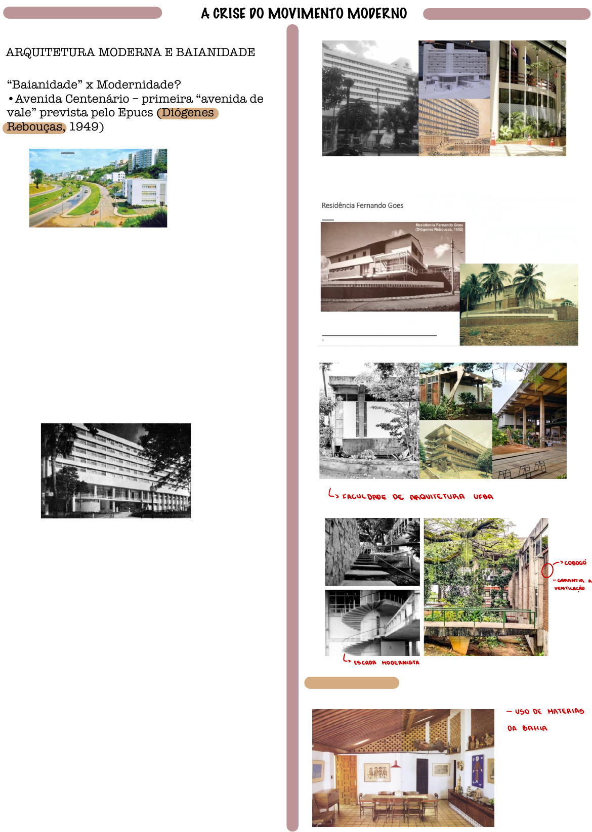 A CRISE DO MOVIMENTO MODERNO ARQUITETURA MODERNA E BAIANIDADE “Baianidade” x Modernidade? •Avenida Centenário – primeira “avenida de vale” prevista pelo Epucs (Diógenes Rebouças, 1949) Diógenes foi a figura chave da modernização da cidade de Salvador que seguirá os pretextos modernistas. - Atualizar a cidade, no sentido de desenvolvimento e progresso dos eixos de crescimento da cidade. Integração das artes: Arquitetura “carioca” + arte “baiana” Hotel da Bahia (Diógenes Rebouças + Paulo Antunes Ribeiro, 1947-51) •“Um dos mais característicos da Escola brasileira”, que “demonstra em que sentido evolui uma concepção arquitetônica amplamente influenciada na sua origem pelas diretrizes de Le Corbusier. •Os arquitetos brasileiros compreenderam a necessidade de enriquecer seu vocabulário plástico; o volume rigoroso de um paralelepípedo com fachadas definidas por linhas calmas e denunciando um caráter funcional, se move com um vigo e uma elegância perfeitos sobre uma base que pretende provocar na visão do pedestre uma sensação de leveza e de audaciosa fantasia, sem que seja ultrapassada, contudo, a estrita ‘medida’ além da qual o humanismo arrisca se transformar. - piloti, pé direito duplo, as curvas Gilbert Chaves •Residência Jorge Amado ↳ FACULDADE DE ARQUITETURA UFBA → COBOGÓ - GARANTIR A VENTILAÇÃO ↳ ESCADA MODERNISTA - USO DE MATERIAS DA BAHIA Assis Reis • Assis Reis (1986, p. 47) abordaria o tema do compromisso cultural presente na sua obra nos seguintes temos: (...) a soma das diversas culturas no nosso extenso território poderá provocar um sadio dissenso que em determinadas ocasiões e momentos refletirá um consenso dinâmico. Essa noção de identidade cultural defendo como condição do fortalecimento do nosso trabalho, calcado na expressão da nossa realidade local, como substrato para o grande mosaico da cultura brasileira e da sua própria identidade. Para Assis Reis, a sua arquitetura poderia ser caracterizada como uma arquitetura regional, que é “aquela que tem por característica principal a capacidade de traduzir, dentro de um grau de contemporaneidade, os aspectos históricos, cultuais e materiais de uma região” Lucinei Caroso •Trabalhou em Paris com Philippe Starck e Jean Nouvel entre 1984 e 1990 Lina Bo Bardi Fernando Peixoto João Filgueiras Lima - Lélé > MANTEVE O MAR DE TELHAS = CONJUNTO ~ REMOVEU, CRIOU UM PÁTIO ( > PROJETO DO MAM - DEFENDIA UMA ARQUITETURA REGIONAL : MATERIAIS , CONTEXTO HISTÓRICO E CULTURAIS , QUE EIXO HISTÓRICO QUE VIEMOS E O L> NÃO TEM UM PREGO = ALEGORIA DO CARRO DE BOI (TRADIÇÃO BAHIANA) QUE PODEMOS PROPOR A PARTIR DISSO , SEM PRECISAR INFERIR A * DISSEMINOU A CULTURA BAHIANA PELO BRASIL BAHIANIDADE . > AS CORES E FORMAS → ARQUITETURA VERNACULAR REPRESENTAM A CULTURA ~ > INSERIR COR NOS EDIFÍCIOS BAHIANA (AXÉ MUSIC . . . ) → OLHAR AS CORES , SEM PILOTIS • ARQUITETURA MAIS CONTEM- n PORANEA + HOSPITAL SARA + IGREJA DO CENTRO ADMINISTRATIVO DA BAHIA Arilda Cardoso OSCAR NIEMEYER 1907 – 2012 Essa preocupação de criar beleza é, sem dúvida, uma das características mais evidentes do ser humano, em êxtase diante desse universo fascinante em que vive. CONJUNTO DA PAMPULHA - 1942 – 1944 •E Pampulha surgiu com suas formas diferentes, suas abóbadas variadas, com as curvas da marquise da Casa de Baile a provocarem os tabus presentes. BRASÍLIA 1957 Mas foi em Brasília que minha arquitetura se fez mais livre e rigorosa. Livre, no sentido da forma plástica; rigorosa, pela preocupação de mantê-la em perímetros regulares e definidos. (...) minha preocupação foi em caracteriza-la com as próprias estruturas, afinando os apoios com o objetivo de tornar os palácios mais leves, como que simplesmente tocando o chão, e incorporei a arquitetura ao sistema estrutural. A História • Em 1956 o então presidente Juscelino Kubitschek começa o plano de construir a nova capital brasileira. • Com o objetivo de planejar e executar estavam Oscar Niemeyer, a mente que daria as formas curvas e perfeitas dos prédios oficiais, e Lúcio Costa, o homem do plano urbanístico em forma de avião. • Em 15 de março de 1956 o presidente criou a Companhia Urbanizadora da Nova Capital (NOVACAP). O engenheiro Israel Pinheiro foi indicado como presidente da companhia e o arquiteto Oscar Niemeyer imediatamente começou a elaborar projetos para os primeiros edifícios, como o Catetinho, o Palácio da Alvorada e o Brasília Palace Hotel. • Um dos primeiros esboços para a planta urbana de Brasília, elaborado pela Comissão para Localização da Capital Federal em 1954, quando havia a proposta de chamá-la de Vera Cruz. • O nome Plano Piloto não tem a ver com o formato de um avião. Todos os projetos apresentados no concurso público chamavam- se Plano Piloto de Brasília. • Lúcio Costa defendeu a tese de que a Capital Federal pudesse ser comparada a uma borboleta, rejeitando a comparação com um avião. • Niemeyer buscou a criação de formas claras, leves, simples, livres, nobres e belas, sem considerar apenas seu aspecto funcional. Como disse, ao se referir aos palácios e edifícios oficiais. •"Não há arquitetura sem tecnologia" é uma das mais conhecidas definições de Oscar Niemeyer, o mais dedicado defensor do uso do concreto armado, um dos primeiros a utilizá-lo em formas curvas. ↳ ACADEMIA VILA FORMA - HÁ INVENÇÃO DE LE CORBUSIER( > HOTEL CATHARINA PARAGUASSU •CONGRESSO NACIONAL •Os dois edifícios anexos à Câmara e ao Senado, com 28 andares cada um, usaram aço importado dos Estados Unidos. •Estruturando o desenho urbano em torno de dois eixos monumentais dispostos em cruz, seu projeto definiu áreas específicas para cada tipo de uso: residencial, administrativo, comercial,industrial, recreativo,cultural, e assim por diante. • Brasília foi construída em três anos, pelo menos seus principais prédios. • À medida que a cidad