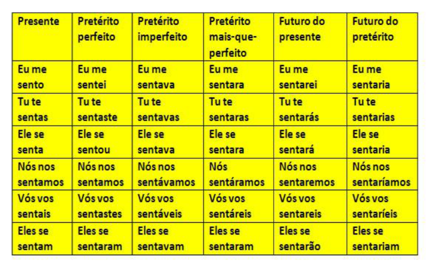 Verbos pronominais Dadas as particularidades as quais norteiam a classe em questão – ora representada pelos verbos – faz-se necessário que estejamos atentos a todas elas. E por elas ressaltar, há que se enfatizar sobre um desses tantos pormenores, ou seja, o fato de alguns verbos serem considerados pronominais. Mas, afinal, tal característica é resultante de que aspecto? Pois bem, os chamados verbos pronominais são aqueles que, necessariamente, são acompanhados de um pronome oblíquo (adequado à respectiva pessoa gramatical), pelo fato de denotarem ações próprias do sujeito, como é o caso dos verbos: arrepender-se, sentar-se, queixar-se, zangar-se, pentear-se, enganar-se, entre muitos outros. Mediante tais postulados, analisemos a conjugação referente ao verbo sentar-se, no intuito de verificarmos acerca dos traços que lhe são peculiares. Vejamo-lo, portanto: Modo subjuntivo Modo imperativo Fonte: http://www.portugues.com.br/gramatica/morfologia.html Por: Vânia Maria do Nascimento Duarte