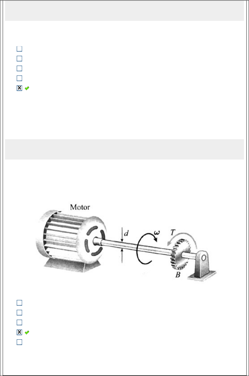 1 Questão Uma barra circular vazada de aço cilíndrica tem 1,5 m de comprimento e diâmetros interno e externo, respectivamente, iguais a 40 mm e 60 mm. Qual o maior torque que pode ser aplicado à barra circular se a tensão de cisalhamento não deve exceder 120 MPa? 5,12 KN.m 2,05 KN.m 6,50 KN.m 3,08 KN.m 4,08 KN.m Respondido em 10/09/2021 09:47:38 Explicação: Resposta 4,08 KN.m 2 Questão Um motor rotacionando um eixo circular maciço de aço transmite 30 kW para uma engrenagem em B. A tensão de cisalhamento admissível no aço é de 42 Mpa. Qual é o diâmetro necessário do eixo se ele é operado a 500 rpm? 20,5 mm 0,0205 mm 0,0411 mm 41,1 mm 0,0205 m Respondido em 10/09/2021 09:47:43 Explicação: 3 Questão Um motor rotacionando um eixo circular maciço de aço transmite 30 kW para uma engrenagem em B. A tensão de cisalhamento admissível no aço é de 42 Mpa. Qual é o diâmetro necessário do eixo se ele é operado a 4.000 rpm? 0,02055 mm 10,27 mm 0,01027 mm 41,1 mm 20,55 mm Respondido em 10/09/2021 09:47:49 Explicação: 4 Questão Uma barra homogênea de comprimento L = 1,0 m e seção reta quadrada, de lado 2,0 cm, está submetida a uma tração de 200kN. O material da barra possui módulo de elasticidade de 200GPa. Qual o valor da deformação da barra, considerando que se encontra no regime elástico? 2,5cm 0,25mm 25mm 25cm 2,5mm Respondido em 10/09/2021 09:47:51 5 Questão Sobre o fenômeno da torção em um tubo quadrado de paredes fina de comprimento L, área média Am , espessura t e módulo de cisalhamento G, pode-se afirmar que: A tensão de cisalhamento média aumenta com o aumento da área média; A tensão de cisalhamento média diminui com o aumento da espessura de parede do tubo; O ângulo de torção diminui com a redução da área média do tubo; O ângulo de torção aumenta com uma redução do comprimento L do tubo; A tensão de cisalhamento média diminui com o aumento do torque aplicado; Respondido em 10/09/2021 09:48:15 6 Questão Um eixo tubular vazado possui diâmetro interno de 3,0cm e diâmetro externo de 42mm. Ele é usado para transmitir uma potência, por meio de rotação, de 90000W as peças que estão ligadas as suas extremidades. Calcular a frequência de rotação desse eixo, em Hertz, de modo que a tensão de cisalhamento não exceda 50MPa. 35,5 Hz 30,2 Hz 42 Hz 31 Hz 26,6 Hz Respondido em 10/09/2021 09:47:56 Explicação: f = 26,6 Hz 7 Questão Considere um eixo maciço e homogêneo com seção circular de raio 30 cm. Sabe-se que este eixo se encontra em equilíbrio sob a ação de um par de torques T. Devido a ação de T, as seções internas deste eixo estão na condição de cisalhamento. Se, na periferia da seção, a tensão de cisalhamento é de 150 MPa, determine a tensão de cisalhamento, nesta mesma seção circular, a uma distância de 20 cm do centro. Nula Não existem dados suficientes para a determinação 50 MPa 150 MPa 100 MPa Respondido em 10/09/2021 09:48:03 Explicação: A variação da tensão de cisalhamento é linear. Assim, 100/150 = 2/3 e, portanto, 2/3.(150) = 100MPa 8 Questão Seja uma barra de aço com seção transversal circular de diâmetro 20 cm e comprimento 21 m, está submetido a um momento torsor de 1000 kN.m. Determine a rotação entre os dois extremos do eixo(ângulo de torção). Dados: G = 50 GPa; PI = 3 ; 1,98 rad 1,37 rad 2,37 rad 2,8 rad 2,1 rad Respondido em 10/09/2021 09:48:08