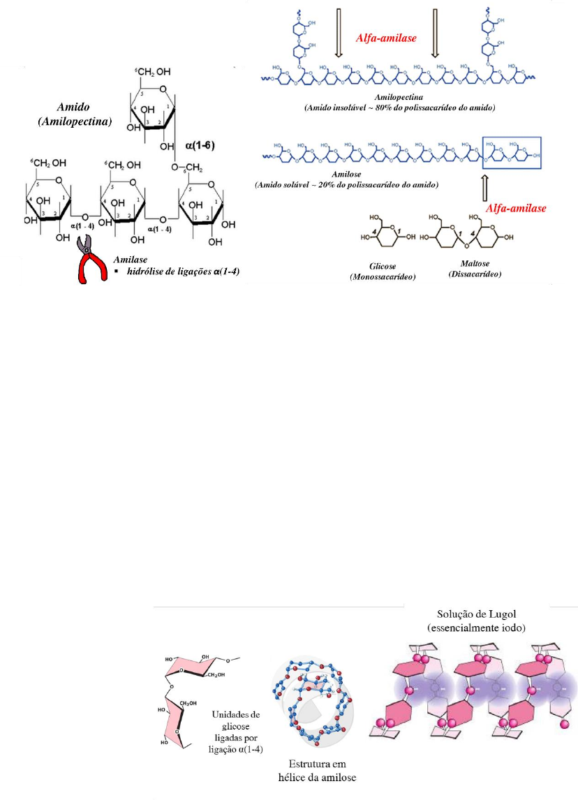 AULA PRÁTICA BIOQUÍMICA - 2019 DETERMINAÇÃO DA ATIVIDADE DA AMILASE SALIVAR A) Introdução A amilase é uma hidrolase que tem a função de degradar carboidratos. Ela é predominantemente produzida pelas glândulas parótidas e pâncreas. A digestão do amido tem início na boca por ação da enzima α-amilase salivar, conhecida também por ptialina, que hidrolisa as ligações (14) das cadeias do amido, produzindo glicose, maltose e oligossacarídeos. Figura 1. Hidrólise do amido pela enzima amilase. A α-amilase salivar é uma enzima unida ao cálcio que inicia a digestão do amido na cavidade oral. Os genes da α-amilase estão localizados em um cluster no cromossomo que inclui os genes da amilase salivar (AMY1), dois genes da α-amilase pancreática (AMY2A e AMY2B) e um pseudogene relacionado. Os genes AMY1 demonstram extensa variação do número de cópias que é diretamente proporcional ao teor da α-amilase salivar na saliva. A quantidade de α-amilase é também influencida por outros fatores, tais como estado de hidratação, nível de estresse psicossocial e hábitos alimentares de curto prazo (Santos et al., 2012). Além da função digestiva, a α-amilase salivar liga-se com alta afinidade a um grupo selecinados de estreptococos orais, uma função que pode contribuir para o clearance e nutrição bacteriana. O fato da α-amilase salivar também ser encontrada na película adquirida do esmalte sugere uma função na adesão das bactéricas ligadas a α-amilase salivar. Todas estas atividades biológicas parecem ser dependentes de uma conformação enzimática intacta (Scannapieco et al., 1993). A secreção da α-amilase salivar é influenciada pela regulação adrenérgica do sistema nervoso simpático e pelo eixo hipotálamo-pituitária-adrenal (Granger et al., 2007), por isso tem sido proposto como biomarcador de mudanças relacionados ao estresse no corpo, o qual reflete atividade do sistema nervoso simpático (Nater & Rohleder, 2009). Os níveis de α-amilase salivar também podem servir como um efetivo indicador para a avaliação não-invasiva do estresse físico (Koibuchi & Suzuki, 2014). B) Princípio da Metodologia Para determinação da atividade da amilase salivar será utilizada o método colorimétrico modificado proposto por Caraway (Caraway, 1959), que consiste de uma análise cinética de tempo fixo. Nesta metodologia a amostra de saliva será incubada com o substrato amido. Pela dição do iodo, o amido não hidrolisado adquire coloração azul/preta que diminui proporcionalmente à atividade enzimática, sendo comparado com um controle. Figura 2. Comprovação da presença de amido é feita utilizando-se lugol (coloração castanha), que contém iôdo. C) Objetivos A saliva total é o único fluído do corpo que banha continuamente a mucosa da cavidade oral, orofarínge e laringe. É uma complexa mistura derivada da secreção das glâdulas salivares, fluido gengival e transudato da mucosa oral, em adição ao muco da cavidade nasal e farínge, bactérias orais não-aderentes, restos alimentares, células epiteliais descamadas e células sanguíneas, como também traço de medicamentos e produtos químicos (Humphrey & Williamson, 2001). Trata-se de uma secreção exócrina muco- serosa levemete ácida composta por uma variedade de eletrólitos substâncias orgânicas pequenas, proteínas, péptidos e polinucleótidos. 1º Constatar a ação enzimática da amilase salivar; 2º Fazer correlações com o estado de saúde oral do paciente; D) Materiais Equipamento de Proteção Individual (EPI): Luvas, Máscara, Óculos e Avental – TODOS DEVERÃO USAR! 3 tubos de ensaios Pipeta automática de 10 e 1000 μL Solução de NaCl 0,85% (m/v) Reagente para determinação da amilase salivar Ponteiras 200 e 1000 μL Espectrofotômetro UV/Visível Cubetas de plástico Pisseta com água destilada Papel higiênico macio Descarte Detergente desincrustante Reagente Nº 1 - Contém: Amido 0,4 g/L, Tampão Fosfato (pH 7,0) 100 mmol/L, estabilizante e conservante. Reagente Nº 2 - Contém: Iodo 50 mmol/L e estabilizante. E) Procedimentos 1º Passo: Descongelar a saliva do paciente A alíquota número 1 da saliva total não-estimulada e centrifugada do paciente deverá ser removida do freezer onde encontra-se armazenada à -20 ºC. A amostra deverá ser mantida à temperatura ambiente até o seu completo degelo, quando então deverá retornar ao gelo, sendo mantida no mesmo durante todo a aula prática. O respectivo tubo cônico contendo a saliva deverá ser marcado na tampa com canetinha. Esta marcação indicará que esta amostra já foi descongelada uma vez. 2º Passo: Diluição da saliva em tampão fostato O tubo cônico contendo a saliva deverá ser agitado vigorosamente na intenção de deixar a amostra da saliva homogênea. Tomar um tubo de ensaio e fazer a marcação escrita “Saliva Diluída”. A diluição deverá ser realizada nesse tubo de ensaio. Pipetar 3000 uL (3,0 mL) da solução de NaCl 0,85% e em seguida pipetar 10 μL da saliva. AGITAR VIGOROSAMENTE PARA DEIXAR A AMOSTRA HOMOGÊNEA. Após este passo considerar que a saliva foi diluída 301 vezes. Retornar o tubo de ensaio com a saliva diluída para o gelo. 3º Passo: Marcação dos tubos e pipetagem Para determinação da α-amilase na saliva marcar novamente 2 tubos de ensaio: 1 tubo C (controle) e 1 tubo S (saliva diluída) e proceder como a seguir: Tubo C Tubo S Reagente N° 1 0,5 mL 0,5 mL Colocar os dois tubos banho-maria à 37 °C por 2 minutos Saliva Diluída Não 10 μL Homogeneizar e incubar à 37 °C por exatamente 7 minutos e 30 segundos (cronometrados) – manter no banho-maria Reagente N° 2 0,5 mL 0,5 mL Água destilada 4,0 mL 4,0 mL Zerar o espectrofotômetro com água destilada ou deionizada obtida da pisseta. Homogeneizar bem os tubos e determinar as absorbâncias do Tubo C e do Tubo S em 660 nm. A cor é estável por 30 minutos. 4º Passo: Cálculos Ac = absorbância do controle 