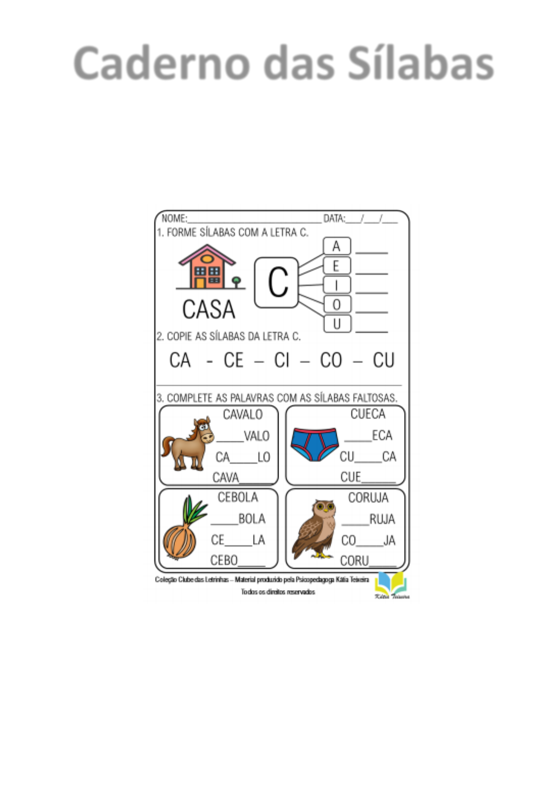 Caderno das Sílabas Coleção Clube das Letrinhas Material produzido pela Psicopedagoga Kátia Teixeira. Revisão Lucas Teixeira Todos os direitos reservados Licenciado para - Silvana Lopes Ferraz - 26477295814 - Protegido por Eduzz.com NOME:__________________________ DATA:___/___/___ 1. VOCÊ SABIA QUE A LETRA A SOZINHA TAMBÉM É UMA SÍLABA. ABELH A A-BE-L HA A 2. COPIE A PALAVRA ABELHA E SEPARE AS SÍLABAS. _________ ____ ____ ____ _______________________________________________ ______ 3. COMPLETE AS PALAVRAS COM AS SÍLABAS FALTOSAS. APITO _____PITO A_____TO API_____ AMORA ____MORA A_____RA AMO_____ Coleção Clube das Letrinhas ANEL _____NEL A______ AVIÃO _____VIÃO A____ÃO AVI_____ Material produzido pela Psicopedagoga Kátia Teixeira. Revisão Lucas Teixeira Licenciado para - Silvana Lopes Ferraz - 26477295814 - Protegido por Eduzz.com NOME:__________________________ DATA:___/___/___ 1. FORME SÍLABAS COM A LETRA B. BOLA B 2. COPIE AS SÍLABAS DA LETRA B. BA - BE – BI – BO – BU _______________________________________________ ______ 3. COMPLETE AS PALAVRAS COM AS SÍLABAS FALTOSAS. BONÉ ______NÉ BO______ BANANA _____NANA BA_____NA BANA_____ Coleção Clube das Letrinhas Licenciado para - Silvana Lopes Ferraz - 26477295814 - Protegido por Eduzz.com BOCA _____CA BO_____ BEBÊ ______BÊ BE______ Material produzido pela Psicopedagoga Kátia Teixeira. Revisão Lucas Teixeira NOME:__________________________ DATA:___/___/___ 1. FORME SÍLABAS COM A LETRA C. CASA C 2. COPIE AS SÍLABAS DA LETRA C. CA - CE – CI – CO – CU _______________________________________________ ______ 3. COMPLETE AS PALAVRAS COM AS SÍLABAS FALTOSAS. CAVALO ____VALO CA____LO CAVA_____ CEBOLA ____BOLA CE____LA CEBO____ Coleção Clube das Letrinhas CUECA ____ECA CU____CA CUE_____ CORUJA ____RUJA CO____JA CORU____ Material produzido pela Psicopedagoga Kátia Teixeira. Revisão Lucas Teixeira Licenciado para - Silvana Lopes Ferraz - 26477295814 - Protegido por Eduzz.com NOME:__________________________ DATA:___/___/___ 1. FORME SÍLABAS COM A LETRA D. DADO D 2. COPIE AS SÍLABAS DA LETRA D. DA - DE – DI – DO – DU _______________________________________________ ______ 3. COMPLETE AS PALAVRAS COM AS SÍLABAS FALTOSAS. DEDO _____DO DE_____ DOCE _____CE DO______ Coleção Clube das Letrinhas DOMINÓ ____MINÓ DO____NÓ DOMI____ DIA ____A DI_____ Licenciado para - Silvana Lopes Ferraz - 26477295814 - Protegido por Eduzz.comMaterial produzido pela Psicopedagoga Kátia Teixeira. Revisão Lucas Teixeira NOME:__________________________ DATA:___/___/___ 1. VOCÊ SABIA QUE A LETRA E SOZINHA TAMBÉM É UMA SÍLABA. ELEFANT E E-LE-FAN -TE E 2. COPIE A PALAVRA ELEFANTE E SEPARE AS SÍLABAS. _________ ___ ___ ___ ___ _______________________________________________ ______ 3. COMPLETE AS PALAVRAS COM AS SÍLABAS FALTOSAS. EMA ____MA E_____ ____TIQUETA E_____QUETA ETI_____TA ETIQUE_____ Coleção Clube das Letrinhas ÉGUA ____GUA É_____ ____LÁSTICO E_____TICO ELÁS____CO ELÁSTI_____ Licenciado para - Silvana Lopes Ferraz - 26477295814 - Protegido por Eduzz.comMaterial produzido pela Psicopedagoga Kátia Teixeira. Revisão Lucas Teixeira NOME:__________________________ DATA:___/___/___ 1. FORME SÍLABAS COM A LETRA F. FOCA F 2. COPIE AS SÍLABAS DA LETRA F. FA - FE – FI – FO – FU _______________________________________________ ______ 3. COMPLETE AS PALAVRAS COM AS SÍLABAS FALTOSAS. FADA ____DA FA_____ FIGO _____GO FI______ Coleção Clube das Letrinhas FACA _____CA FA_____ FEIJÃO ____JÃO FEI____ Material produzido pela Psicopedagoga Kátia Teixeira. Revisão Lucas Teixeira Licenciado para - Silvana Lopes Ferraz - 26477295814 - Protegido por Eduzz.com NOME:__________________________ DATA:___/___/___ 1. FORME SÍLABAS COM A LETRA G . GATO G 2. COPIE AS SÍLABAS DA LETRA G. GA - GE – GI – GO – GU _______________________________________________ ______ 3. COMPLETE AS PALAVRAS COM AS SÍLABAS FALTOSAS. GALINHA ____LINHA GA____NHA GALI_____ GOIABA ____ABA GOI___BA GOIA____ Coleção Clube das Letrinhas GIRAFA _____RAFA GI_____FA GIRA_____ GORILA ____RILA GO____LA GORI_____ Licenciado para - Silvana Lopes Ferraz - 26477295814 - Protegido por Eduzz.comMaterial produzido pela Psicopedagoga Kátia Teixeira. Revisão Lucas Teixeira NOME:__________________________ DATA:___/___/___ 1. FORME SÍLABAS COM A LETRA H. H HIPOPÓTAMO 2. COPIE AS SÍLABAS DA LETRA H. HA - HE – HI – HO – HU _______________________________________________ ______ 3. COMPLETE AS PALAVRAS COM AS SÍLABAS FALTOSAS. HÉLICE _____LICE HÉ_____CE HÉLI_____ HORA _____RA HO______ Coleção Clube das Letrinhas Licenciado para - Silvana Lopes Ferraz - 26477295814 - Protegido por Eduzz.com HORTA _____TA HOR_____ HIENA _____ENA HI_____NA HIE______ Material produzido pela Psicopedagoga Kátia Teixeira. Revisão Lucas Teixeira NOME:__________________________ DATA:___/___/___ 1. VOCÊ SABIA QUE A LETRA I SOZINHA TAMBÉM É UMA SÍLABA. ILHA I-LHA I 2. COPIE A PALAVRA ILHA E SEPARE AS SÍLABAS. _________ ____ ____ _______________________________________________ ______ 3. COMPLETE AS PALAVRAS COM AS SÍLABAS FALTOSAS. IGREJA ____GREJA I_____JA IGRE_____ IOIÔ _____IÔ IO_____ Coleção Clube das Letrinhas IATE ____ATE IA____ IA______ IGUANA ____GUANA I_____NA IGUA_____ Licenciado para - Silvana Lopes Ferraz - 26477295814 - Protegido por Eduzz.comMaterial produzido pela Psicopedagoga Kátia Teixeira. Revisão Lucas Teixeira NOME:__________________________ DATA:___/___/___ 1. FORME SÍLABAS COM A LETRA J. JACARÉ J 2. COPIE AS SÍLABAS DA LETRA J. JA - JE – JI – JO – JU _______________________________________________ ______ 3. COMPLETE AS PALAVRAS COM AS SÍLABAS FALTOSAS. JANELA ____NELA JA_____LA JANE_____ JIPE _____PE JI_____ Coleção Clube das Letrinhas Licenciado para - Silvana Lopes Ferraz - 26477295814 - Protegido por Eduzz.com JABUTI ____BUTI JA____TI JABU____ JACA ____CA JA_____ Material produzido pela Psicopedagoga Kátia Teixeira. R