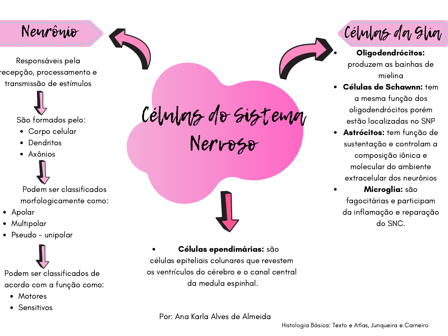Apolar Multipolar Pseudo - unipolar Podem ser classificados morfologicamente como: Células do Sistema Nervoso Neurônio Responsáveis pela recepção, processamento e transmissão de estímulos Corpo celular Dendritos Axônios São formados pelo: Motores Sensitivos Podem ser classificados de acordo com a função como: Células da Glia Oligodendrócitos: produzem as bainhas de mielina Células de Schawnn: tem a mesma função dos oligodendrócitos porém estão localizadas no SNP Astrócitos: tem função de sustentação e controlam a composição iônica e molecular do ambiente extracelular dos neurônios Microglia: são fagocitárias e participam da inflamação e reparação do SNC. Células ependimárias: são células epiteliais colunares que revestem os ventrículos do cérebro e o canal central da medula espinhal. Por: Ana Karla Alves de Almeida Histologia Básica: Texto e Atlas, Junqueira e Carneiro