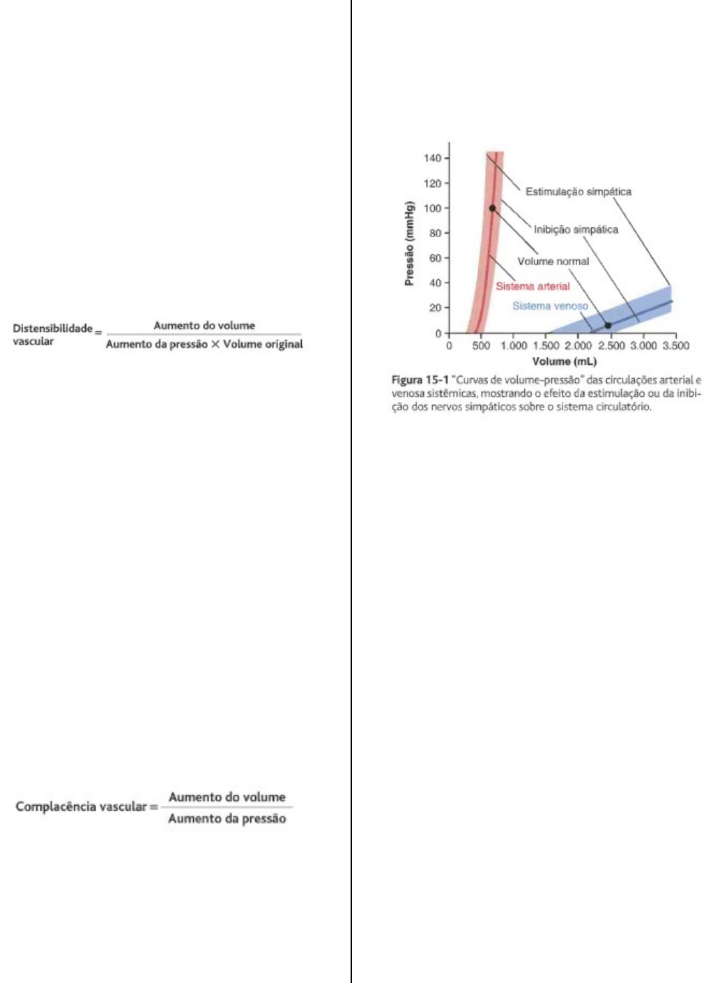 Distensibilidade vascular e funções dos sistemas arterial e venoso Distensibilidade vascular - Todos os vasos sanguíneos são distensíveis e a natureza elástica das artérias permite que acomodem o débito pulsátil do coração, impedindo os extremos de pressão das pulsações. - As veias são por larga margem os vasos ais distensíveis do sistema e por isso elas têm a função de reservatório para armazenamento de sangue. - A distensibilidade vascular é normalmente expressa como a fração de aumento do volume para cada milímetro de mercúrio de aumento da pressão. - Se 1 mmHg fizer com que o vaso que antes continha 10 mililitros de sangue aumente seu volume por 1 mililitro, a distensibilidade é de 0,1 por mmHg, ou 10% por mmHg. Diferenças de distensibilidade das artérias e das veias - Anatomicamente, as paredes das artérias são muito mais fortes que as das veias. Consequentemente, as veias são cerca de 8 vezes mais distensíveis que as artérias, isto é, determinado aumento de pressão provoca aumento oito vezes maior no volume sanguíneo em uma veia que em artéria comparável. Complacência vascular (ou capacitância vascular) - É a quantidade de sangue que pode ser armazenada em determinada região da circulação para cada mmHg de aumento da pressão. - Vaso muito distensível que apresente pequeno volume pode ser muito menos complacente que o vaso muito menos distensível que apresente grande volume, porque a complacência é igual a distensibilidade multiplicada pelo volume. - A complacência de veia sistêmica é cerca de 24 vezes maior que sua artéria correspondente pois é cerca de oito vezes mais distensível e apresenta volume cerca de três vezes maior. Curvas de volume-pressão das circulações arterial e venosa Efeito da estimulação ou da inibição simpática sobre as relações de volume-pressão dos sistemas arterial e venoso - O aumento do tônus da musculatura lisa vascular, causado pela estimulação simpática, aumenta a pressão das artérias ou das veias em cada volume, enquanto inibição simpática diminui a pressão em cada volume. - O aumento do tônus vascular ao longo da circulação sistêmica frequentemente faz com que grande volume de sangue seja desviado para o coração, o que constitui um dos principais métodos que o organismo utiliza para aumentar o bombeamento cardíaco. Isso também é importante nas hemorragias. Complacência tardia (estresse-relaxamento) dos vasos - Significa que o vaso submetido a aumento de volume apresenta logo de início grande aumento da pressão, mas o estiramento tardio progressivo do músculo liso na parede vascular permite que a pressão retorne ao normal dentro de minutos ou horas. Pressão de pulso = débito sistólico / complacência arterial ç - Na imagem, o volume de sangue injetado provoca a distensão elástica imediata da veia, mas então suas fibras musculares lisas começam pouco a pouco a se “engatinhar” (creep) para maior comprimento, e suas tensões diminuem na mesma proporção de modo correspondente. Pulsações da pressão arterial - Cada batimento cardíaco faz com que nova onda de sangue chegue às artérias. Entretanto, normalmente a complacência da árvore arterial reduz os pulsos de pressão, de modo que quase não ocorrer pulsos quando o sangue atinge os capilares; assim, o fluxo sanguíneo tecidual é essencialmente contínuo, com pulsações muito pequenas. - A pressão no pico de cada impulso é chamada de pressão sistólica e é de cerca de 120 mmHg. No ponto mais baixo, pressão diastólica, a pressão é cerca de 80 mmHg. A diferença entre essas duas pressões (40 mmHg) é chamada de pressão de pulso. - A pressão de pulso é afetada por dois fatores principais, que é o débito sistólico cardíaco e a complacência. A ejeção do coração durante a sístole é um fator menos relevante. - Em geral, quanto maior o débito sistólico, maior será a quantidade de sangue que deve ser acomodada na árvore arterial a cada batimento, e, portanto, maiores serão o aumento e a queda de pressão durante a sístole e a diástole, resultando em maior pressão de pulso. - Por sua vez, quanto menor for a complacência do sistema arterial, maior será o aumento da pressão provocado por um dado volume de sangue bombeado em cada batimento para as artérias. Traçados anormais de pressão de pulso - Na estenose valvar aórtica, o diâmetro da abertura da valva aórtica é significativamente reduzido, e a pressão do pulso aórtico fica bastante diminuída em virtude da redução do fluxo sanguíneo que é ejetado pela valva estenótica. - Na persistência do canal arterial (comunica a artéria pulmonar à artéria aorta no feto), a metade ou mais do sangue bombeado para a aorta pelo ventrículo esquerdo flui imediatamente de volta, pelo canal arterial que permanece aberto, para a artéria pulmonar, fazendo com que a pressão diastólica caia para valores muito baixos antes do batimento cardíaco seguinte. - Na insuficiência cardíaca, a valva aórtica está ausente ou não fecha de modo completo. Assim, após cada batimento, o sangue bombeado para a aorta flui imediatamente de volta para o ventrículo esquerdo. Isso resulta em queda da pressão aórtica entre os batimentos cardíacos até atingir o valor zero. Transmissão dos pulsos de pressão para artérias periféricas - Quando o coração ejeta sangue para a aorta durante a sístole, apenas a porção proximal da aorta é distendida inicialmente devido à inércia do sangue. Contudo, o aumento da pressão na aorta supera essa inércia e a onda de distensão é rapidamente transmitida ao longo da aorta. Isso é chamado de transmissão do pulso de pressão para as artérias. - Em geral, quanto maior a complacência de cada segmento vascular, menor será a velocidade, o que explica a lenta transmissão na aorta e a transmissão muito rápida nas artérias distais. - Na aorta, a velocidade de transmissão do pulso de press