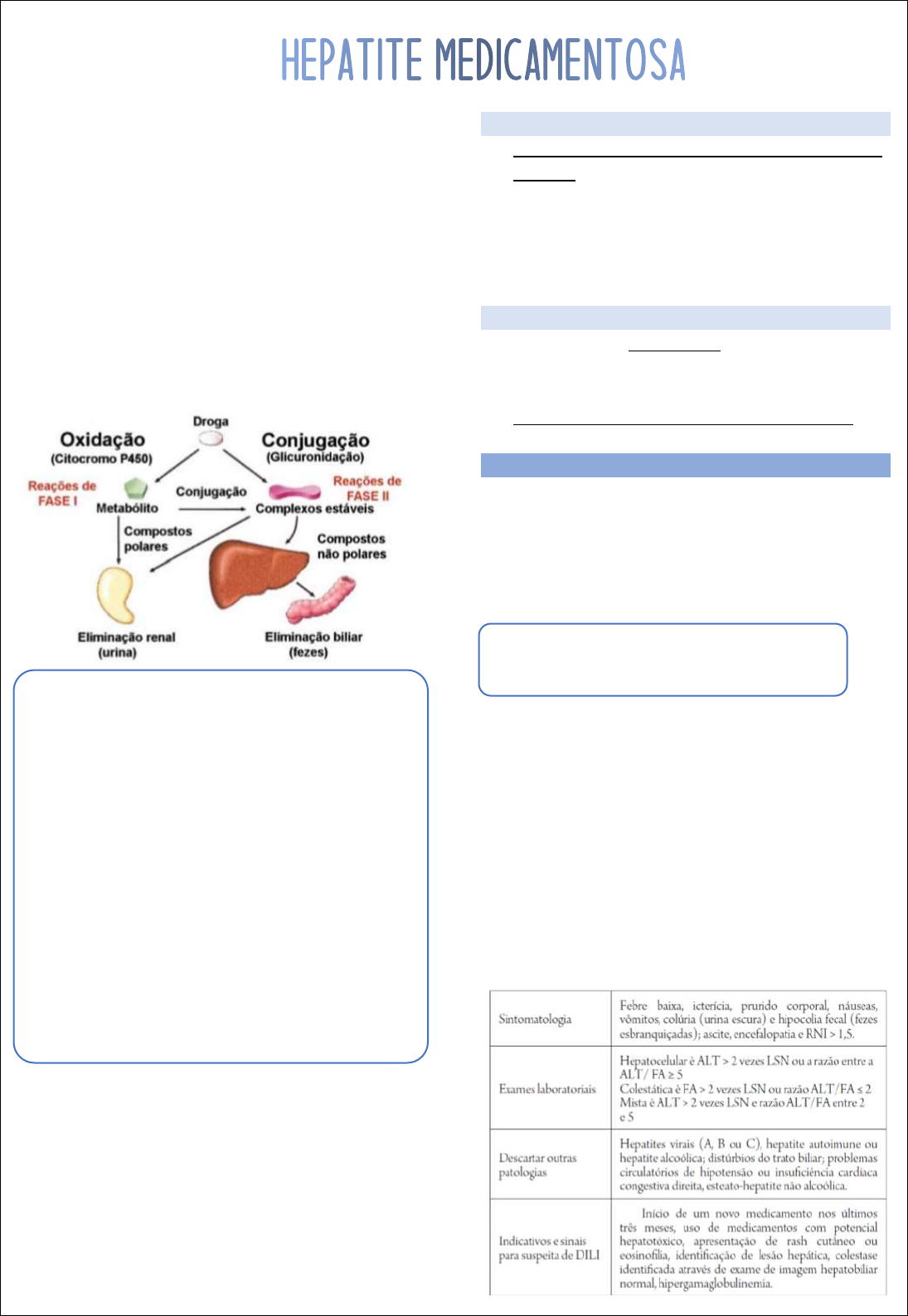 Ana Flávia de Jesus Alves – Medicina Unisalesiano – Laboratório UC 16 → Administração do medicamento em doses usuais a longo prazo. → Ligeira alteração das enzimas hepáticas até a insuficiência hepática fulminante. → Antibióticos, anti-inflamatórios não-esteroides, e anticonvulsivantes são os medicamentos mais frequentes entre os causadores de DILI (hepatite medicamentosa). Antirretrovirais, anticonvulsivantes (tais como o ácido valpróico), analgésicos (como o paracetamol), antibióticos e antineoplásicos são frequentes agentes causadores de DILI com grande fatalidade. O fármaco vai sofrer processo de metabolismo, vai ser absorvido e distribuído. Durante esse processo ocorre a formação dos metabólitos, os quais podem ser mais potentes, porém tóxicos para o nosso organismo. As drogas podem sofrer oxidação (reação de fase I do metabolismo, onde são formados a maioria dos compostos que causam a toxicidade) ou conjugação (fase 2, na qual deixo a molécula, os compostos maiores e mais estáveis). Ele pode ser eliminado pela urina ou pelas fezes, é por isso que podemos ver danos renais e hepáticos. Fase 1: Formação dos metabólitos tóxicos → Citocromo P450. Fase 2: glicuronização ou sulfatação ou inativação da glutationa. As substâncias hepatotóxicas podem lesar os hepatócitos diretamente, através de radicais livres ou metabólitos que causam peroxidação dos lipídeos da membrana. → A toxicidade hepática induzida por medicamentos pode manifestar-se através de reações diretas ou idiossincrásicas. Direta → Previsível em indivíduos expostos e é dependente da dose (o aumento da dose causa a hepatite medicamentosa). → O período latente entre a exposição e a lesão hepática é curto (habitualmente horas), embora as manifestações clínicas possam instalar-se até 24 a 48 horas. Idiossincrásicas → Manifestam-se tardiamente. → Período de latência que varia entre 5 e 90 dias depois da administração do medicamento. → Não está relacionada com o aumento de dose. Grupo de risco O período de tempo entre o consumo de determinado medicamento e a toxicidade hepática, bem como a dose necessária para produzir lesão hepática é, geralmente, consistente de pessoa para pessoa. • A toxicidade hepática pode passar despercebida até o início da icterícia. Grupos de maior risco: pacientes com AIDS, tuberculose, doença hepática prévia, alcoolismo, diabetes, crianças, idosos, gestantes. A detecção rápida e precisa é fundamental! → A evolução no tempo da lesão e avaliar possíveis causas alternativas (hepatite viral aguda A,B,ou Hepatite autoimune ou hepatite alcoólica); → Considerar a ocorrência de DILI em pessoas com doença de fígado pré-existente, como uma patologia sobrepostas. → Doenças concomitantes como infecção pelo vírus da imunodeficiência humana, alcoolismo, diabetes e obesidade devem ser valorizadas, pois podem comprometer negativamente a evolução. Ana Flávia de Jesus Alves – Medicina Unisalesiano – Laboratório UC 16 As principias drogas relacionadas com lesão hepática sintomática são: o Paracetamol 17% o Antirretrovirais 17% o Anticonvulsivantes 10% o Quimioterápicos 12% o Antibióticos 9% o Agentes anestésicos 5% o Tuberculostáticos 3% o Diclofenaco 3% Tratamento O tratamento da lesão hepática induzida por medicamentos é essencialmente de suporte. → Suspender o medicamento suspeito • No caso de toxicidade por paracetamol, pode -se administrar N-acetilcisteína. • No caso de toxicidade por Valproato pode- se administrar carnitina. • No caso de toxicidade pela colestase, estuda-se o uso do ácido ursodesoxicólico. → Uso de corticoides tem sido preconizado em situações especiais (doença hepática grave, colestase com fenômenos de hipersensibilidade ou autoimunidade). Paracetamol (acetaminofen) → Tem potencial de alergia menor, porém é extremamente hepatotóxico. Metabolismo: da sulfatação e da glucoronização. Pequena percentagem sofre metabolismo que gera um composto eletrolítico reativo (NAPQI, ou N-acetil- p-benzoquinone imina). o O NAPQI é extremamente danoso para o fígado. Doses supraterapêuticas : vias metabólicas saturadas, levando a maior parte da metabolização para a oxidação. → Quando você utiliza uma dose de paracetamol acima da doce terapêutica, ocorre a saturação do organismo, o qual desvia, fazendo com que o metabolismo forme mais o NAPQI. → Quando o NAPQI se acumula acaba por se ligar a moléculas proteicas do hepatócito, causando lesão direta. → Toxicidade também determinada pela regulação da síntese de glucídio. TOXICIDADE DOSE DEPENDENTE E PREVISÍVEL. É segura em doses terapêuticas. Antídoto: N- Acetilcisteína. → O antídoto, N-Acetilcisteína repõe os estoques de glutationa hepática, aumentando a conjugação desta substância a NAPQI e sua consequente destoxificação. A glutationa gruda na NAPQI e diminua a toxicidade, Nessa imagem mostra o paracetamol , a enzima que metaboliza ele , e quando ele é metabolizado parte da sua metabolizaçã o (FASE 2) ele forma os metabólicos, atraves da glucoronização ou fulfatação . Grande parte da metabolização é para essa via , porém , um pouco , forma o metabólito NAPQI (o qual é tóxico, causando dano hepático ). Aumento da dose de paracetamol faz com que o organismo não consiga metabolizar rapidamente e formar para o lado da glucorinização , ele fica saturado e desvia para a via que forma o NAPQI. Alguns fatores que aumentam a formaçã de NAPQI, exemplo: overdose, jejum , álcool e isoniazida. AAS – Ácido Acetil Salicílico Os primeiros dados da literatura de hepatotoxicidade do AAS são da década de 70 com descrições de alterações hepáticas de aparecimento agudo, leve e reversível. → A hepatotoxicidade é dose-dependente, com níveis superiores a 25 mg/100 mL e tempo dependente. Resolução: → Não há vantagem de subs